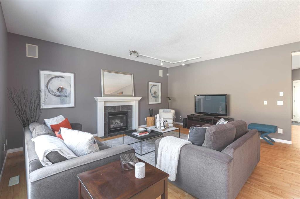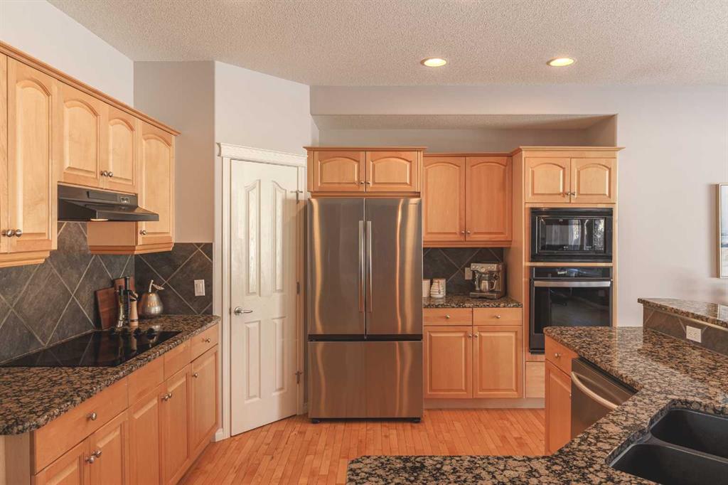 The bright and functional main floor features maple hardwood flooring, 9 ft ceilings, rounded corners, and large windows that fill the home with natural light. The expansive and inviting great room is centered around a cozy gas fireplace, creating a comfortable space for relaxing or gathering with family and friends. The kitchen offers generous counter space, granite countertops, a large eating bar, cooktop, built-in oven and microwave, and a sunny dining area with a charming bay window overlooking the backyard. A new Samsung refrigerator with beverage centre completes the well-equipped kitchen.