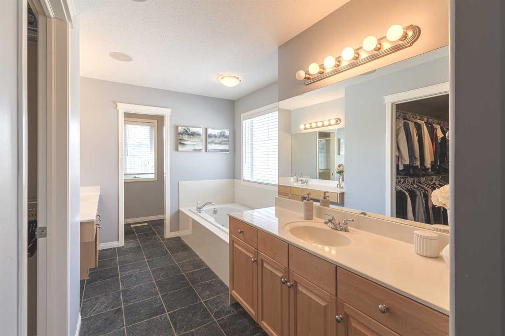 Upstairs, a versatile loft/bonus area provides an ideal space for a home office, playroom, or quiet reading nook. The upper level also features 3 bedrooms and 2 full bathrooms. The spacious primary suite includes a large walk-in closet and a well-appointed 5-piece ensuite complete with dual vanities, a jetted soaker tub, separate shower, and private water closet.