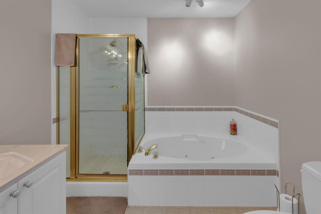 Upstairs, the home opens to a bright loft area with white spindle railings and warm wood accents—a perfect reading nook or secondary workspace. Both generously sized bedrooms are located on this level, each with its own full en suite bathroom. The primary bedroom features beautiful vaulted ceilings and a luxurious five-piece en suite with double vanity, separate shower, and soaking tub. The second bedroom offers a well-appointed four-piece en suite. Hunter Douglas blinds dress most windows throughout the home, and nearly all windows have been replaced for improved efficiency (except the rear upstairs). Central air conditioning keeps you comfortable year-round. Below, the unfinished basement offers a blank canvas ready for your vision—rec room, bedroom, bathroom, and plenty of room for storage. The well-maintained features new asphalt shingles, and the double attached, insulated garage includes a hose bib for added utility. As an extra, a water softener adds to the home’s functionality. This turnkey, move-in ready home with its prime green-space location and thoughtful updates truly needs to be seen to be fully appreciated. Be sure to check out the virtual tour!