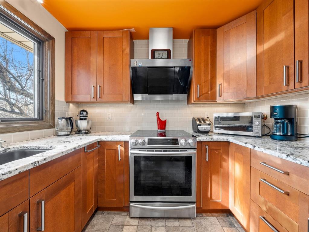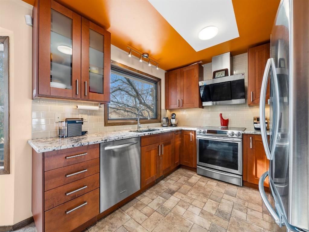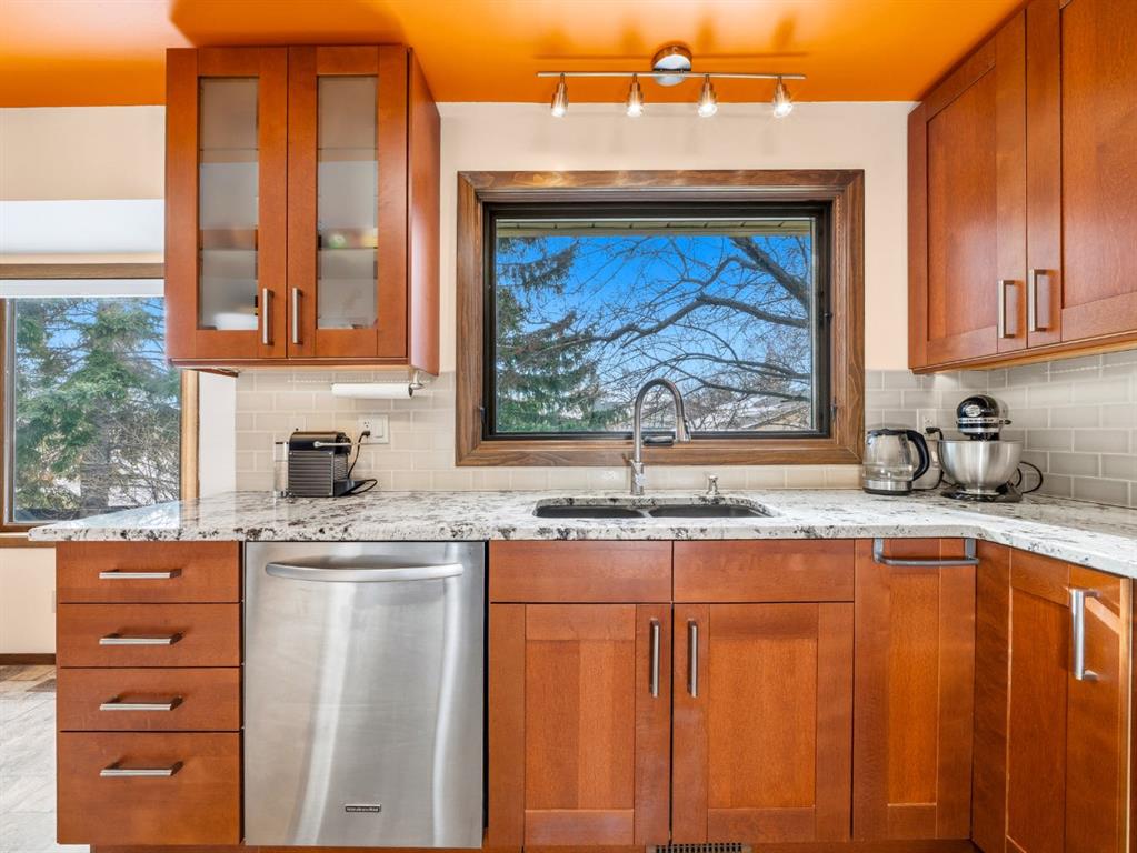 Perfectly situated across from a peaceful park, this Scenic Acres home offers the rare combination of a prime, quiet location and a thoughtfully designed floor plan. Sunlight pours through the bay windows into the main floor, highlighting the inviting living room and spacious formal dining area. The kitchen features updated cabinets, quality stainless steel appliances, granite countertops and a sunny breakfast nook with a bay window overlooking the private, treed backyard. In the adjoining family room, a cozy wood-burning fireplace creates an inviting atmosphere, while an upgraded sliding door leads directly to the outdoor space, creating a seamless indoor-outdoor flow.