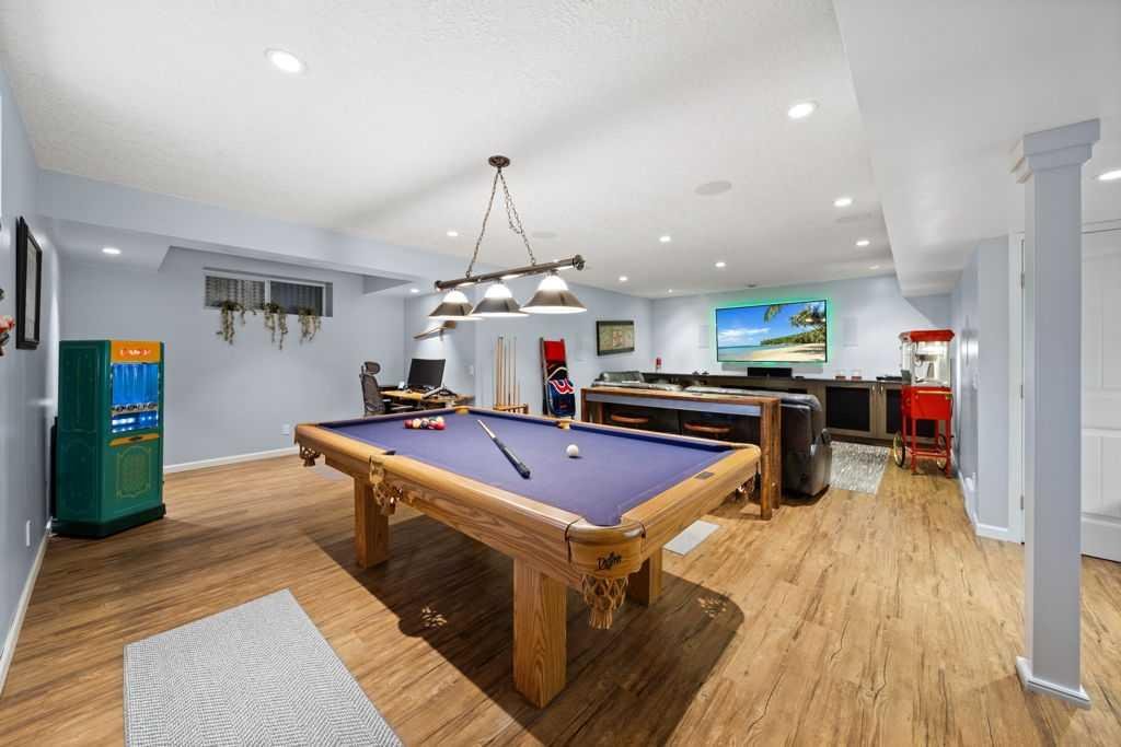 The fully developed basement is an entertainer’s dream. It features a stunning wet bar with granite countertops, a fully integrated speaker system, and custom built-in cabinetry surrounding the large electric fireplace, that perfectly complements the space. With ample room for a pool table, home office setup, and additional lounging area, this level adds incredible versatility and value.