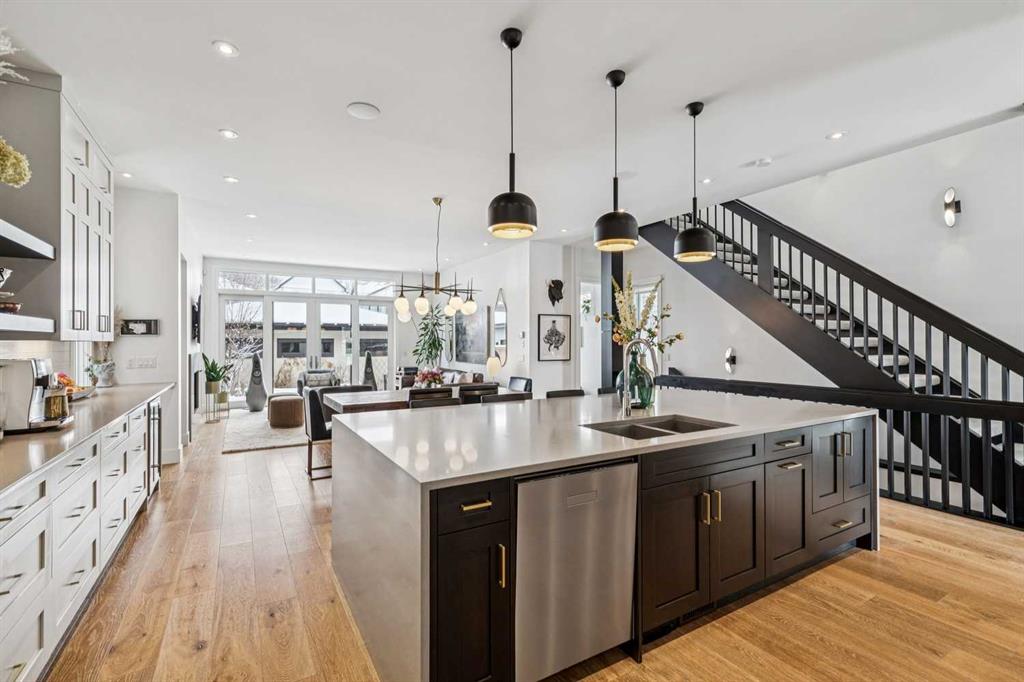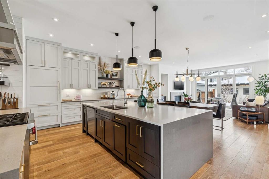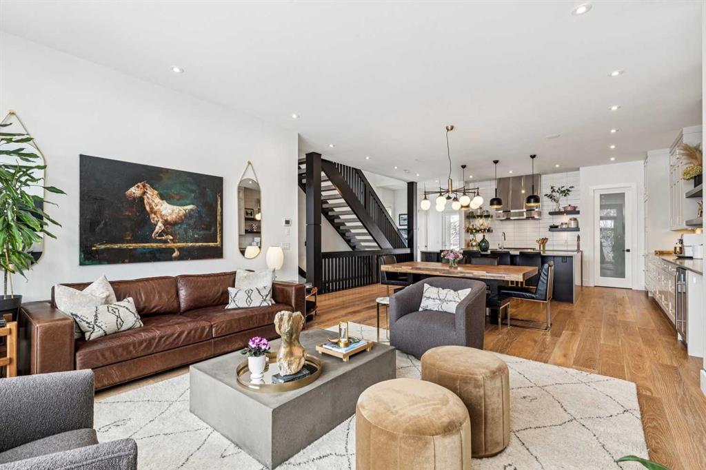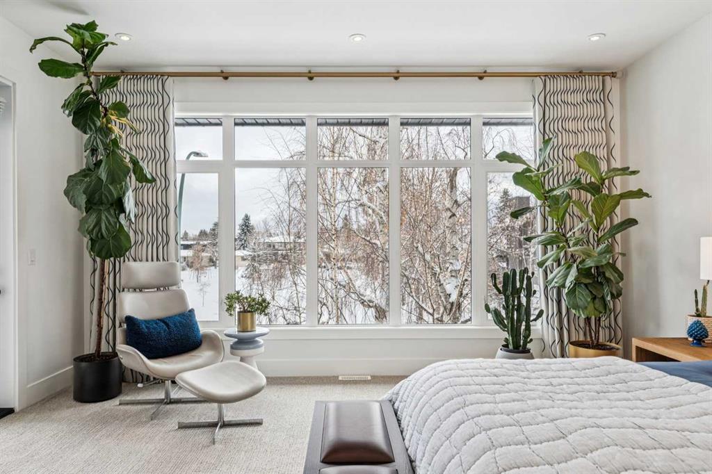 Parkside living meets elevated design in this luxurious detached home by award-winning custom builder CNJ Developments, ideally positioned on a tree-lined street in a prime location directly facing a green space. Thoughtful comfort upgrades elevate everyday living including central air conditioning, central vacuum, a power humidifier & built-in speakers across all 3 levels. Exceptional functionality & style come together in the chef-inspired kitchen where abundant 2-toned cabinetry, quartz countertops & high-end stainless steel appliances support both everyday cooking & entertaining. A Wolf gas range & Sub-Zero refrigerator anchor the appliance package while a beverage fridge, custom pantry & large centre island encourage casual gathering. Centring the open concept space, the dining room with chic lighting & clear sightlines promotes effortless conversation. Relaxation unfolds in the living room where a gas fireplace framed by built-ins creates a warm focal point while an entire wall of windows opens to the backyard, encouraging a seamless indoor & outdoor lifestyle. Organization remains simple thanks to a custom mudroom designed to store everyday essentials & seasonal gear. Productivity finds a quiet setting in the private main floor den where oversized windows & a wood ceiling detail create a sophisticated home office environment. Natural light continues upstairs where skylights brighten the hallway leading to the primary retreat. Oversized windows frame park views while a private balcony offers a peaceful setting for morning coffee or evening relaxation. An elegant tray ceiling enhances the sense of space while the luxurious ensuite includes dual vanities, a deep soaker tub, heated floors & an oversized steam shower. A skylight introduces additional daylight while a custom walk-in closet supports organized daily routines. Two additional bedrooms feature spacious layouts with wallpaper feature walls while a stylish 4-piece bathroom & convenient upper laundry complete the level. The fully finished lower living expands the home with heated floors that provide consistent comfort throughout. Evenings gather easily in the recreation room for movies or games while a wet bar keeps snacks & drinks within easy reach. Fitness routines remain convenient with a dedicated home gym while a fourth bedroom, versatile den & modern 4-piece bathroom offer flexibility for guests or hobbies. Outdoor living continues in the fully fenced backyard where children & pets have room to play & a patio invites summer barbeques & quiet evenings outdoors. Added privacy is created by the triple detached garage accessed from the rear lane. Sunny south exposure highlights the front patio where peaceful park views create a welcoming place to relax. Sandy Beach Park, the Elbow River pathways & the vibrant amenities of Marda Loop including boutique shops, tennis courts, the outdoor pool & acclaimed dining are all within walking distance, supporting an exceptional inner-city lifestyle.