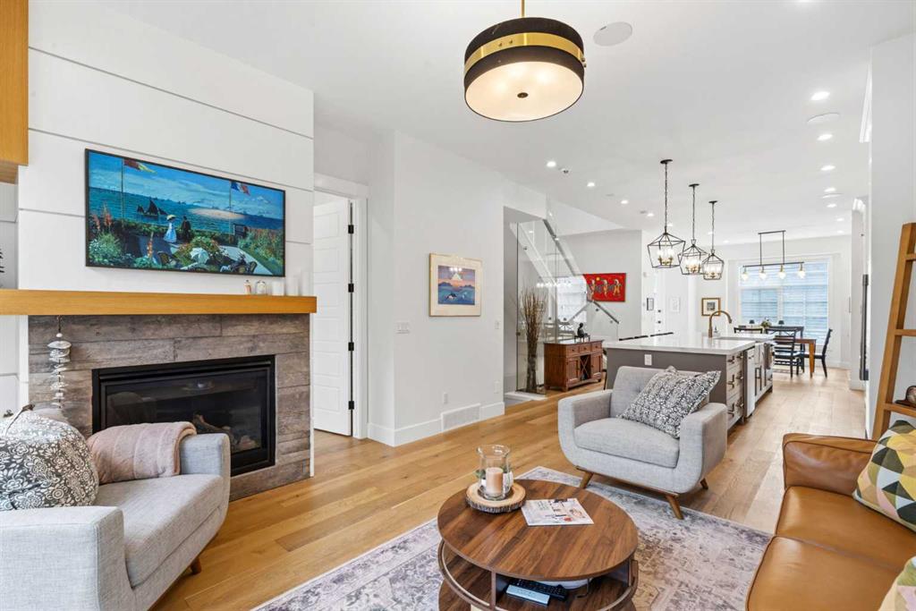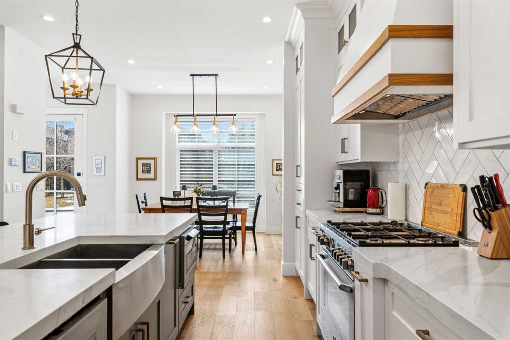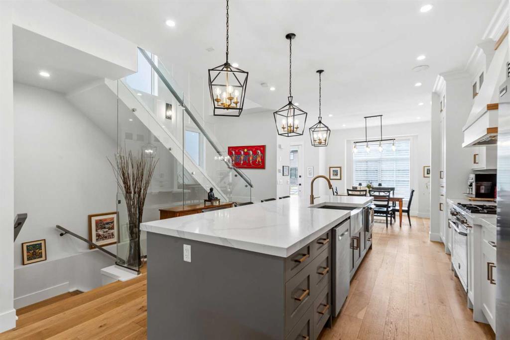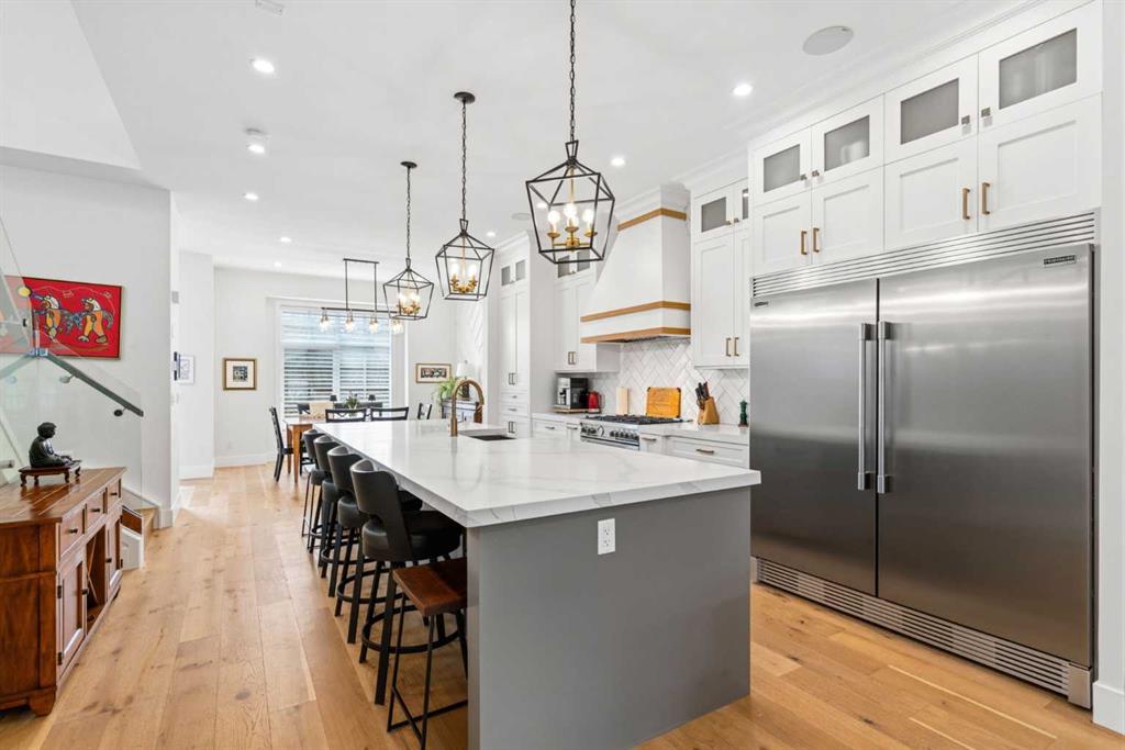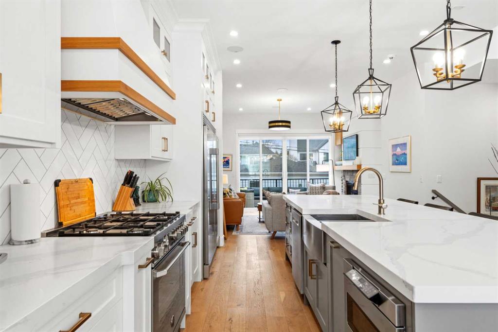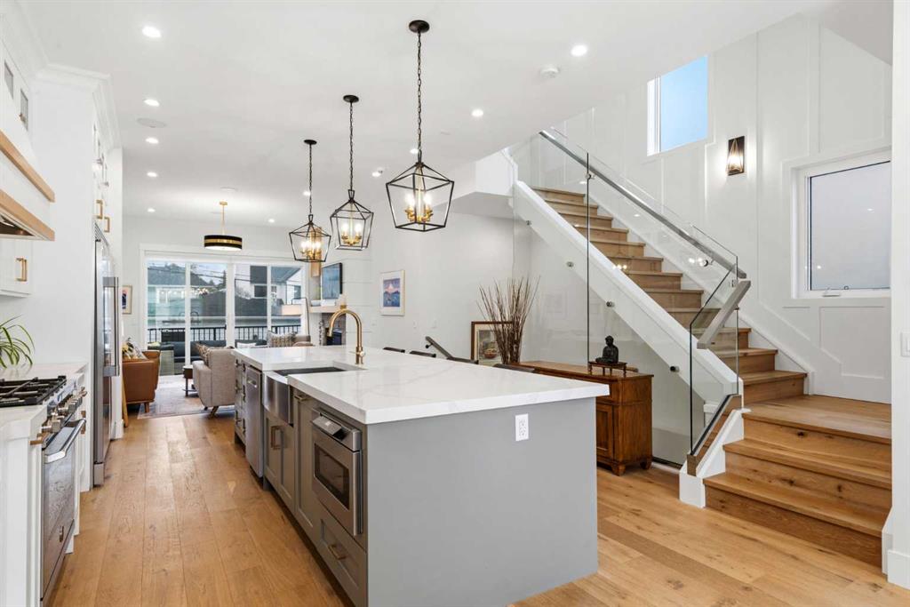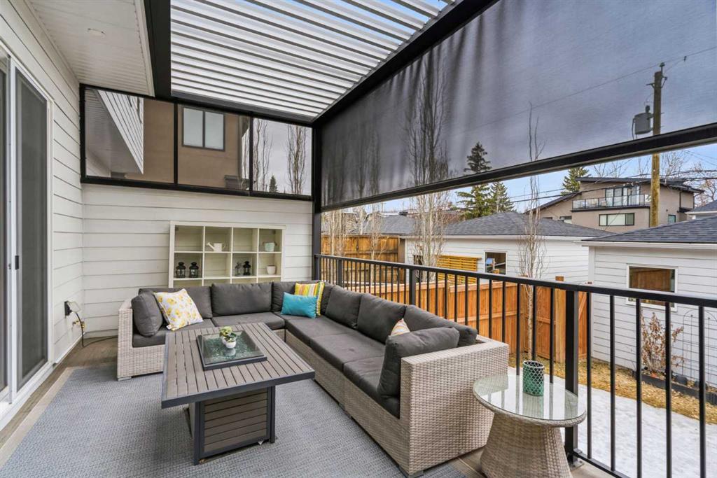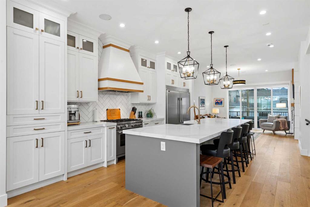 This exceptional, modern farmhouse style home, where architectural refinement & timeless design converge on a quiet, tree-lined street in the heart of Altadore. With 2,836 sq ft of curated living space, this stunning four-bedroom, 3.5 bath residence seamlessly blends upscale finishes with thoughtful functionality. Soaring 10 foot flat ceilings, engineered white oak wood flooring throughout, & striking 8 foot doors enhance the sense of openness & grandeur. Expansive windows flood the open concept main floor with natural light, illuminating a front dining area adorned with a detailed feature wall that flows effortlessly into the chef-inspired kitchen. The kitchen is designed for both everyday living & elegant entertaining & features custom, full height white cabinetry, subway tile backsplash, quartz countertops, a massive two-toned island with an eating bar & premium appliances, including a Bertazzoni gas range, dual full-sized fridge & freezer & drawer style microwave. The inviting living room offers a warm refined atmosphere, with a modern gas fireplace & custom built-ins. Large patio doors open to an expansive rear deck with a Suncoast enclosure featuring a motorized louvre roof and retractable screens – offering all-season outdoor living with adjustable sun, shade, and airflow. The mudroom with custom built-ins & a stylish powder room complete the main level. A dramatic architectural staircase with extra wide wood treads & sleek glass walls leads to the upper floor. The primary suite showcases a tray ceiling and a spacious walk-in closet. A sliding barn door leads to the spa-inspired ensuite, which offers in-floor heating, dual vanities, a freestanding soaker tub, an oversized glass-enclosed shower & a private water closet, delivering a serene experience. Two additional bedrooms, one with a walk-in closet, share a beautiful bathroom, while a dedicated laundry room with cabinetry & sink ensures everyday convenience. The fully finished basement is designed for both relaxation & entertaining, featuring in floor heating, a generous family room, a designer wet bar complete with open shelving, upper & lower cabinetry, & beverage fridge area, plus a fourth bedroom with a large walk-in closet & full bathroom. Enjoy seamless outdoor living with a private front patio, perfect for summer evenings & entertaining. Features include central air conditioning, in-ceiling speakers, custom blinds with blackout in the upstairs bedrooms, plus a fully insulated, drywalled, heated double detached garage with a paved lane. Perfectly positioned in one of Calgary’s most sought-after communities, this residence offers an unmatched lifestyle with exceptional walkability. Enjoy being just moments from River Park, Sandy Beach Park, Monogram Coffee, the vibrant shops, restaurants & cafes of Marda Loop. Quick access to Crowchild, Glenmore & Stoney Trail. This is a meticulously crafted home that delivers sophistication, comfort, and distinction at every turn.