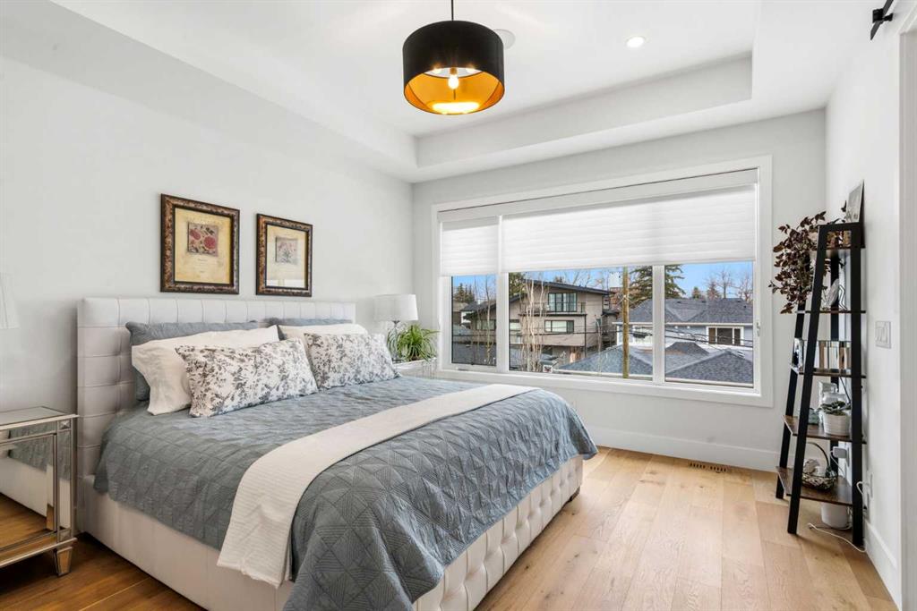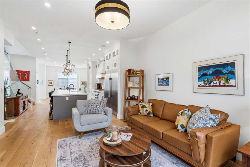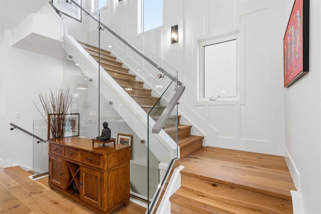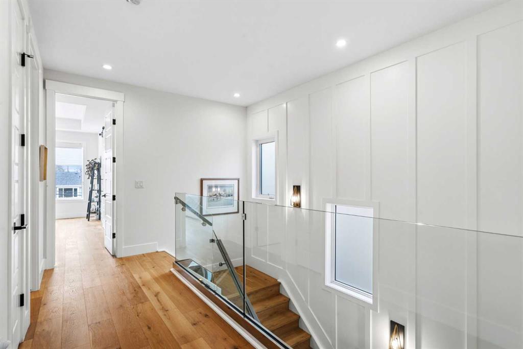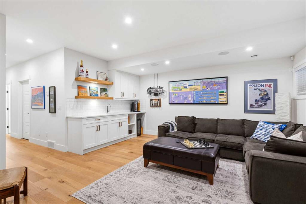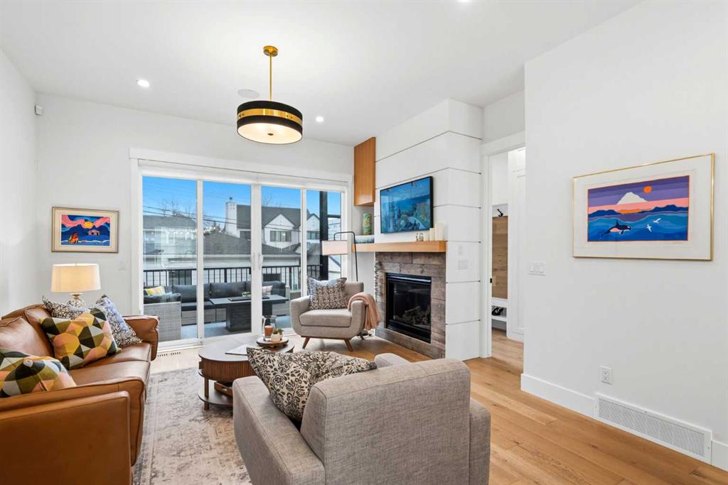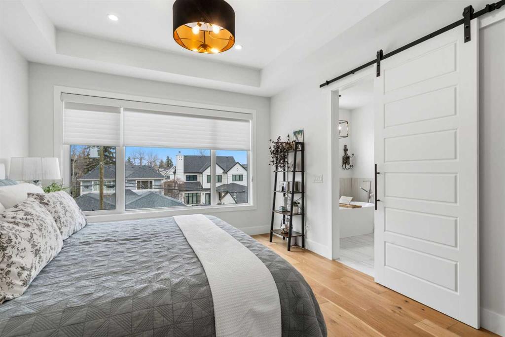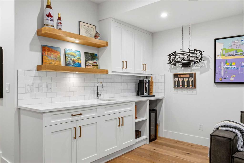 This exceptional, modern farmhouse style home, where architectural refinement & timeless design converge on a quiet, tree-lined street in the heart of Altadore. With 2,836 sq ft of curated living space, this stunning four-bedroom, 3.5 bath residence seamlessly blends upscale finishes with thoughtful functionality. Soaring 10 foot flat ceilings, engineered white oak wood flooring throughout, & striking 8 foot doors enhance the sense of openness & grandeur. Expansive windows flood the open concept main floor with natural light, illuminating a front dining area adorned with a detailed feature wall that flows effortlessly into the chef-inspired kitchen. The kitchen is designed for both everyday living & elegant entertaining & features custom, full height white cabinetry, subway tile backsplash, quartz countertops, a massive two-toned island with an eating bar & premium appliances, including a Bertazzoni gas range, dual full-sized fridge & freezer & drawer style microwave. The inviting living room offers a warm refined atmosphere, with a modern gas fireplace & custom built-ins. Large patio doors open to an expansive rear deck with a Suncoast enclosure featuring a motorized louvre roof and retractable screens – offering all-season outdoor living with adjustable sun, shade, and airflow. The mudroom with custom built-ins & a stylish powder room complete the main level. A dramatic architectural staircase with extra wide wood treads & sleek glass walls leads to the upper floor. The primary suite showcases a tray ceiling and a spacious walk-in closet. A sliding barn door leads to the spa-inspired ensuite, which offers in-floor heating, dual vanities, a freestanding soaker tub, an oversized glass-enclosed shower & a private water closet, delivering a serene experience. Two additional bedrooms, one with a walk-in closet, share a beautiful bathroom, while a dedicated laundry room with cabinetry & sink ensures everyday convenience. The fully finished basement is designed for both relaxation & entertaining, featuring in floor heating, a generous family room, a designer wet bar complete with open shelving, upper & lower cabinetry, & beverage fridge area, plus a fourth bedroom with a large walk-in closet & full bathroom. Enjoy seamless outdoor living with a private front patio, perfect for summer evenings & entertaining. Features include central air conditioning, in-ceiling speakers, custom blinds with blackout in the upstairs bedrooms, plus a fully insulated, drywalled, heated double detached garage with a paved lane. Perfectly positioned in one of Calgary’s most sought-after communities, this residence offers an unmatched lifestyle with exceptional walkability. Enjoy being just moments from River Park, Sandy Beach Park, Monogram Coffee, the vibrant shops, restaurants & cafes of Marda Loop. Quick access to Crowchild, Glenmore & Stoney Trail. This is a meticulously crafted home that delivers sophistication, comfort, and distinction at every turn.