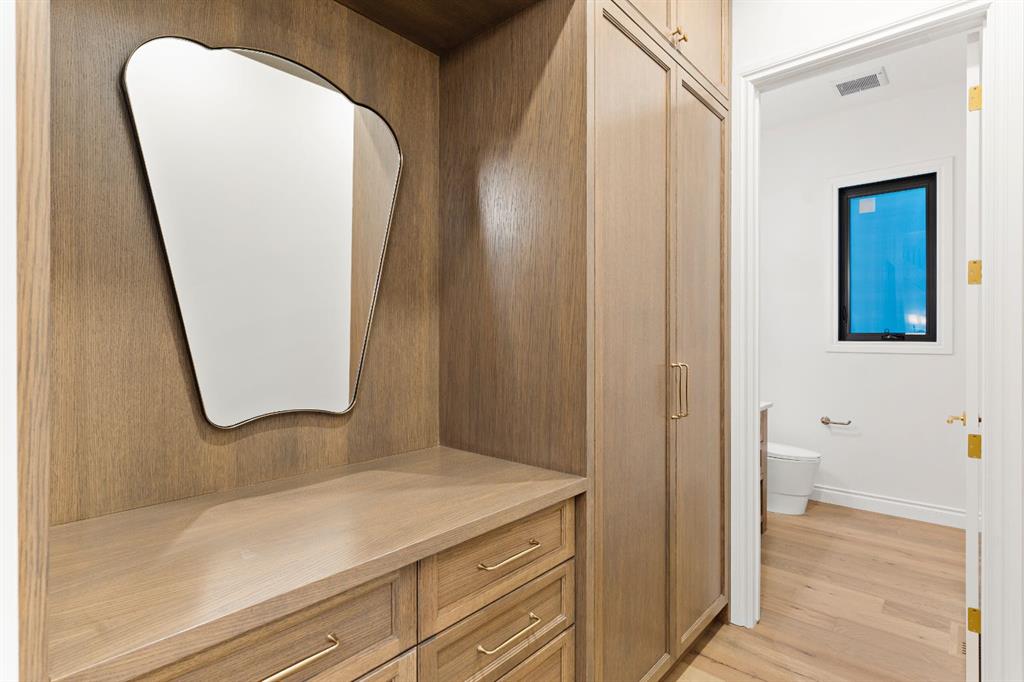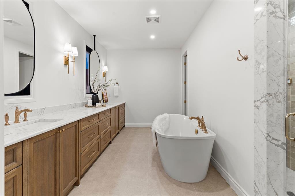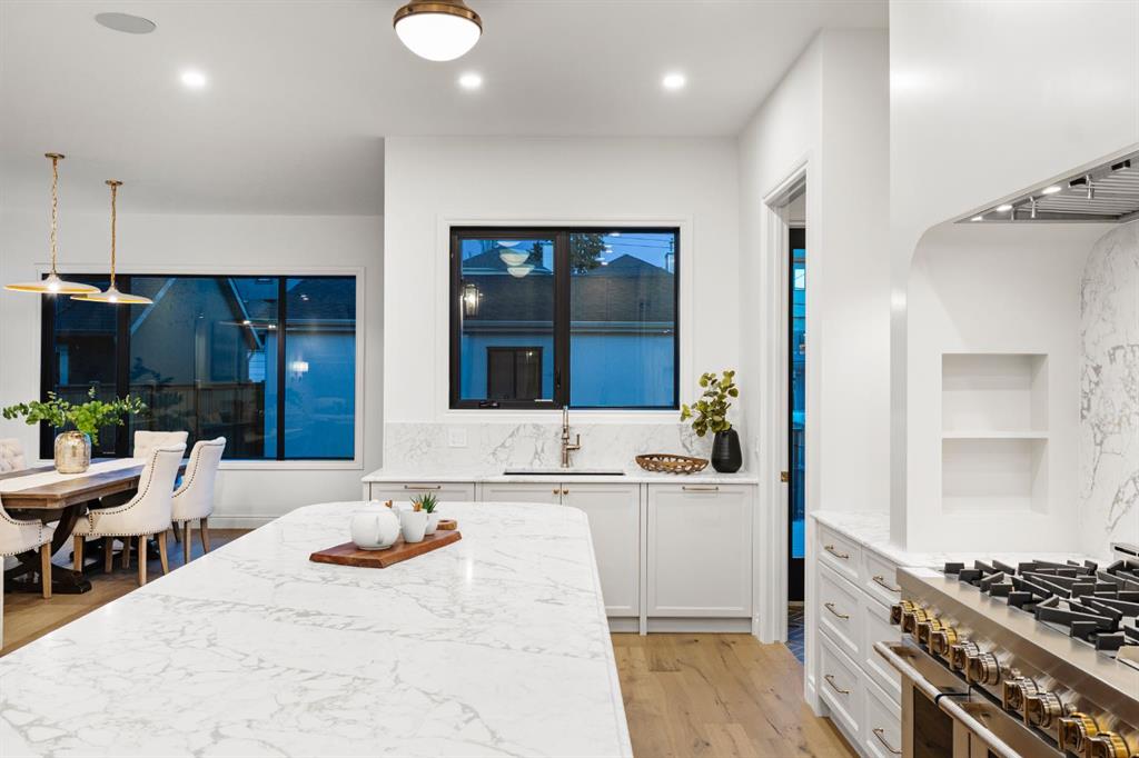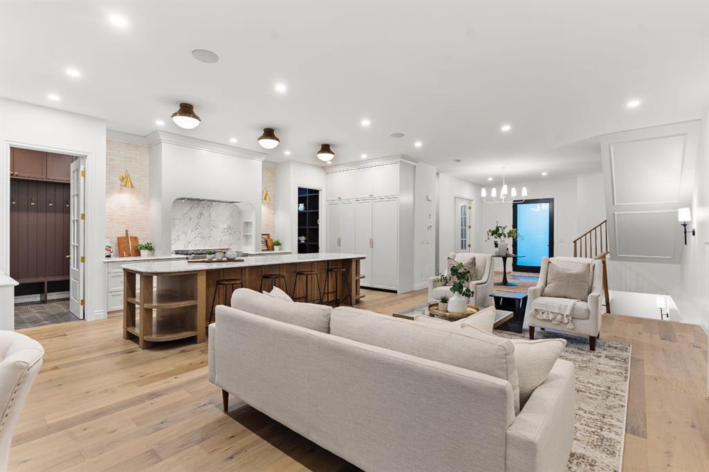 Welcome to The Bardot, an architectural masterpiece that seamlessly blends French cottage elegance with modern luxury in Calgary’s highly desirable Marda Loop. Thoughtfully crafted by Cedar Rock Homes and curated by Aly Velji Designs, this bespoke residence offers four bedrooms, 4.5 bathrooms, and a triple-car garage. The exterior showcases a stunning fusion of stone, stucco, and Hardie panel, paired with an aluminum cedar soffit entry, custom aluminum Lux windows, and a striking front entry door. A private backyard enhances the tranquility of the large composite patio with aluminum glass railing, while the fully landscaped and fenced yard ensures low-maintenance outdoor enjoyment. Inside, 10’ ceilings on the main level and 9’ ceilings on the upper and lower floors create a sense of volume and sophistication. The wide plank white oak engineered hardwood flooring extends across all floors, all solid core doors, accentuated by custom site-built cabinetry with maple dovetail drawers and Blum hinges throughout. The heart of the home is the gourmet kitchen, appointed with a premium JennAir appliance package including a 48” gas range, 48” panelled refrigerator, panel-ready dishwasher, and an island microwave drawer. A curved quartz slab island, custom cabinetry, and a sculptural hood fan set the tone for a refined culinary space. A butler’s pantry with extended storage and designer lighting and plumbing fixtures, including Brizo and Delta finishes, enhances functionality and style, while the spacious dining room features a custom oak sideboard, functional spaces like the large mudroom, adorned with bespoke millwork. A cozy gas fireplace anchors the main floor living room, while the foyer leads to a beautifully designed home office complete with custom cabinetry with glass doors, French doors, and floor plugs. Upstairs, three bedrooms each offer their own walk-in closets and all ensuites with heated tile flooring. The luxurious primary suite features a vaulted ceiling and a spa-inspired ensuite with an oversized steam shower (two rain heads, and hand bar), a freestanding tub, solid slab stone backsplash, and custom hanging metal mirrors. A dedicated laundry room with washer, dryer, sink, rod, and cabinetry completes the upper level. The finished basement offers additional entertaining and lifestyle spaces with a gym room, TV/game area, a full bathroom, a wet bar with beverage fridge, and generous storage. Mechanically, the home is equipped with dual-zone 96% efficient furnaces with humidifiers, a heat recovery ventilator, automatic water shut-off valve, and rough-ins for in-floor basement heating, air conditioning, vacuum flow, speakers, a security system, and exterior cameras. Every inch of The Bardot speaks to quality, comfort, and timeless beauty. Located in a quiet pocket of Marda Loop just steps from trendy boutiques, restaurants, dog parks, schools, and minutes from downtown, this home is the perfect harmony of prestige and practicality. Book your showing today!