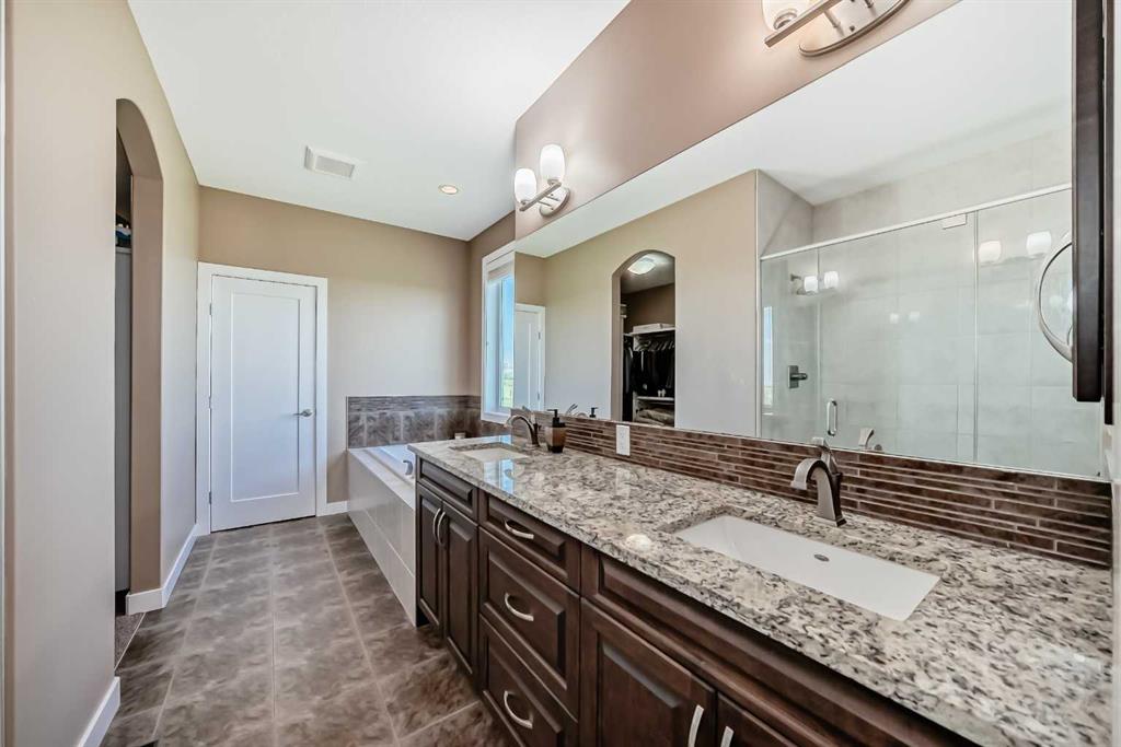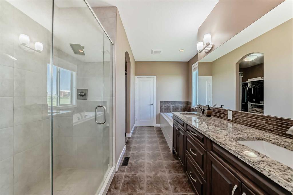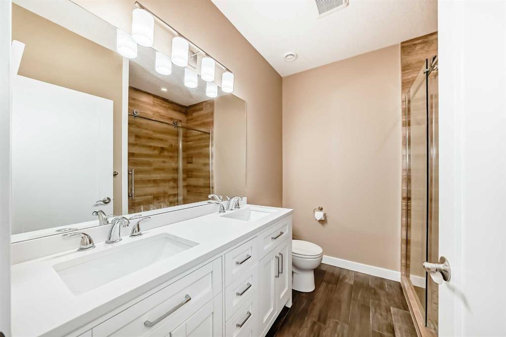 The lower level is an open plan with 9’ ceilings and features an expansive rec room, two additional bedrooms, a full bathroom with dual vanities, and a mechanical room.