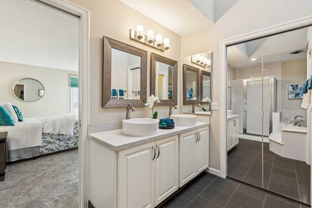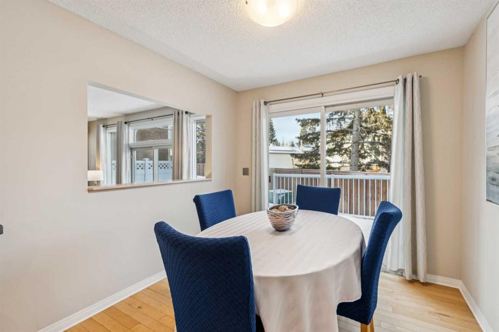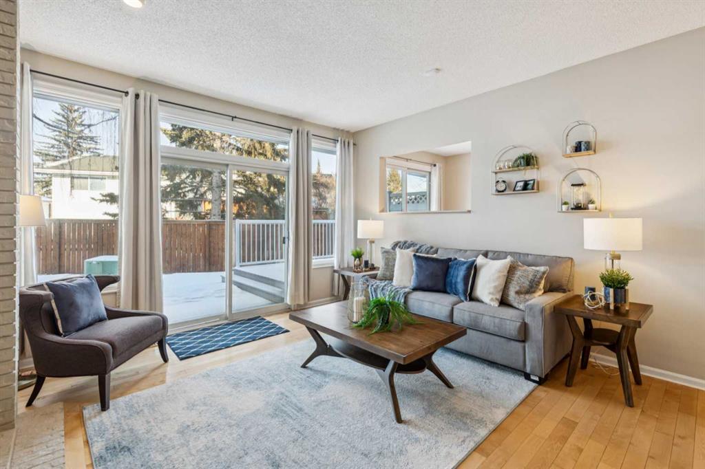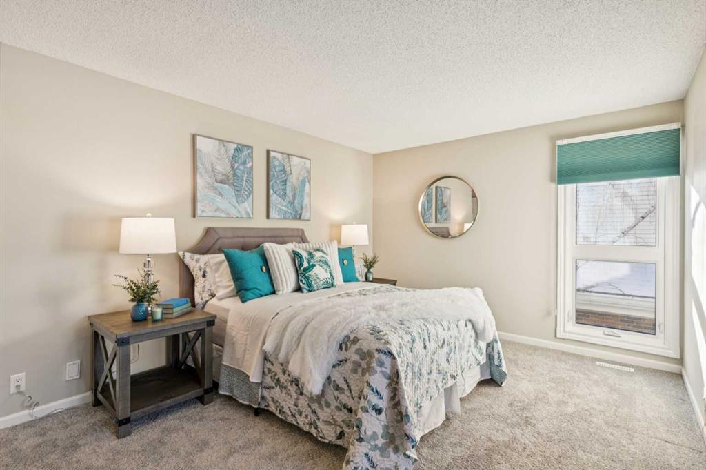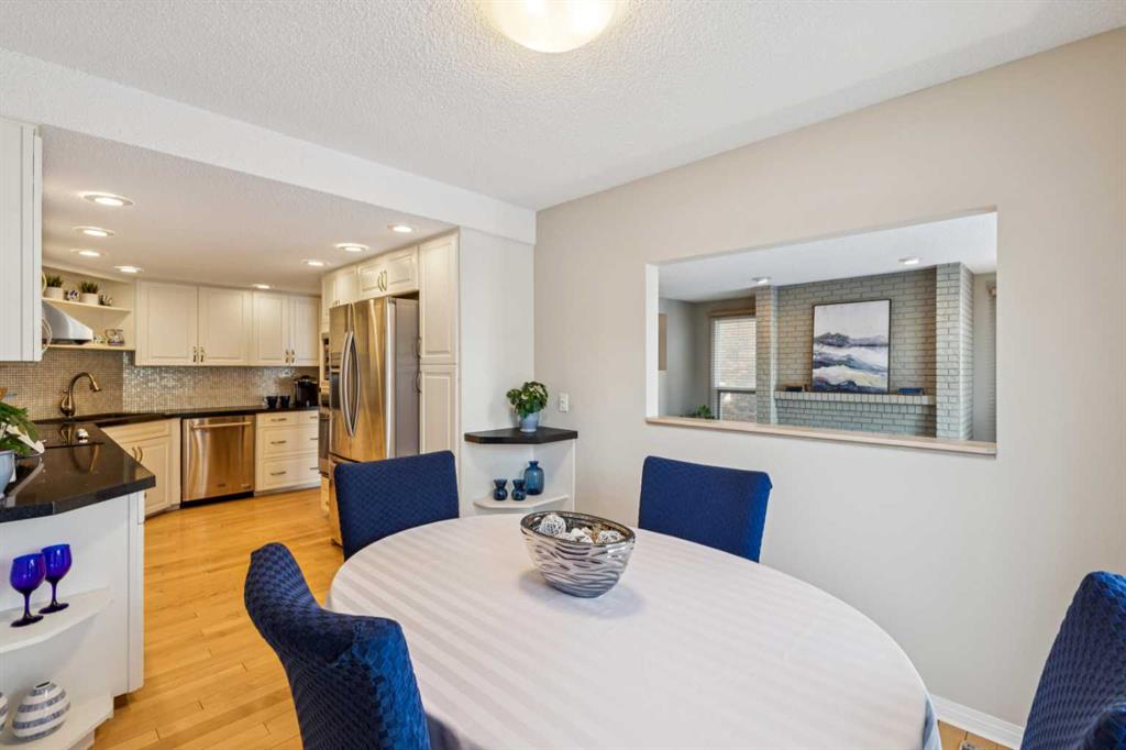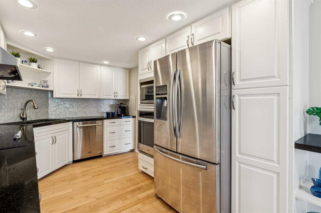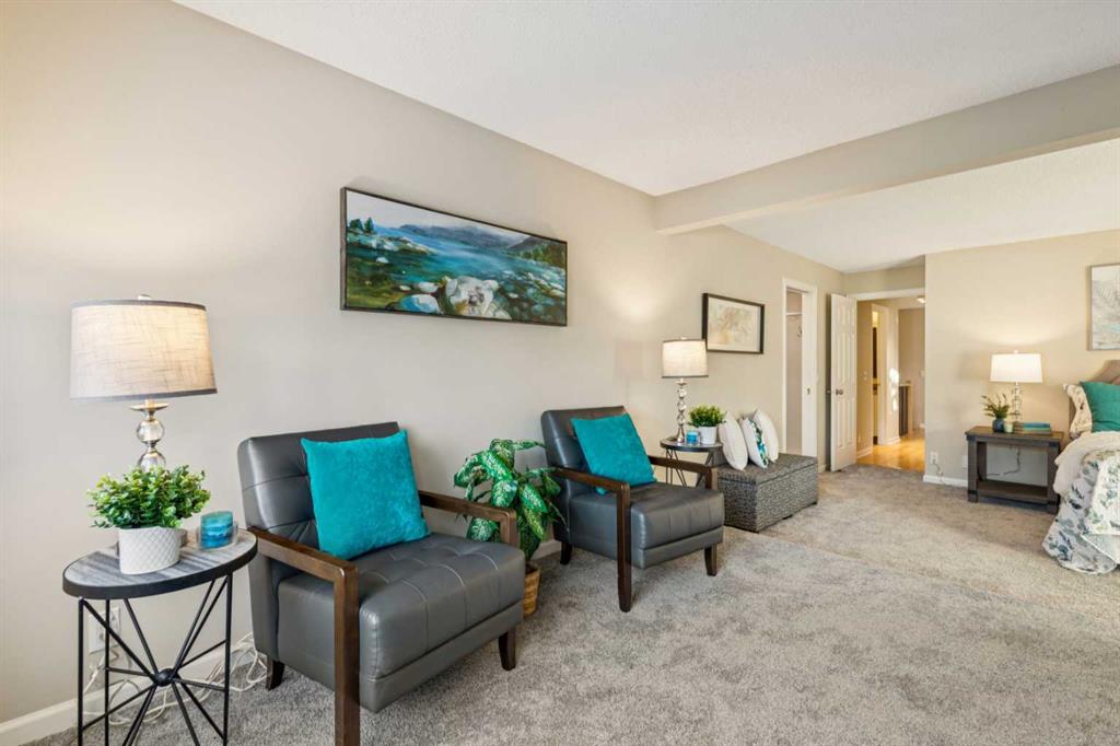 STYLISH, TASTEFULLY RENOVATED TOWNHOME offering 3 BEDROOMS and a MAIN FLOOR DEN plus FINISHED BASEMENT and ATTACHED DOUBLE GARAGE with private driveway that will hold another two cars. AMAZING LOCATION! This complex backs to FISH CREEK PARK and offers easy access to the parks and pathways for outdoor adventures. MANY UPGRADES! New upstairs windows (2022), new furnace (2025), and 2 new hot water tanks (2025), water softener (2025), central air (2022), main floor bath upgraded to a 3-piece, new oven and stovetop in kitchen (2022). Huge primary bedroom has a 5-piece ensuite (jetted tub, separate shower, skylight). This is a home that you really must see!