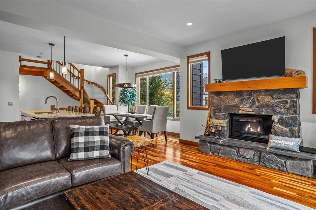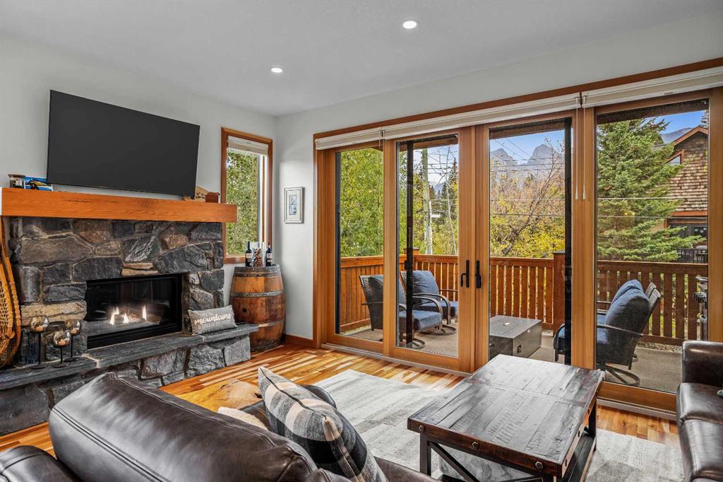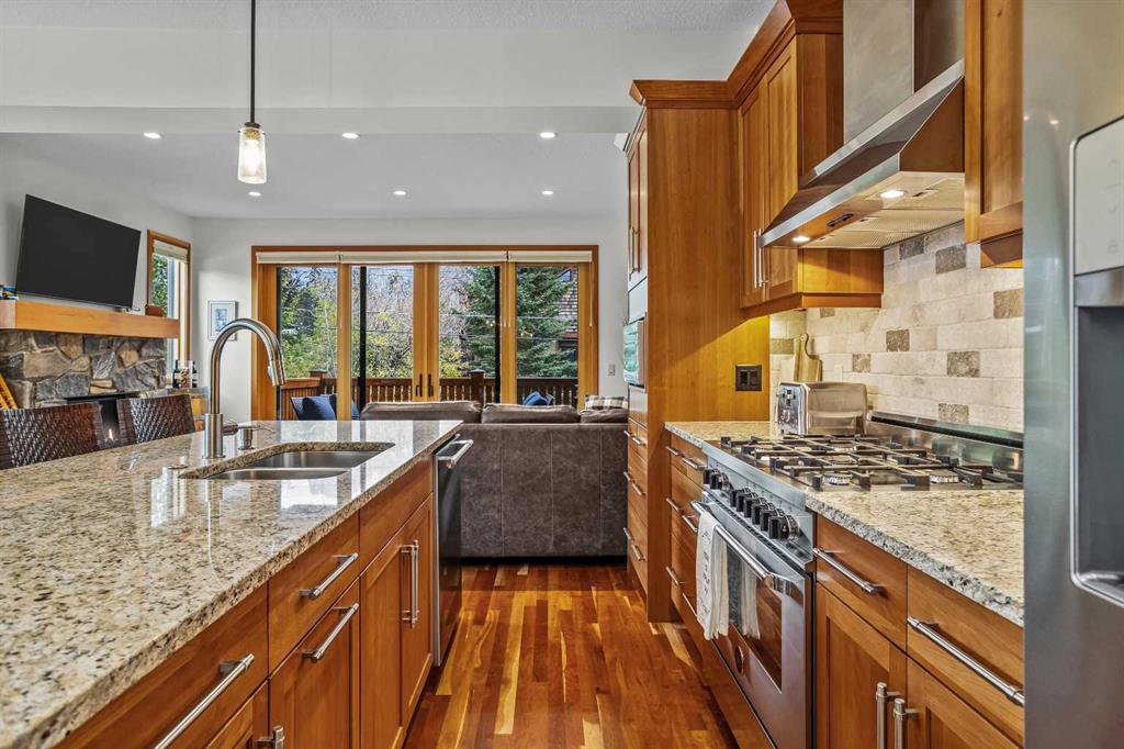 The main level is the heart of the home: a great room surrounded by windows, designed for gathering and entertaining. A spacious dining area flows into the chef’s kitchen, where a large island, custom Douglas fir cabinetry, and high-end appliances including a 6-burner gas range create a space as refined as it is functional. Anchoring the living room, a stunning Rundle stone fireplace adds warmth and character, while patio doors open onto a full-width mountain-view deck, blurring the line between indoors and nature.