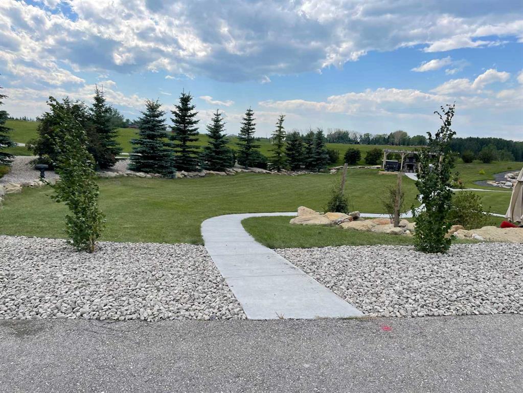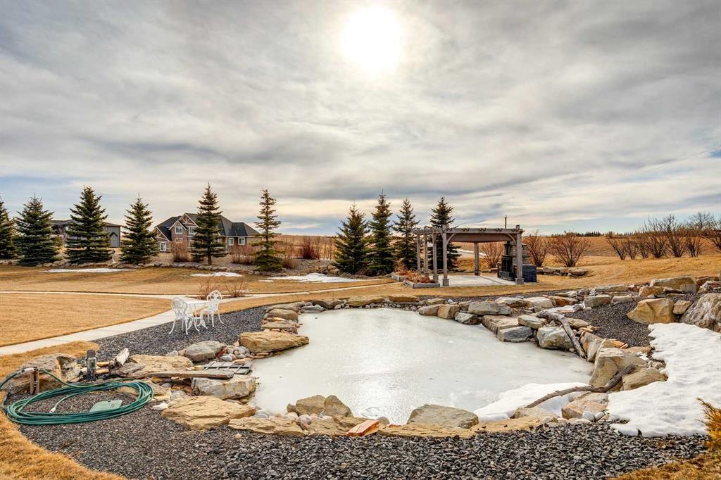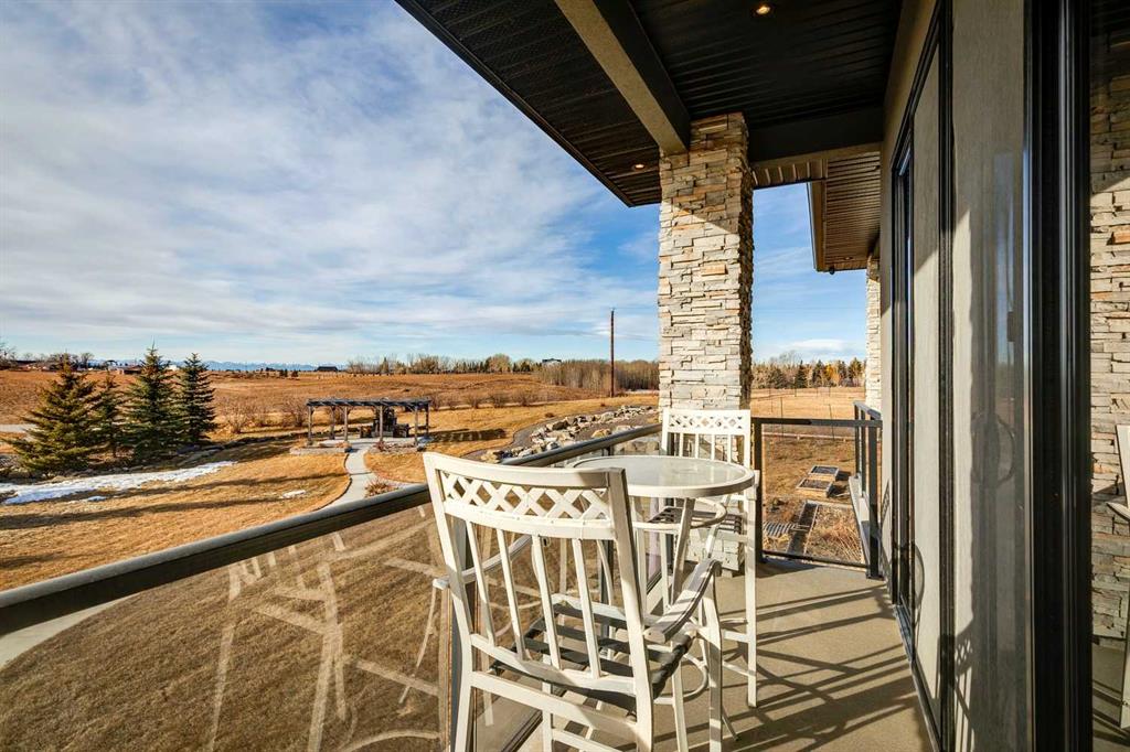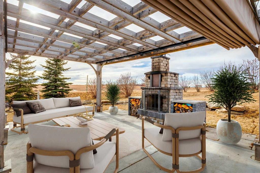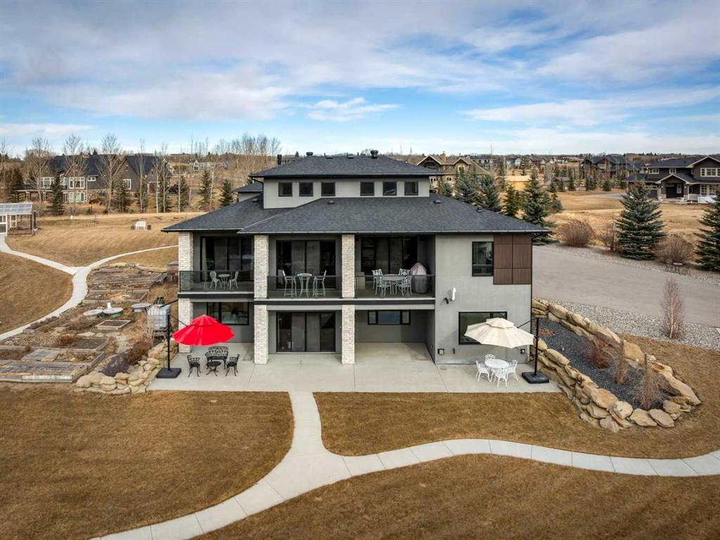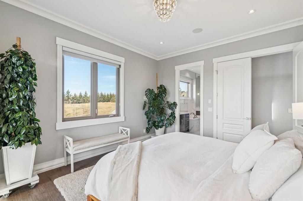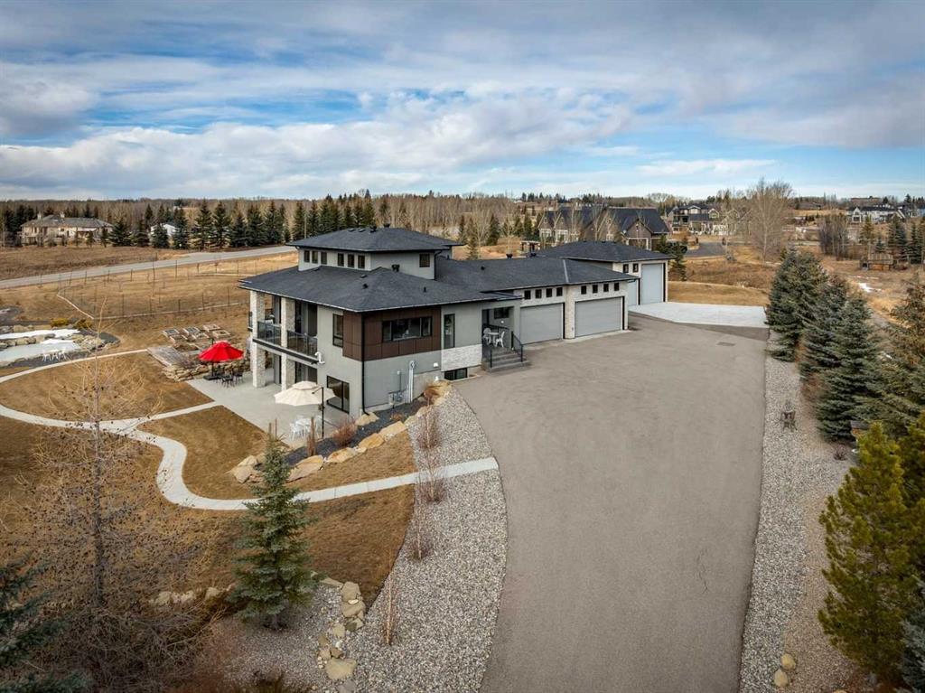 Set on 2 beautifully landscaped acres, this exceptional country residential estate offers a rare blend of luxury construction, high-end mechanical systems, & thoughtfully designed outdoor living, all just 20 minutes from downtown Calgary w/ quick access west to the mountains & positioned to capture breathtaking mountain views, including views enjoyed directly from your kitchen & dining table. The professionally landscaped grounds (completed 4 yrs ago for $110,000) showcase a stunning waterfall feature, rock garden, expansive garden beds, mature fruit orchard w/ apple, cherry, plum, & pear trees, plus saskatoons & raspberries, along w/ a greenhouse & an exterior wood-burning fireplace seating area under a pergola w/ sunshade, all connected by concrete pathways for enhanced accessibility. The property also offers room to park 6 vehicles inside plus an exceptional amount of additional exterior parking, ideal for guests, recreational vehicles, & equipment. The home itself is flooded w/ natural light through extensive windows & features 10-foot ceilings w/ vaulted ceilings in the main living area, solid core interior doors throughout, oak hardwood flooring, in-floor heat, air conditioning (new in 2024 for $10,000), a 2-zone furnace, boiler, & new windows and insulation added in 2025 ($50,000) for improved energy efficiency, w/ the entire home professionally repainted in 2024. The main level offers 2 bedrooms & 2 full bathrooms w/ quartz countertops throughout, including a luxurious primary retreat w/ mountain views, a large walk-in closet w/ built-in shelving, & an elegant ensuite w/ dual sinks, custom tiled shower, & jetted tub, while the living room is anchored by a gas fireplace w/ an oversized tiled feature wall. The chef-inspired kitchen is finished w/ quartz countertops, ceiling-height soft-close cabinetry, under-cabinet lighting, a 5-burner gas stove, in-wall oven, Bosch dishwasher, prep sink, large island, & a spacious walk-in pantry, complemented by a functional mudroom w/ sink & secondary laundry hook-up. The fully developed walk-out basement features a 2nd primary suite w/ covered patio access, dual sinks, quartz counters, tile flooring, oversized tiled shower, jetted tub, & a large custom walk-in closet, plus 2 additional bedrooms (3 total in the basement), a full bathroom w/ steam shower, bench seating, & quartz counters, a wine room, basement laundry w/ shelving, cupboards, & a 2024 dryer, & an expansive recreation space complete w/ surround sound, gas fireplace, & a wet bar w/ quartz counters & light that changes colour. Multiple covered balconies include 2 gas BBQ hook-ups & exterior Bluetooth speakers. The attached quad garage is insulated, drywalled, features 12-foot ceilings, & includes an EV charging panel (charger excluded), while the detached RV shop ($110,000) offers 24×36 dimensions, 14-foot ceilings, a 12-foot RV door, loft, 100-amp service, & 220V power, making this property an exceptional offering in a prestigious price category.