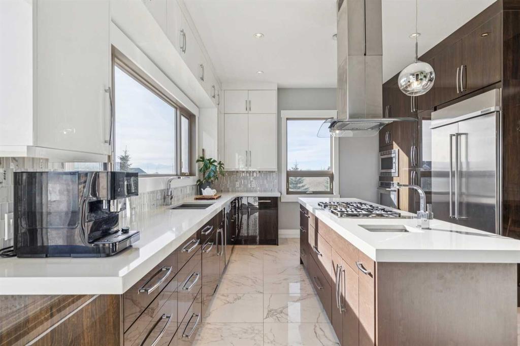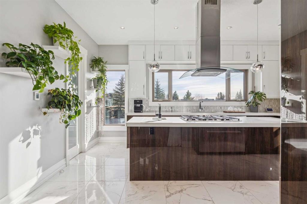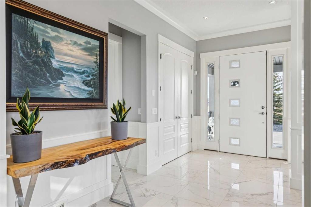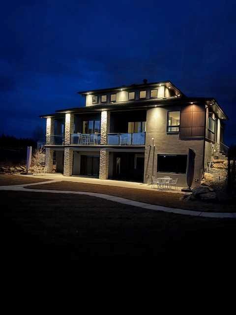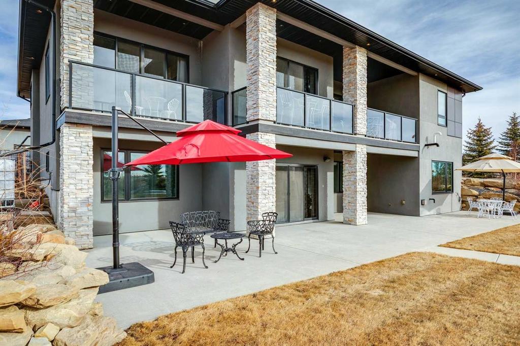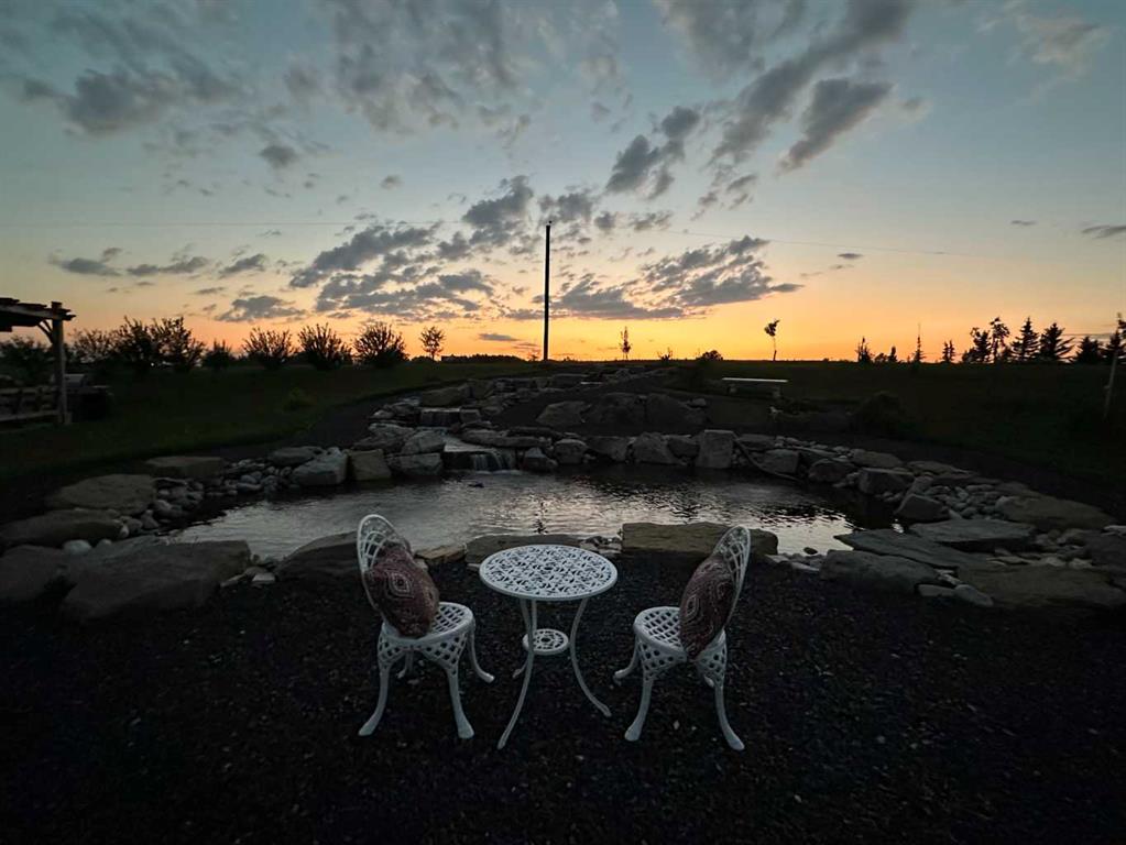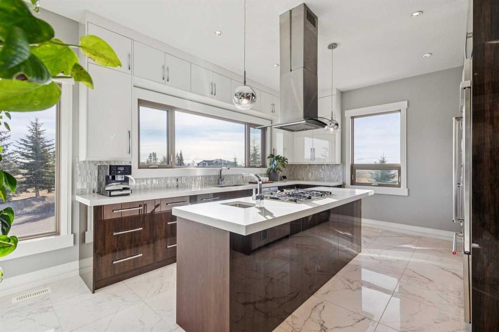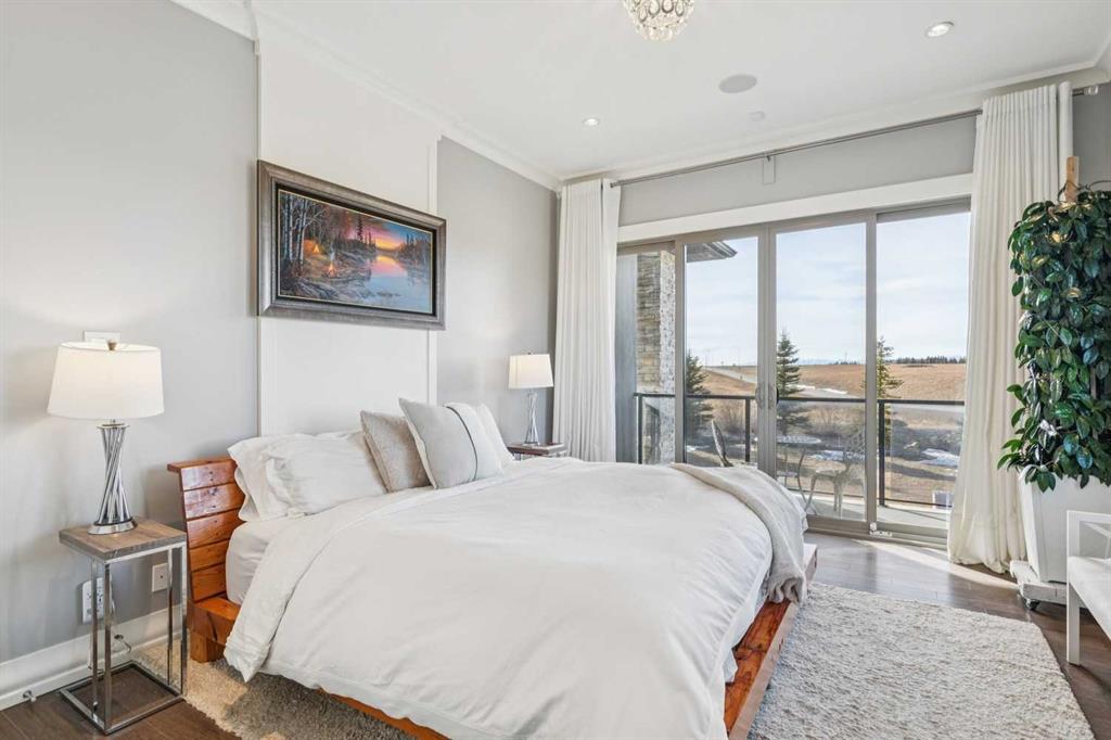 Set on 2 beautifully landscaped acres, this exceptional country residential estate offers a rare blend of luxury construction, high-end mechanical systems, & thoughtfully designed outdoor living, all just 20 minutes from downtown Calgary w/ quick access west to the mountains & positioned to capture breathtaking mountain views, including views enjoyed directly from your kitchen & dining table. The professionally landscaped grounds (completed 4 yrs ago for $110,000) showcase a stunning waterfall feature, rock garden, expansive garden beds, mature fruit orchard w/ apple, cherry, plum, & pear trees, plus saskatoons & raspberries, along w/ a greenhouse & an exterior wood-burning fireplace seating area under a pergola w/ sunshade, all connected by concrete pathways for enhanced accessibility. The property also offers room to park 6 vehicles inside plus an exceptional amount of additional exterior parking, ideal for guests, recreational vehicles, & equipment. The home itself is flooded w/ natural light through extensive windows & features 10-foot ceilings w/ vaulted ceilings in the main living area, solid core interior doors throughout, oak hardwood flooring, in-floor heat, air conditioning (new in 2024 for $10,000), a 2-zone furnace, boiler, & new windows and insulation added in 2025 ($50,000) for improved energy efficiency, w/ the entire home professionally repainted in 2024. The main level offers 2 bedrooms & 2 full bathrooms w/ quartz countertops throughout, including a luxurious primary retreat w/ mountain views, a large walk-in closet w/ built-in shelving, & an elegant ensuite w/ dual sinks, custom tiled shower, & jetted tub, while the living room is anchored by a gas fireplace w/ an oversized tiled feature wall. The chef-inspired kitchen is finished w/ quartz countertops, ceiling-height soft-close cabinetry, under-cabinet lighting, a 5-burner gas stove, in-wall oven, Bosch dishwasher, prep sink, large island, & a spacious walk-in pantry, complemented by a functional mudroom w/ sink & secondary laundry hook-up. The fully developed walk-out basement features a 2nd primary suite w/ covered patio access, dual sinks, quartz counters, tile flooring, oversized tiled shower, jetted tub, & a large custom walk-in closet, plus 2 additional bedrooms (3 total in the basement), a full bathroom w/ steam shower, bench seating, & quartz counters, a wine room, basement laundry w/ shelving, cupboards, & a 2024 dryer, & an expansive recreation space complete w/ surround sound, gas fireplace, & a wet bar w/ quartz counters & light that changes colour. Multiple covered balconies include 2 gas BBQ hook-ups & exterior Bluetooth speakers. The attached quad garage is insulated, drywalled, features 12-foot ceilings, & includes an EV charging panel (charger excluded), while the detached RV shop ($110,000) offers 24×36 dimensions, 14-foot ceilings, a 12-foot RV door, loft, 100-amp service, & 220V power, making this property an exceptional offering in a prestigious price category.
