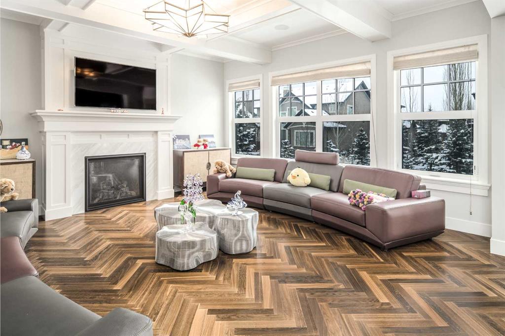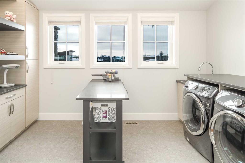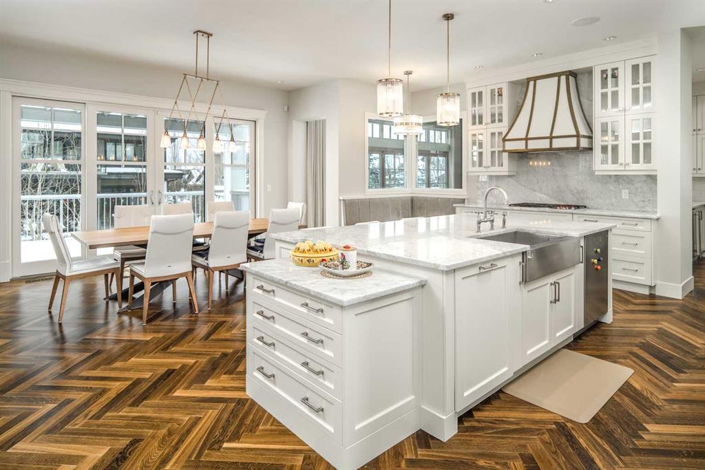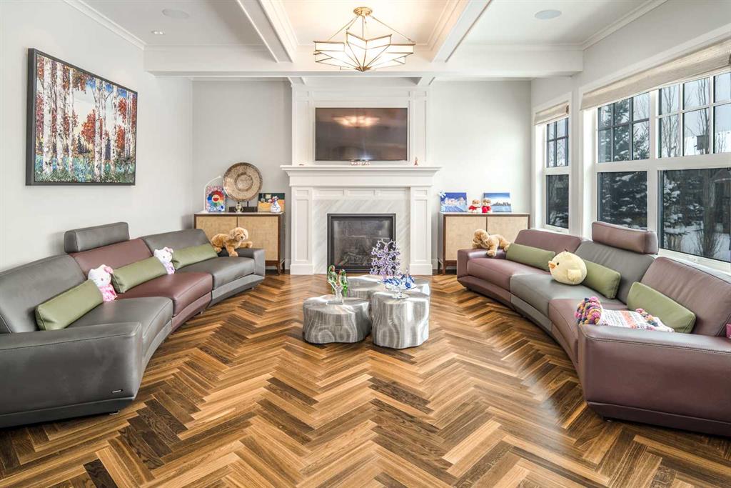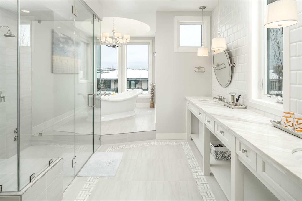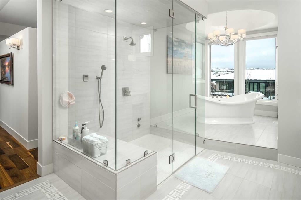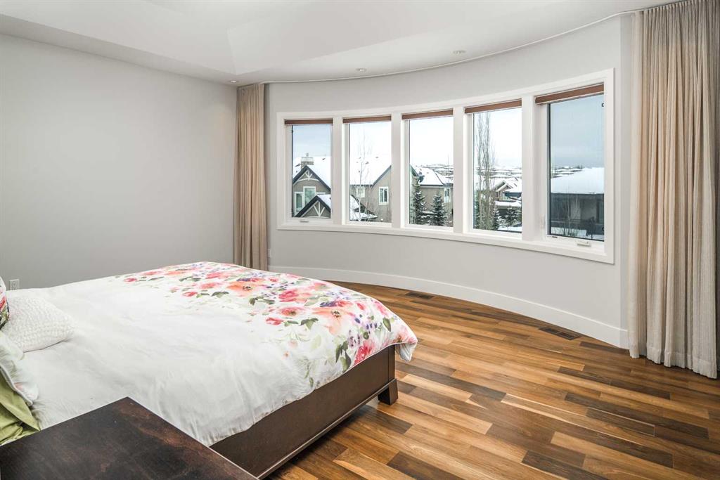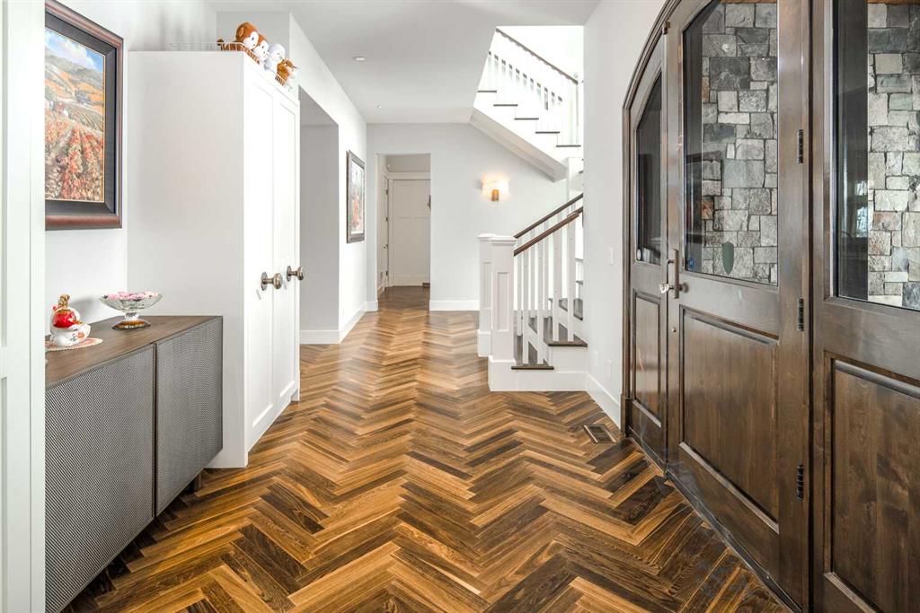 Welcome to this exquisite custom estate home by Wolf Custom Homes, nestled in the prestigious community of Watermark. Boasting over 5,400 sq. ft. of unparalleled craftsmanship and elegance, this former SHOWHOME offers tons of upgrades exemplifies luxury living. The house is in immaculate condition, having been used only occasionally by the owners. From the moment you step inside, you are welcomed by stunning luxury hardwood flooring that flows throughout the main level. The heart of the home is the gourmet chef’s kitchen, featuring beautifully crafted cabinetry, an oversized island with marble countertops, and top-of-the-line appliances, including a Sub-Zero fridge, Wolf gas stove and built-in oven, and an Asko dishwasher. Adjacent to the kitchen, the bright and inviting dining area and living room are adorned with expansive windows, allowing natural light to fill the space. A striking fireplace adds warmth and sophistication to this open-concept layout. For those who love to entertain, a formal dining room and a stunning 4-season sunroom extend onto an expansive, covered balcony—perfect for year-round enjoyment. A spacious main-floor office, complete with custom-built desk and shelving, offers the ideal work-from-home setup. A thoughtfully designed mudroom with a built-in bench and ample storage ensures effortless organization. Upstairs, retreat to the lavish primary suite, where a spectacular walk-in closet with custom spa-like 5-piece ensuite. Indulge in the free-standing soaker tub, oversized glass-enclosed shower, and dual vanities. Two additional generously sized bedrooms, each with its own walk-in closet and private 4-piece ensuite, provide ultimate comfort. A large bonus room and a convenient upper-floor laundry room complete this level. The fully developed walk-out basement, enhanced with in-floor heating, extends the home’s luxurious appeal. It boasts a spacious entertainment area with a fully equipped wet bar, a modern fitness room, an additional bedroom, and a beautifully appointed four-piece bathroom. Step outside to your private backyard oasis, where breathtaking views, lush landscaping, and elegant decorative LED system (10K value) and garden lighting (6K) create the perfect setting for entertaining or quiet evenings under the stars. Located in the exclusive estate community of Watermark, this home provides the tranquility of country living with the convenience of city amenities just minutes away. Enjoy scenic pathways, parks, playgrounds, and the renowned Central Plaza with a pavilion, picnic areas, firepit, sports courts, and lush green spaces. Experience the pinnacle of luxury—book your private showing today!