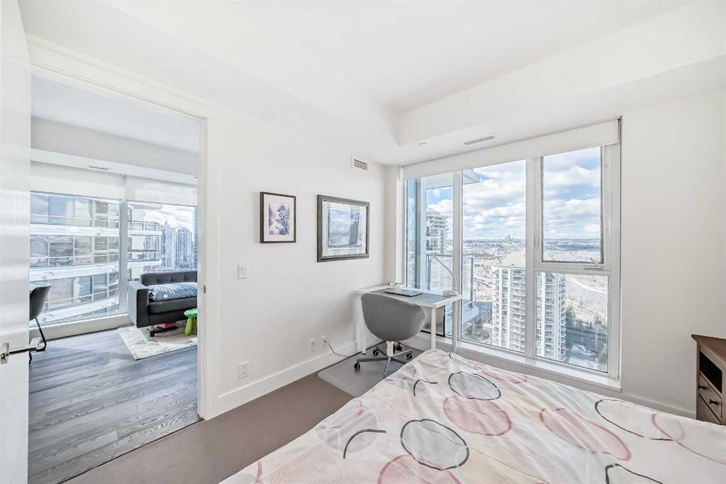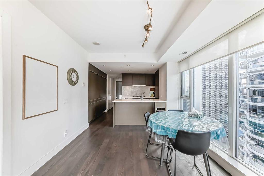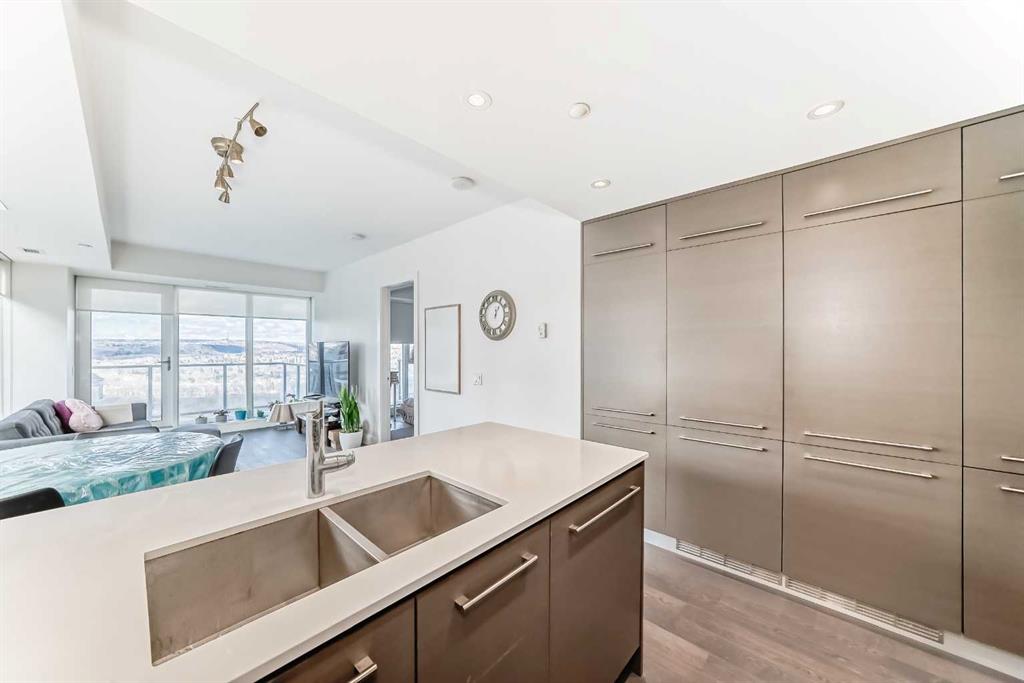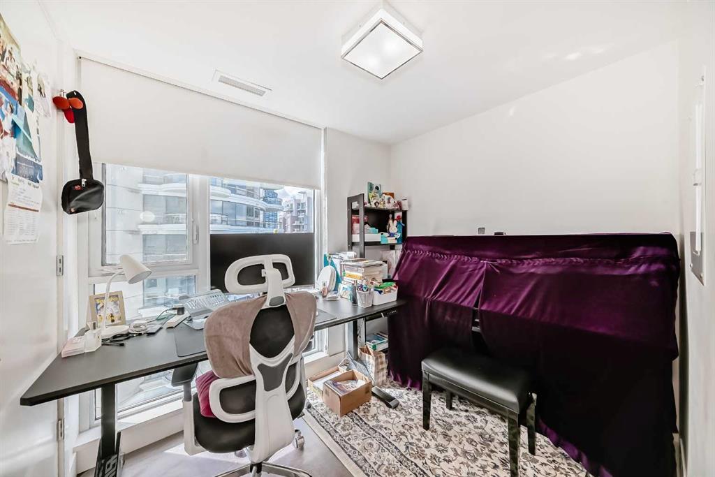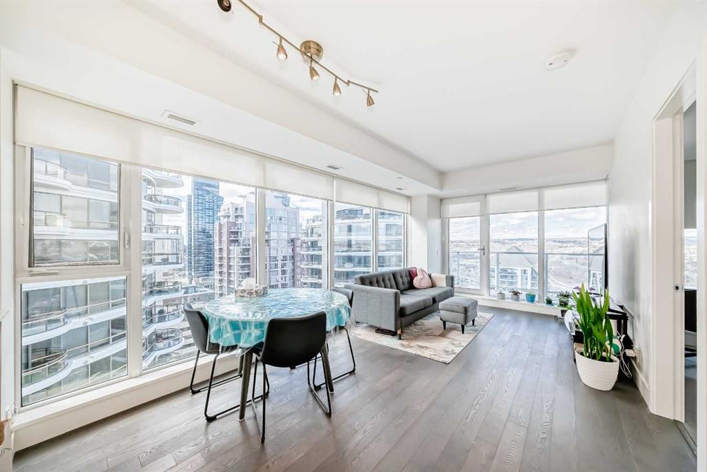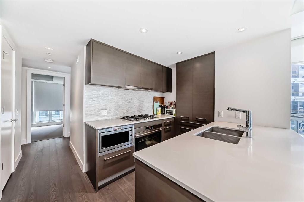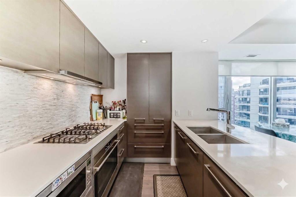 Experience elevated downtown living in this stunning corner unit at Avenue West End, offering breathtaking Bow River and Rocky Mountain views through expansive floor-to-ceiling window walls. This luxurious concrete building combines quality construction with exceptional urban convenience — just steps to downtown offices, river pathways, and Prince’s Island Park. This beautifully designed home features 2 bedrooms, 2 full bathrooms, plus a dedicated office/den, providing the ideal layout for professionals, downsizers, or investors. The gourmet kitchen is appointed with premium built-in appliances including a built-in refrigerator, high-end 5-burner gas stove, built-in microwave, quartz countertops, and sleek modern cabinetry. Rich hardwood flooring, quality carpet, air conditioning, and in-suite laundry complete the upscale interior. Enjoy your private balcony with panoramic river and city views, plus the convenience of titled underground parking, titled storage locker, and heated underground visitor parking. Avenue West End offers outstanding amenities including concierge service, security, fitness room and pet wash station. A rare opportunity to own a premium view unit in one of Calgary’s most sought-after downtown buildings — book your private showing today!