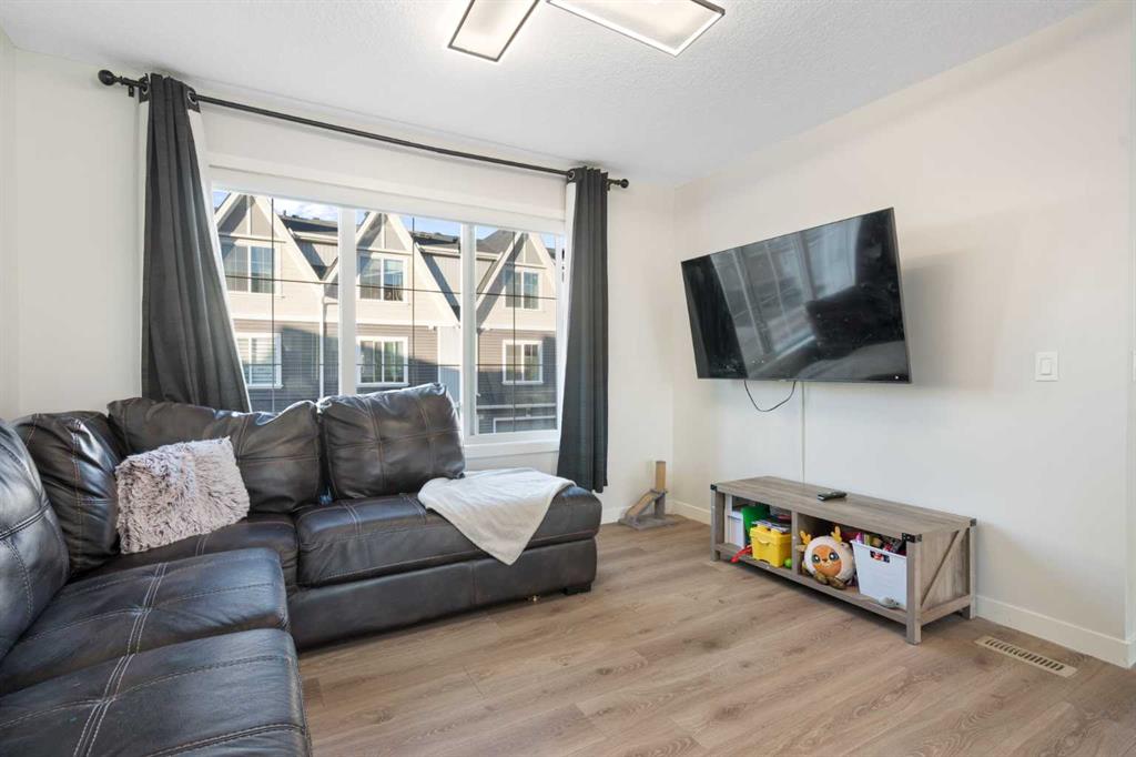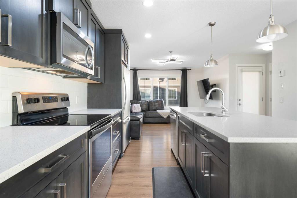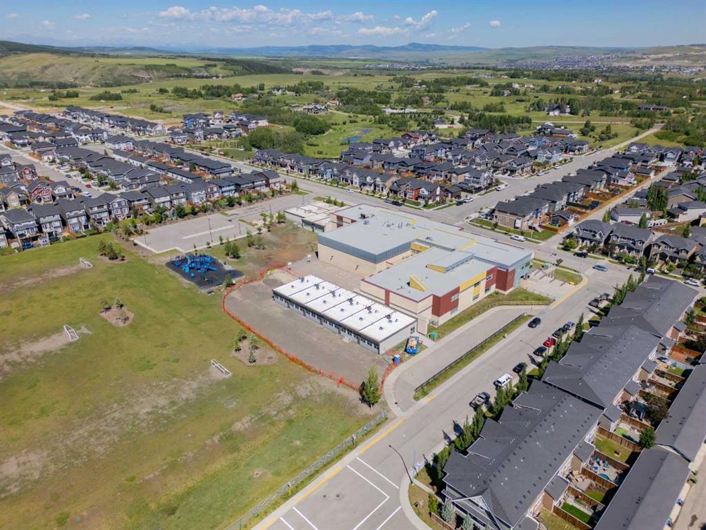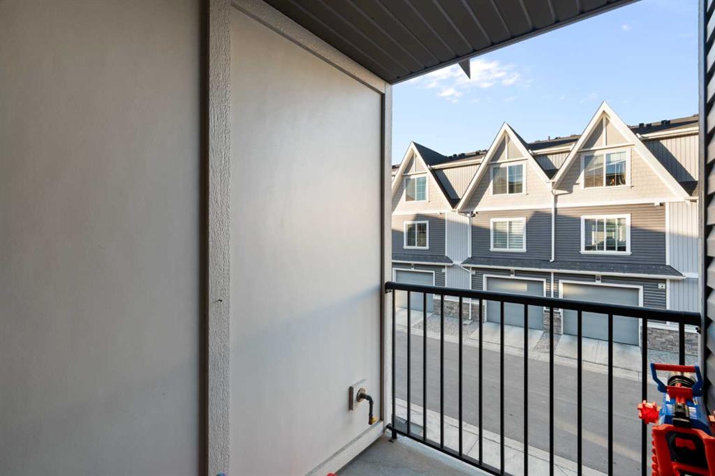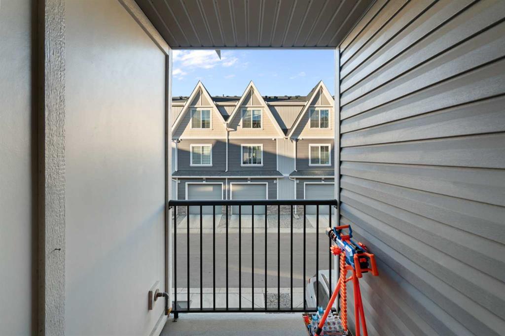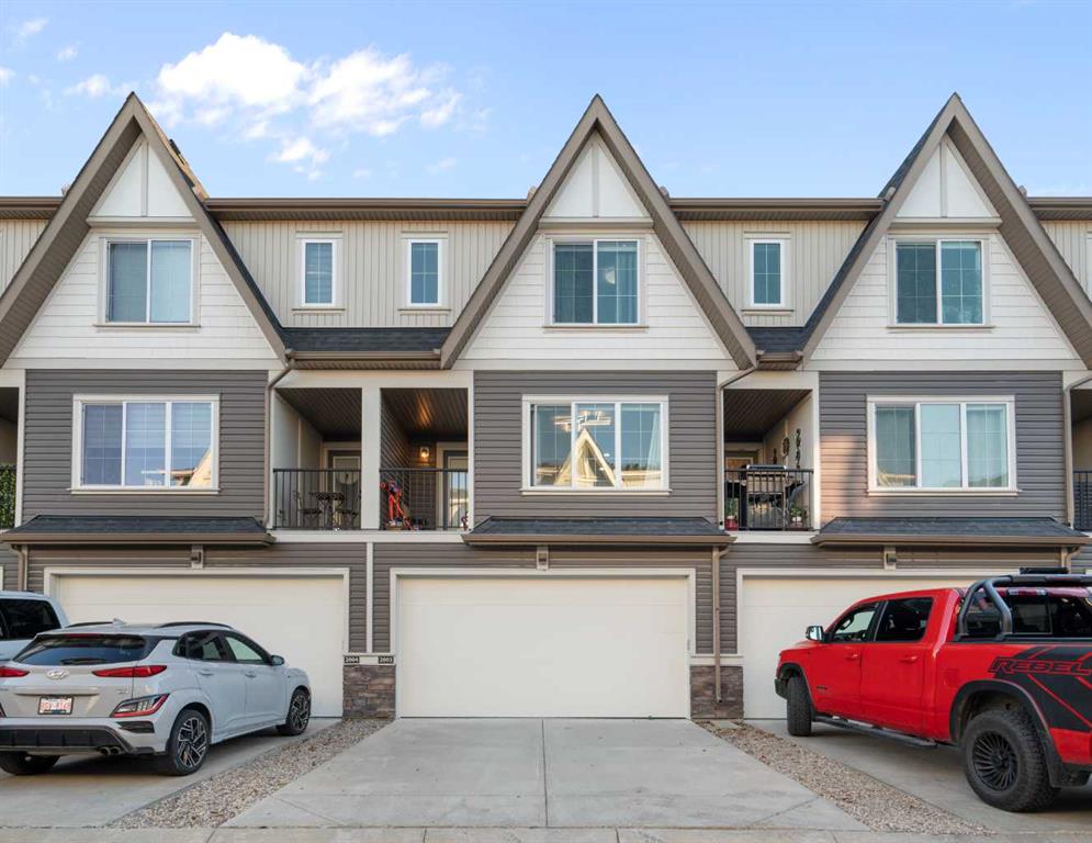Welcome to Vantage at Fireside — a modern, low-maintenance townhome community perfectly positioned within walking distance to parks, schools, and all of Fireside’s amenities. Offering over 1,420 sq. ft. of stylish living space, this three-bedroom home features an open-concept design with abundant natural light and a thoughtful layout for both comfort and functionality. The main level includes a bright south-facing patio, a flexible den or home office, and a modern kitchen complete with a large stone island, stainless steel appliances, and access to a private balcony with a natural gas BBQ line. The adjoining dining and living areas create a warm and inviting space for relaxing or entertaining. Upstairs, the spacious primary suite includes a 4-piece ensuite and walk-in closet. Two additional bedrooms, another full bathroom, and a convenient upper-floor laundry (upgraded Whirlpool washer & dryer included) complete this level. Additional highlights include an attached double garage, extended driveway with parking for two extra vehicles, window coverings throughout, and completed landscaping — ready for immediate move-in. Located steps from Bullrush Pond Park, walking paths, and a variety of local shops and restaurants, this home combines modern living with small-town charm and quick access to Highway 22 and Highway 1A for an easy commute to Calgary or the mountains.