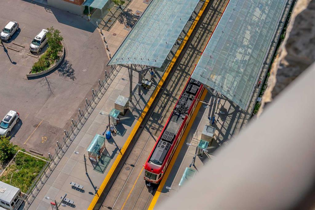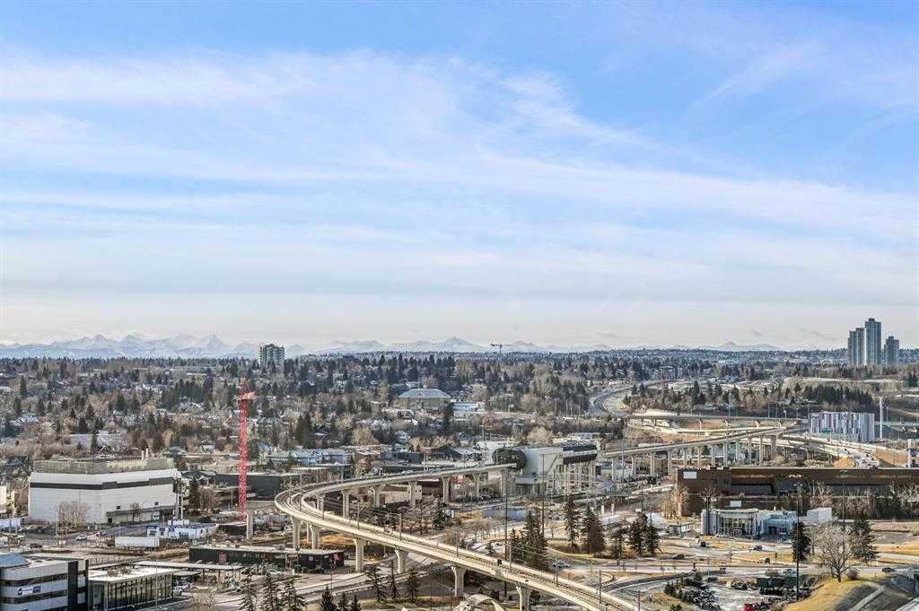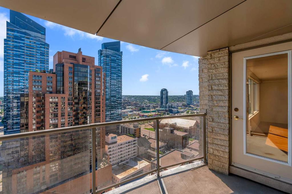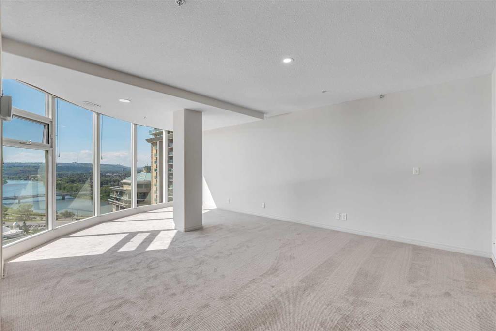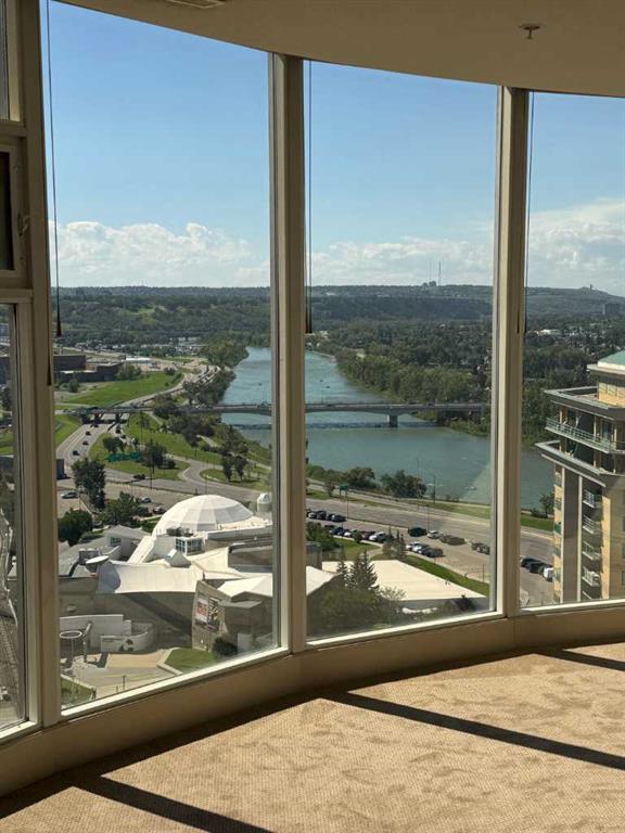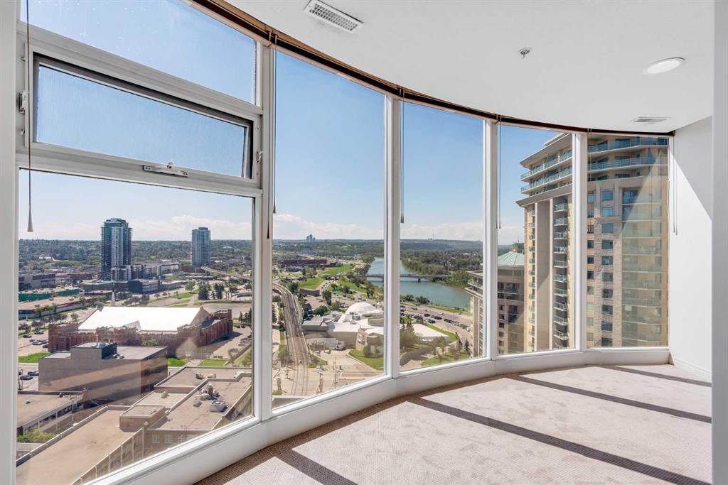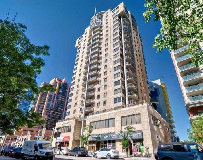 Unparalleled, Spectacular PANORAMIC VIEWS of the mountains, Bow River, and sparkling city lights! This nearly 1,600 sq. ft. luxury condo offers 2 bedrooms plus a den, 2 full baths, and 2 secure titled, underground parking stalls. Beautifully updated with hardwood floors, new carpet, fresh paint, and custom window coverings. Expansive windows fill the open living space with natural light, highlighting the raised panel cabinetry, granite countertops, pot lighting, and quality finishes throughout. Enjoy year-round comfort with full air conditioning and the sought-after south and west exposure. Ideally located in West Downtown with the Kerby LRT station right at your doorstep, and just steps to Shaw Millennium Park, river pathways, and all the conveniences of the city. Easy in-and-out access to downtown makes this the perfect urban retreat. This is the place to “right-size”!