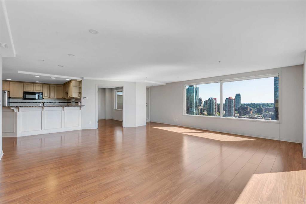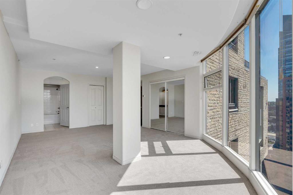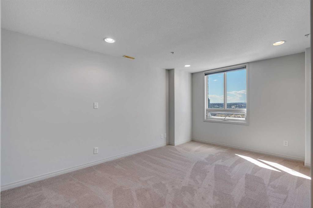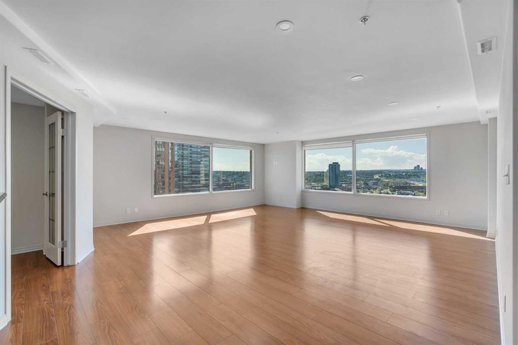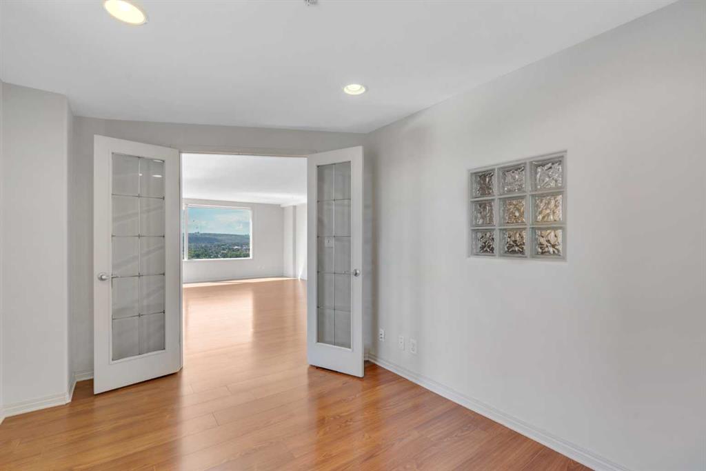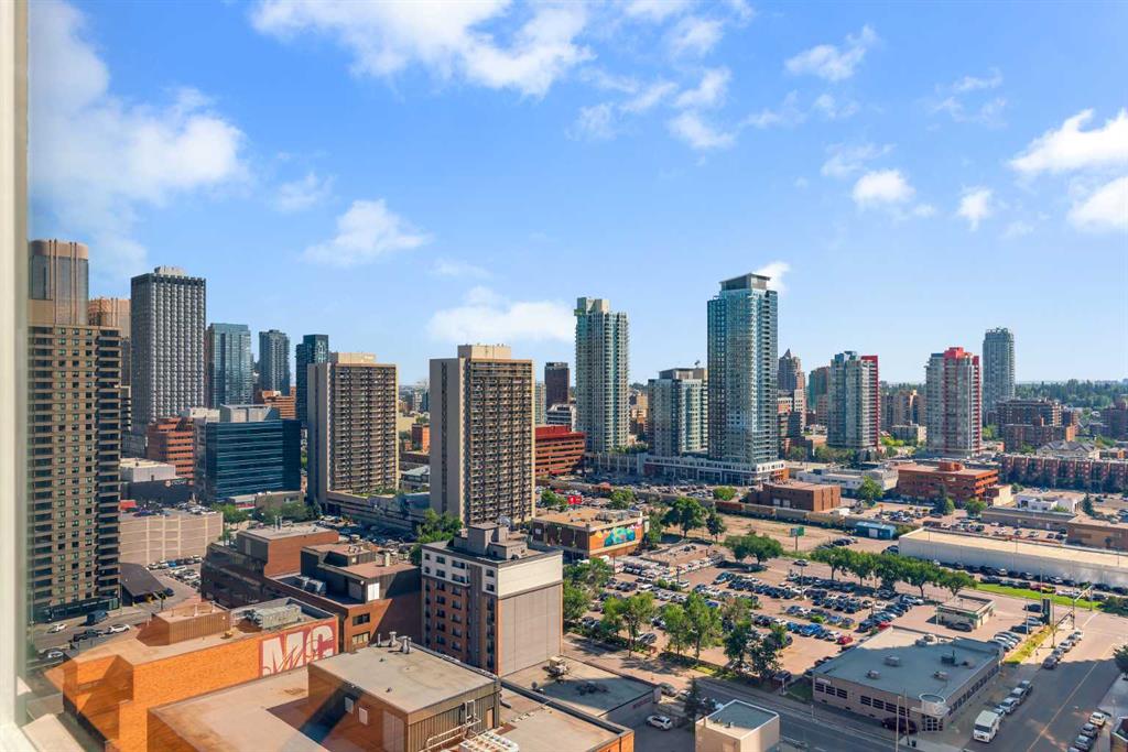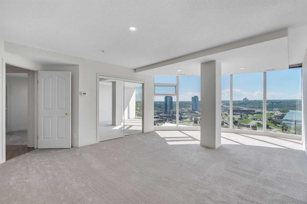Unparalleled, Spectacular PANORAMIC VIEWS of the mountains, Bow River, and sparkling city lights! This nearly 1,600 sq. ft. luxury condo offers 2 bedrooms plus a den, 2 full baths, and 2 secure titled, underground parking stalls. Beautifully updated with hardwood floors, new carpet, fresh paint, and custom window coverings. Expansive windows fill the open living space with natural light, highlighting the raised panel cabinetry, granite countertops, pot lighting, and quality finishes throughout. Enjoy year-round comfort with full air conditioning and the sought-after south and west exposure. Ideally located in West Downtown with the Kerby LRT station right at your doorstep, and just steps to Shaw Millennium Park, river pathways, and all the conveniences of the city. Easy in-and-out access to downtown makes this the perfect urban retreat. This is the place to “right-size”!