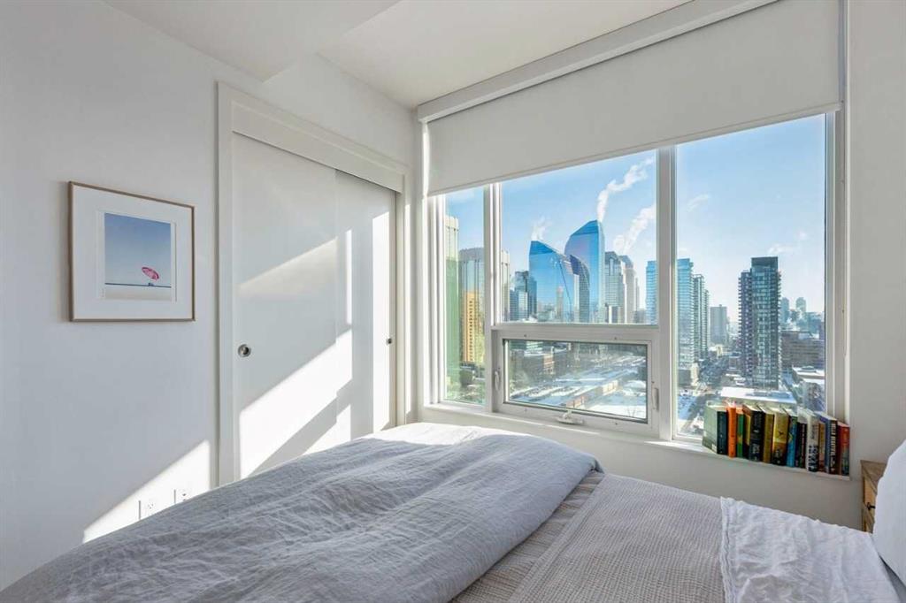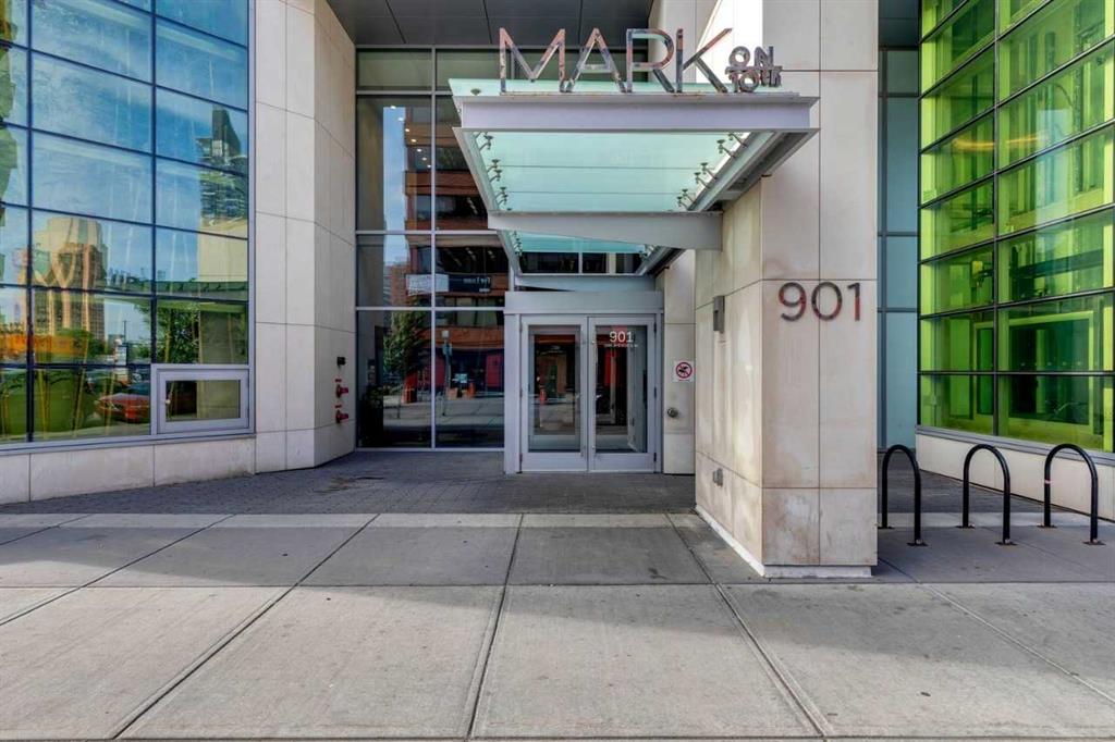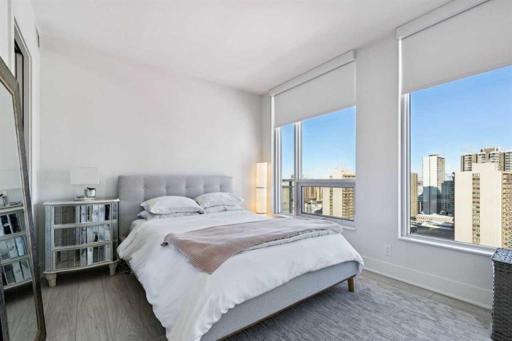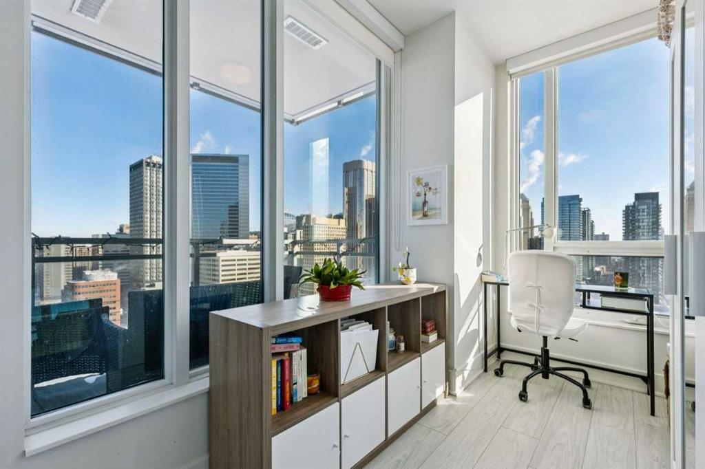 Live, work and play at The Mark on 10th. Perched on the 20th floor, this bright and spacious corner unit offers breathtaking panoramic views of Calgary’s downtown core and the vibrant Beltline. Featuring 2 bedrooms, 2 bathrooms and a private den with sliding glass doors, the thoughtfully designed 909 sq ft layout blends style and function. The contemporary kitchen is appointed with premium German appliances/cabinetry, Kohler fixtures and sleek quartz countertops. A rare titled oversized parking stall (approx. 1.5 stalls) offers exceptional space and convenience rarely found in the Beltline. A custom walk-in closet, blackout blinds in both bedrooms and a private balcony create a sophisticated retreat above the city.