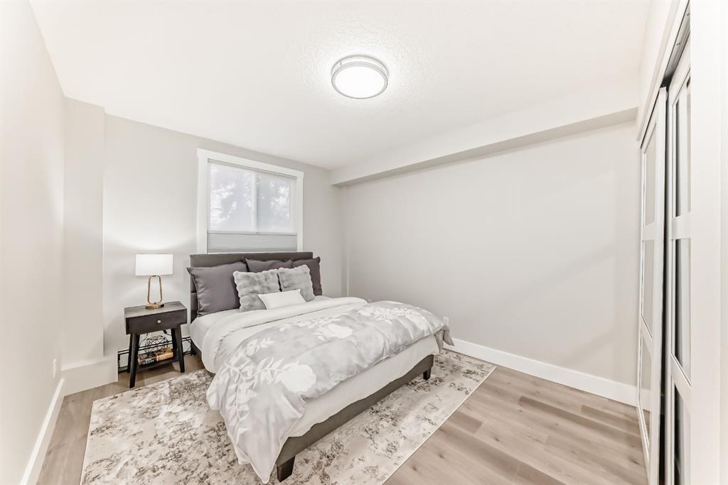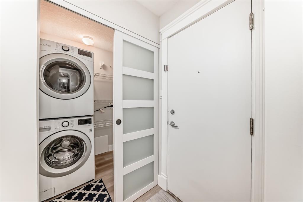 Welcome to The Kitsilano — ideally situated on a quiet, tree-lined street just one block from vibrant 17th Avenue, offering easy walking access to renowned restaurants, pubs, boutique shops, and local services. This beautifully renovated one-bedroom suite features new luxury vinyl plank flooring throughout, quartz countertops, fresh paint, and new tile in both the kitchen and bathroom. The open-concept layout is thoughtfully designed, with a modern kitchen showcasing professionally painted maple shaker cabinets that open seamlessly to the dining and living areas. From there, step out onto your north-facing balcony overlooking the charming front street. The suite also includes an in-suite front-loading washer and dryer conveniently located in a large storage room off the front entrance. The spacious, updated bathroom offers a deep soaker tub with elegant tile surround. The bedroom provides generous closet space and a large window for natural light. Additional highlights include a dedicated parking stall at the rear of the building and pet-friendly policies (one dog or two cats, up to 15 kg each, with board approval). This well-managed concrete building features very reasonable condo fees that include all utilities except electricity. Offering an unbeatable lifestyle in one of Calgary’s most desirable locations, this suite is move-in ready. Previously used as a rental prior to the renovation — furniture is available for negotiation.