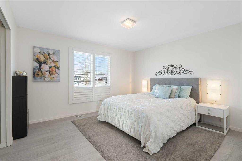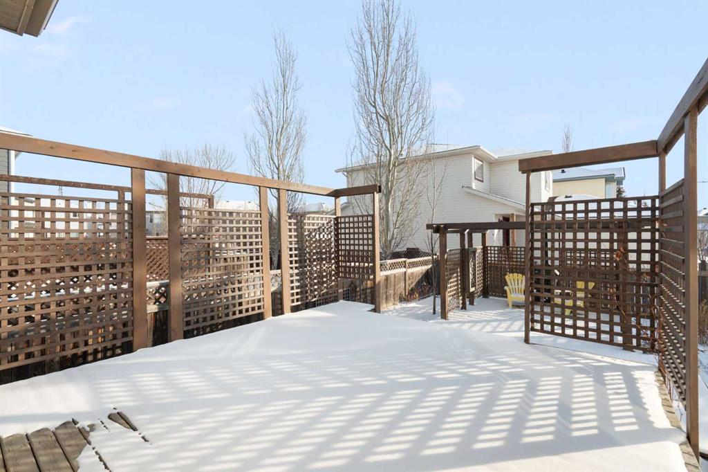 Welcome to this beautifully updated, spotless, 3-bedroom, 2.5-bath family home located on a corner lot in the desirable community of Harvest Hills, with the added bonus of NO sidewalks (on the side) to shovel. Offering fantastic curb appeal, the home features brand new siding, roof, soffits, fascia, and a new garage door on the double detached garage. Step inside from the front deck into a spacious foyer with abundant storage and a conveniently tucked-away main floor powder room. The contemporary open-concept layout showcases a stylish kitchen with new white cabinetry that flows seamlessly into the living room and dining area, where large south-facing windows fill the space with natural light. A sit up breakfast bar is perfect for entertaining! A french door off the dining room leads to the expansive deck and beautifully fenced, landscaped backyard, creating an incredible extension of living space perfect for summer enjoyment. Upstairs, you’ll find three generously sized bedrooms with ample closet spaces, and a four piece bathroom. The fully developed basement offers even more living space with a large family recreation room, full bathroom, and laundry area. A fourth bedroom could be easily added to the large, open space. Thoughtfully upgraded throughout and truly move-in ready, this home is an exceptional and rare find in a welcoming community close to major roadways, shopping, and amenities.
