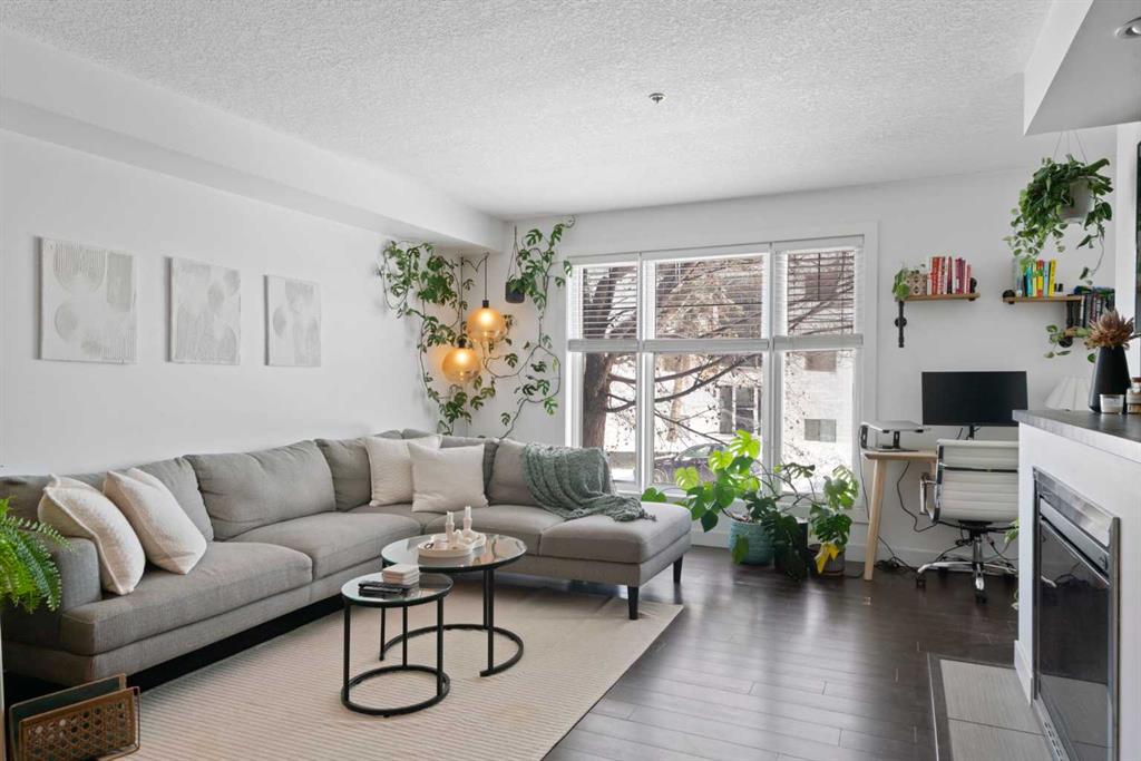 Welcome to this beautifully upgraded condo in one of Calgary’s most sought-after inner-city neighbourhoods. Thoughtfully designed with a modern open-concept layout, this home immediately impresses with rich hardwood floors, soaring windows that flood the space with natural light, and a cozy gas fireplace that anchors the living room.