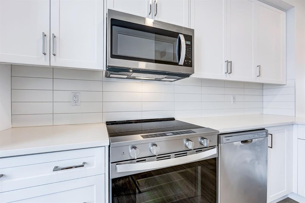Upstairs, the open-concept main floor is all about natural light and flow. A modern kitchen anchors the space with quartz counters, sleek cabinetry, stainless steel appliances, and a peninsula perfect for quick breakfasts, meal prep, or evening wine with friends. The adjoining dining and living areas create a comfortable, cohesive space for hosting or unwinding. A private balcony expands your living area outdoors, perfect for coffee, fresh air, or grilling.