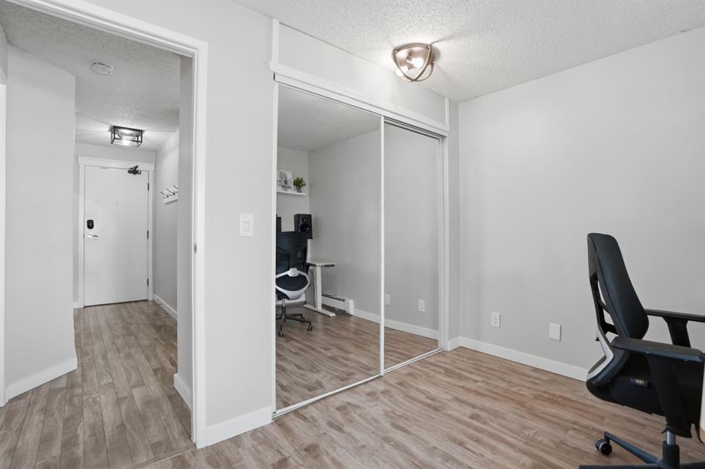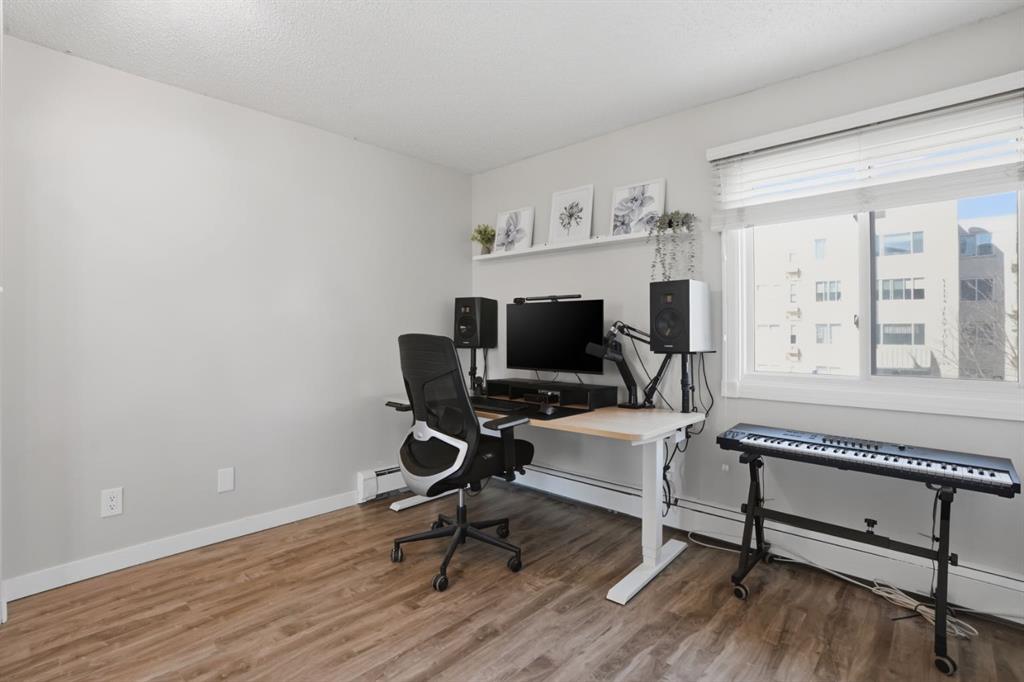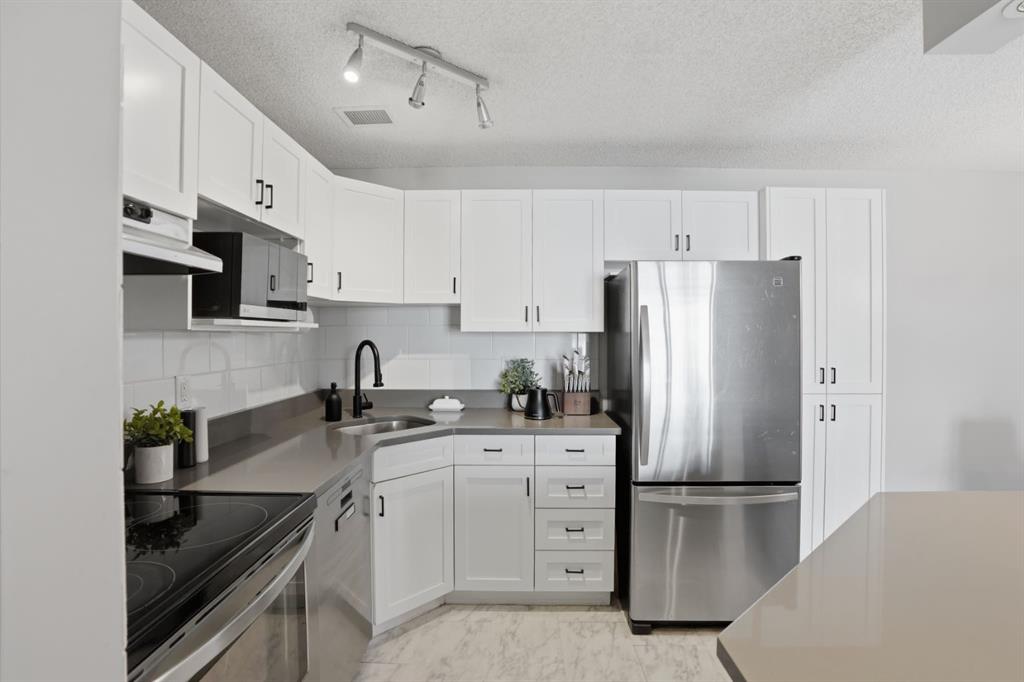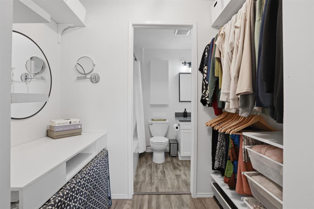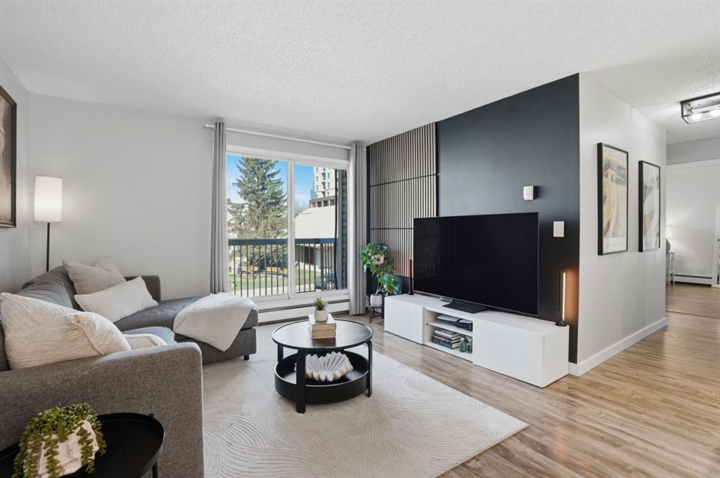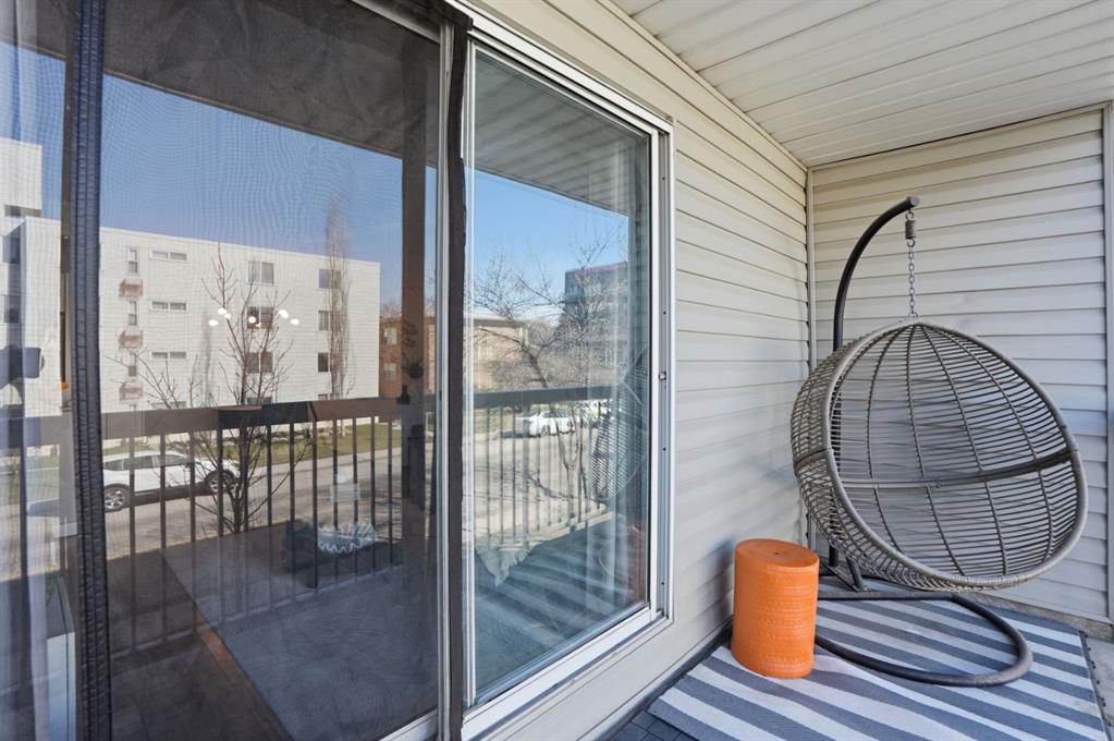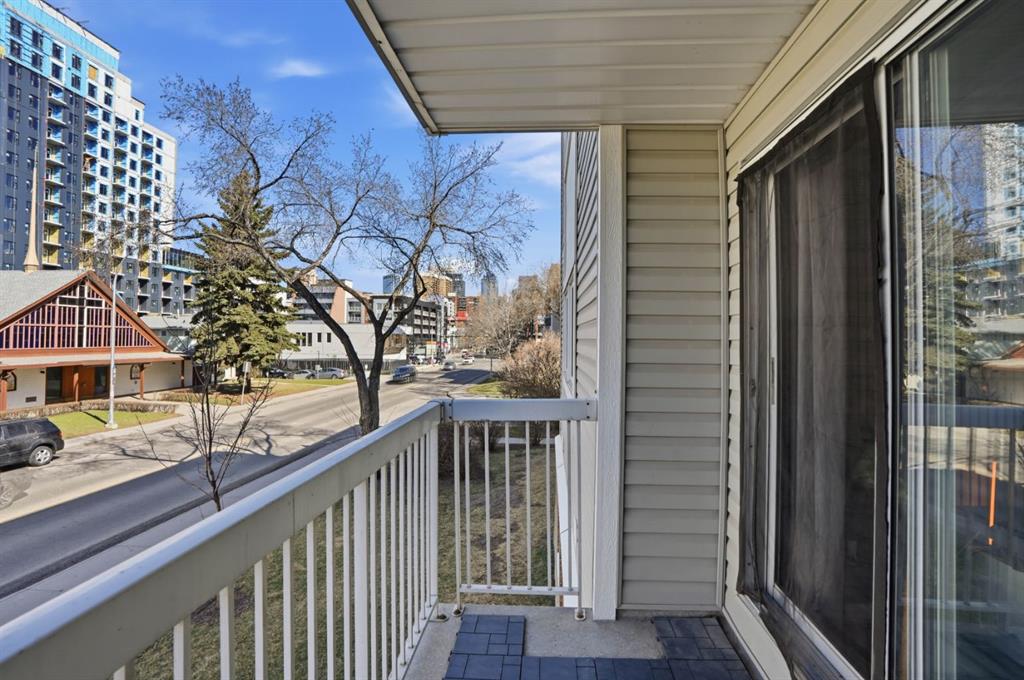 The open-concept layout is light and airy from the moment you walk in. The white kitchen is the heart of the space, featuring stone countertops, white tile backsplash, stainless steel appliances, and updated light fixtures that give the whole unit a fresh, modern feel. There is plenty of counter space for cooking and enough room to actually enjoy the kitchen. The slat wall feature in the living room adds warmth and character without being overdone, and the natural light that moves through the space all day makes every room feel spacious. Step outside to your west-facing balcony and you have a genuine spot to exhale. Afternoon sun, fresh air, and a view that reminds you why you chose inner-city living in the first place. Whether it is morning coffee or an evening wind-down, this balcony gives you dedicated outdoor space.