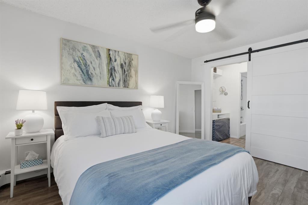 The large primary bedroom is a proper retreat. A walk-through closet with a barn door detail leads directly into the updated bathroom, giving the space a layout that just makes sense. The second bedroom is flexible enough to work as a guest room, a home office, or additional living space depending on what your life actually looks like right now.