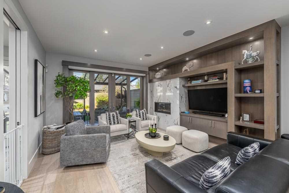 The living room feels open yet cozy, anchored by custom shelving and 8-foot sliding glass doors that lead to a spacious rear patio featuring a $10k glass-top pergola, the ultimate space for entertaining or relaxing in the summer evenings.