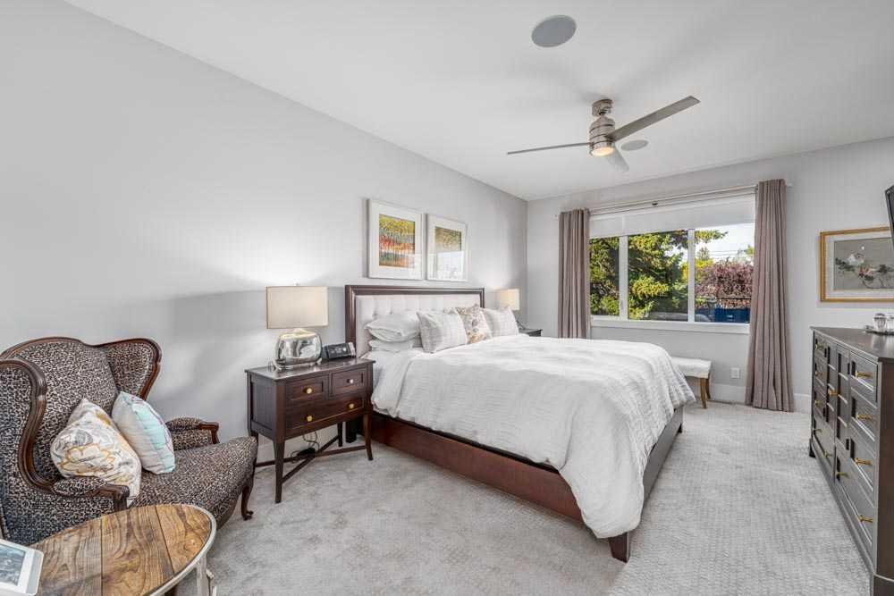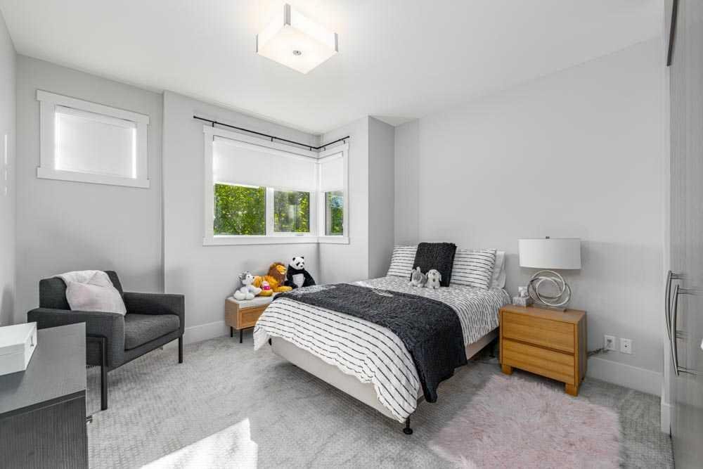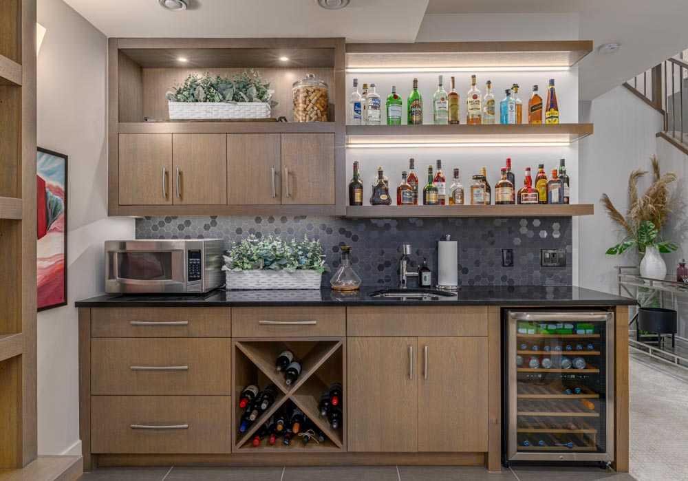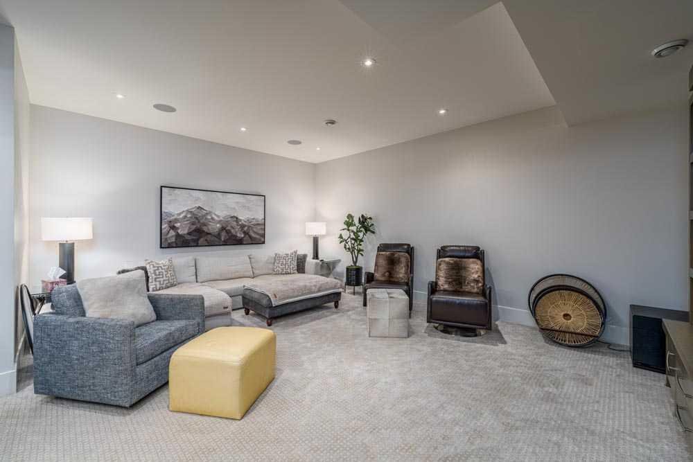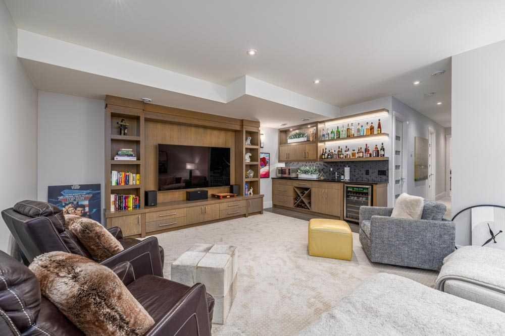 Downstairs, the lower level continues to impress. An expansive media room with wall-to-wall custom built-ins, surround sound, and a wet bar finished with black granite and shelving. There’s also a flex room with cork flooring, a spacious guest bedroom, and a 4-piece bath.