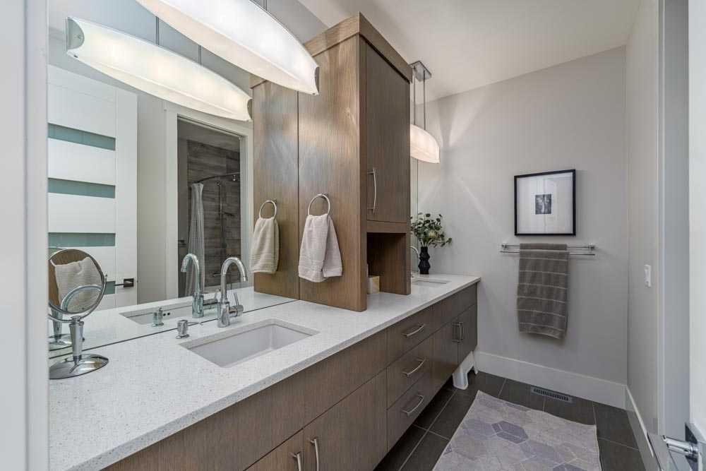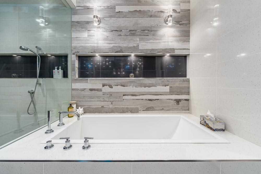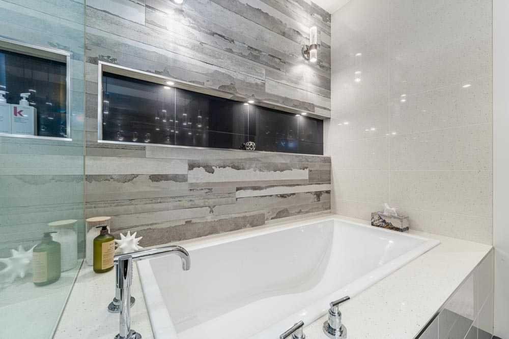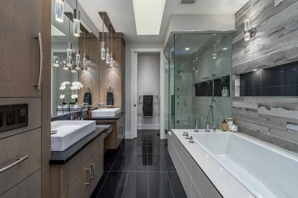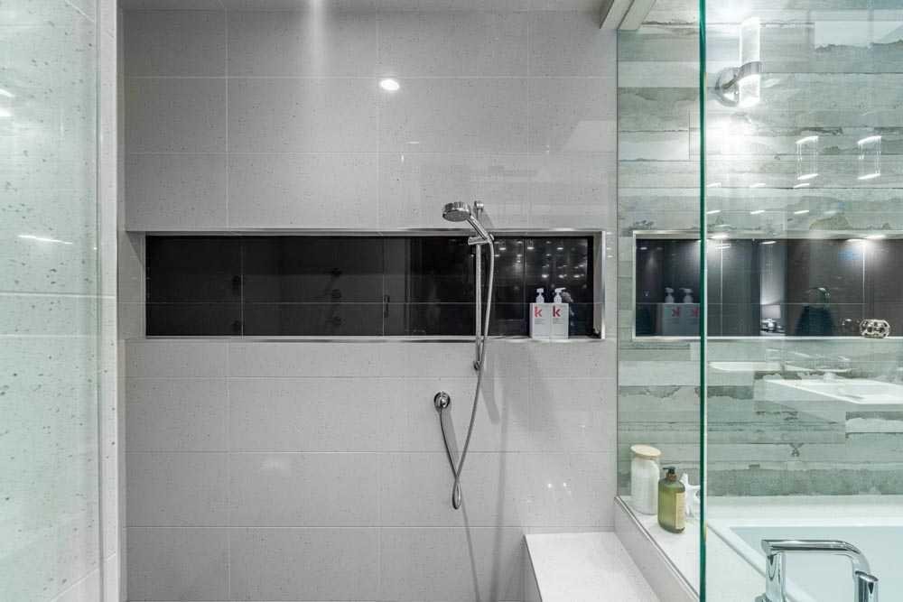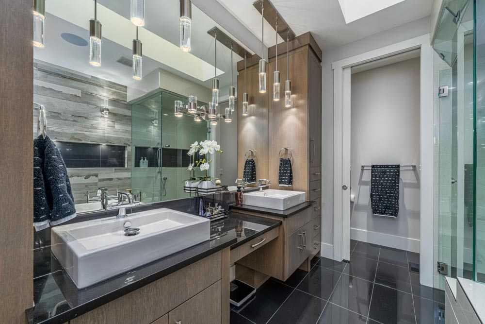 Upstairs, the primary suite is your private retreat. A beautiful dressing area featuring custom built-in his-and-hers closets. The ensuite rivals a luxury hotel: heated floors, dual vessel sinks, a curbless steam shower with body sprays and rain shower, and a soaker tub set against a tiled feature wall under a skylight. It’s the kind of bathroom that makes you look forward to mornings or never leaving at all.
