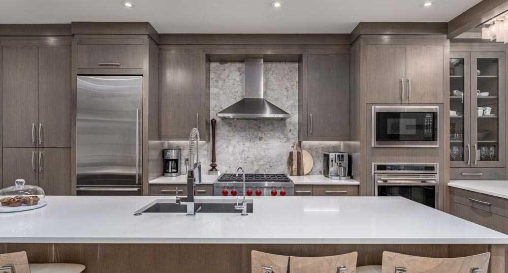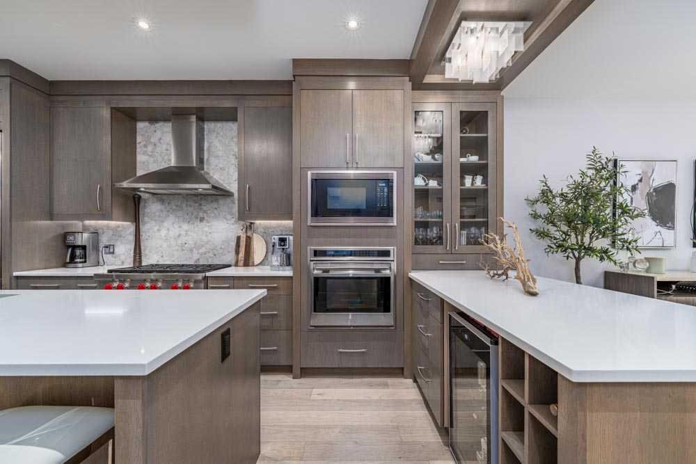 At the heart of the home, the gourmet kitchen is a showstopper. Two expansive quartz islands, professional SS appliances including a 6-burner gas range and white-oak cabinetry with custom stain and under-cabinet lighting.