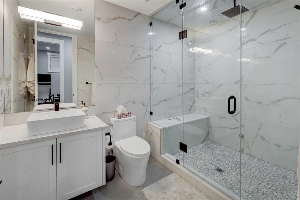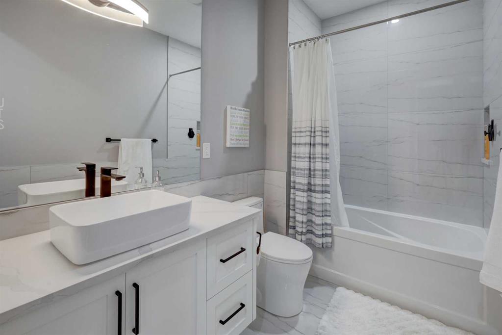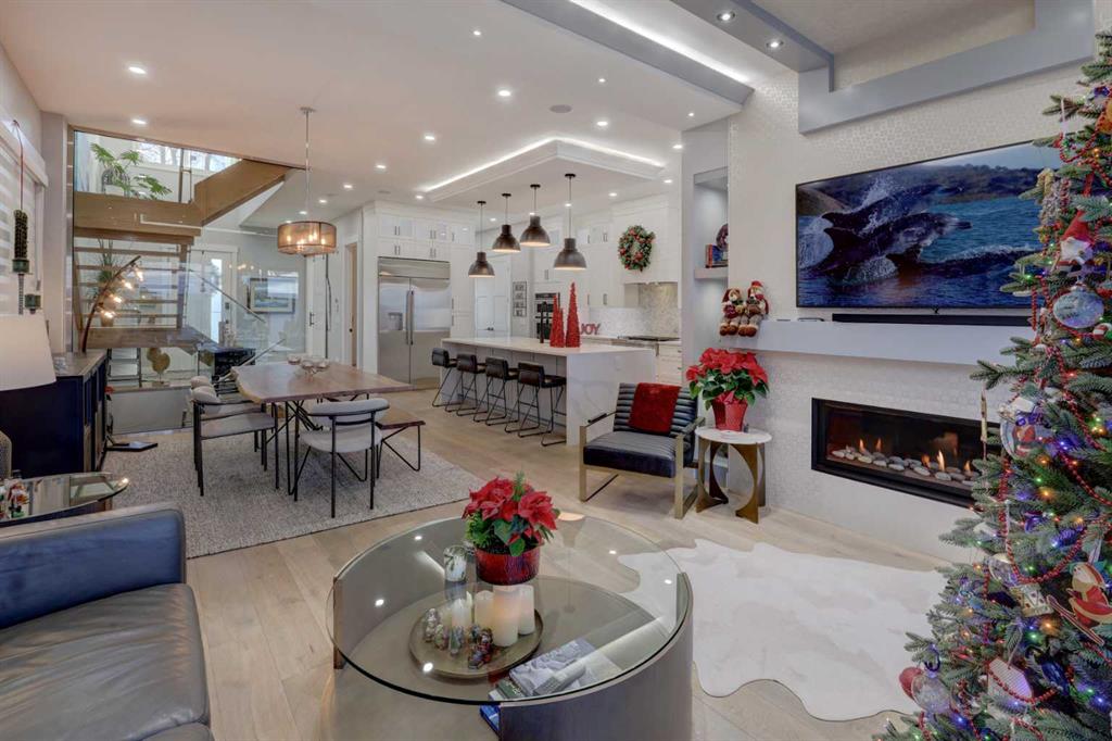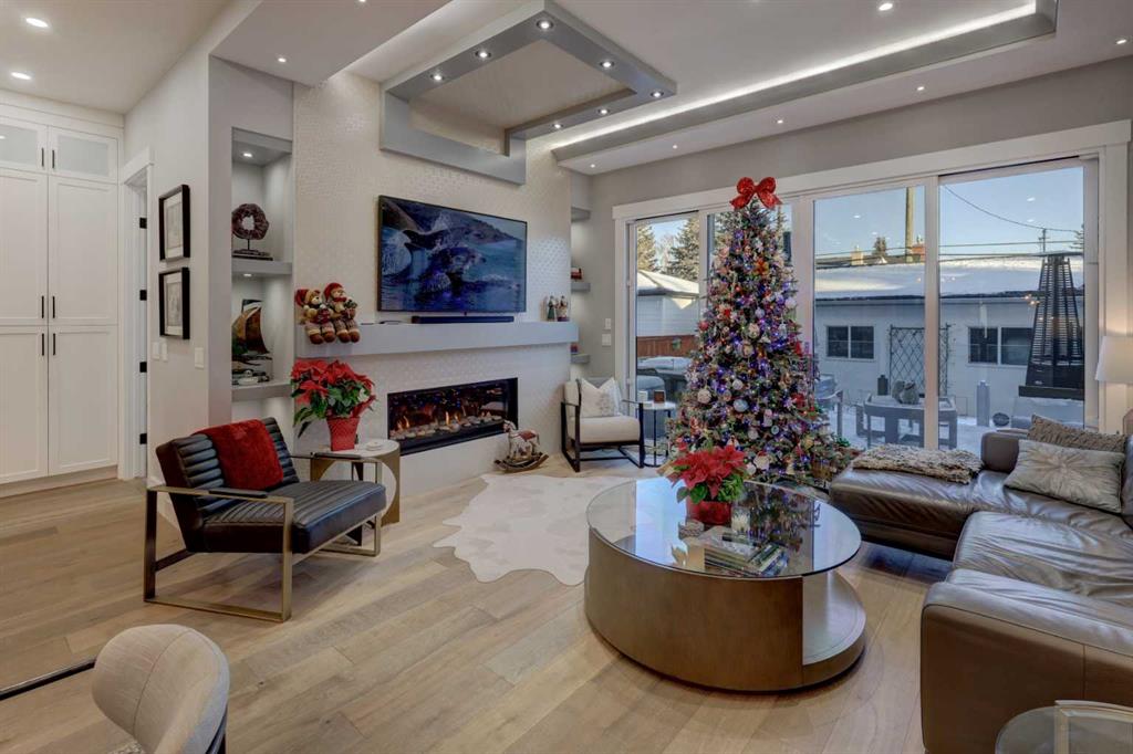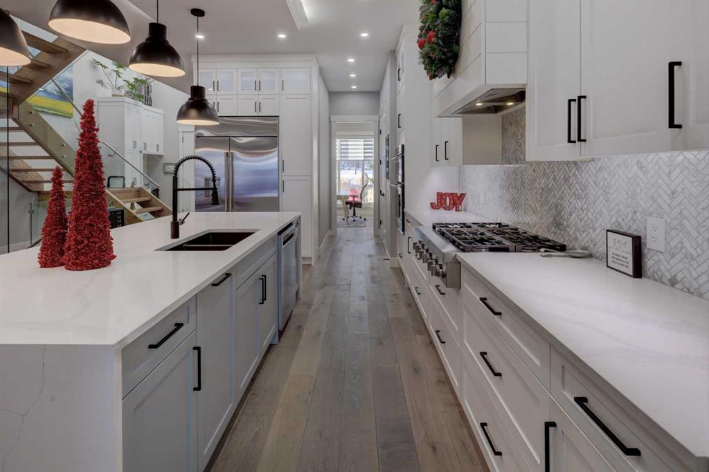 Stunning custom-built executive home with over 3500 Square feet of developed living space including FOUR bedrooms, FOUR full baths, a professionally developed basement, and heated TRIPLE-car garage, ideally located across from a park in Killarney. Stylish exterior with custom stone accents, gemstone lighting and inviting front patio. Open-concept design with neutral tones, 9’ & 10’ ceilings, wide-plank hardwood flooring, custom mouldings, barn doors, and Hunter Douglas blinds throughout. Chef-inspired kitchen features a six-burner gas range, professional stainless appliances, waterfall countertops, ample white cabinetry, and designer lighting. Spacious living room with gas fireplace and tray ceiling opens to a large deck, saltwater hot tub, and fully fenced yard. Show-stopping foyer with custom locker storage and open-riser staircase with glass railings, plus main-floor powder room and mudroom. Primary retreat offers vaulted ceilings, luxurious 5-piece ensuite with heated floors, floating double vanity, soaker tub, walk-in closet, and private outdoor seating area. Two additional upper bedrooms each include ensuite baths, plus upper-floor laundry. Entertainer’s basement features wet bar, fourth bedroom, fourth bath with heated floors, wine cellar, gym, and ample storage. Professionally landscaped low-maintenance yard with irrigation, artificial turf and radon mitigation. This is the perfect family home in a great location just minutes to downtown, close to shops and all amenities including schools & parks.