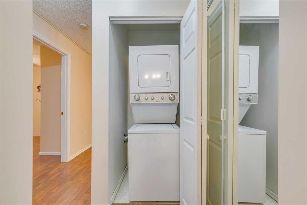 OPEN HOUSE NOV 15th 2-4pm! Welcome home to this bright and inviting, 2-bedroom, south-facing condo , drenched in natural light from morning to evening. Enjoy the generous balcony overlooking mature trees that provide both privacy and a lovely, peaceful outdoor view. Stay cool during warm summer days with the added comfort of AIR CONDITIONING, the functional floor plan includes a full in-suite laundry area with stacking washer/dryer and a large storage room to keep everything organized. The pride of ownership is evident – this freshly painted unit is exceptionally well cared for. Attractive laminate flooring spans the home, and the kitchen features tasteful cabinet and countertop updates, along with quality appliances including a Whirlpool microwave and fridge, Maytag stove, and Frigidaire dishwasher. A spacious front coat closet adds even more convenience. Both bedrooms are well-proportioned, and the bathroom offers excellent storage options , this is a rare find. Located in Dover, this condo provides quick access to Deerfoot Trail for an easy 10–15 minute commute into downtown or to other major areas of the city. You are also just moments from the ridge and a short walk to the Bow River pathway perfect for nature lovers, cycling, and daily walks. Nearby Co-op shopping adds to the convenience. The complex boasts mature landscaping and tall trees, contributing to a serene environment. You’ll also appreciate accessible parking, clean garbage facilities, and plenty of visitor parking for your guests. A bright, well-located, and affordable opportunity ideal for those seeking comfort, convenience, and value, whether you’re an investor or looking for your future home.
