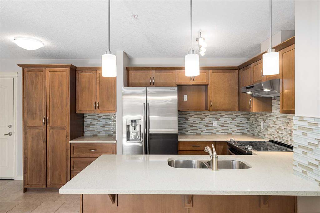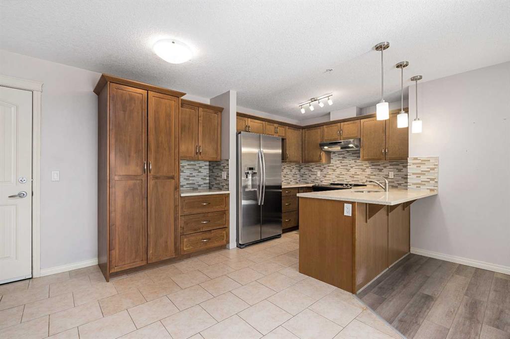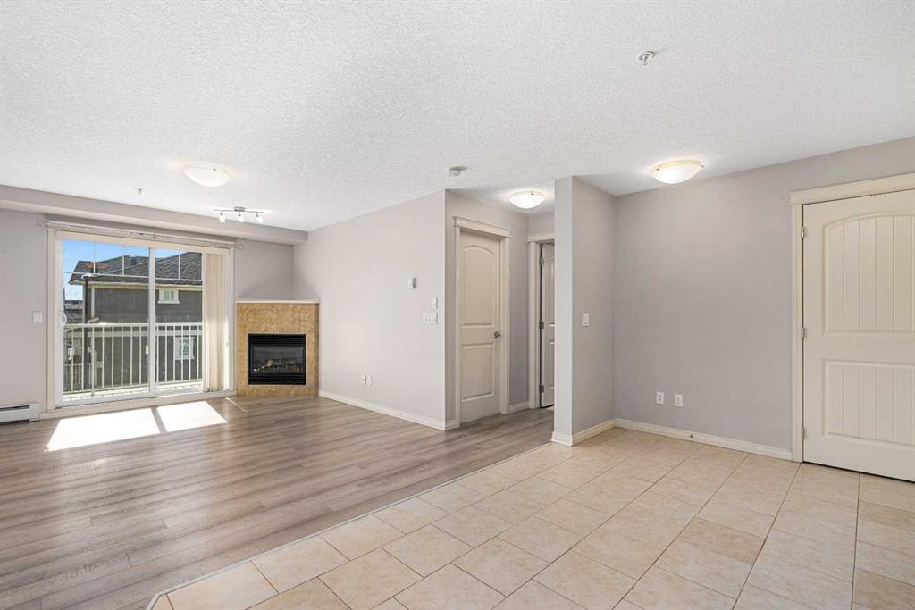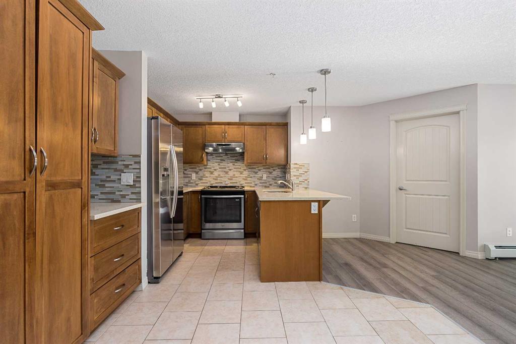 The kitchen features rich maple cabinetry, stainless steel appliances, modern tile backsplash, and a convenient peninsula with additional seating. The spacious living room is filled with natural light and offers a cozy corner gas fireplace with direct access to the private balcony — perfect for relaxing or enjoying your morning coffee.