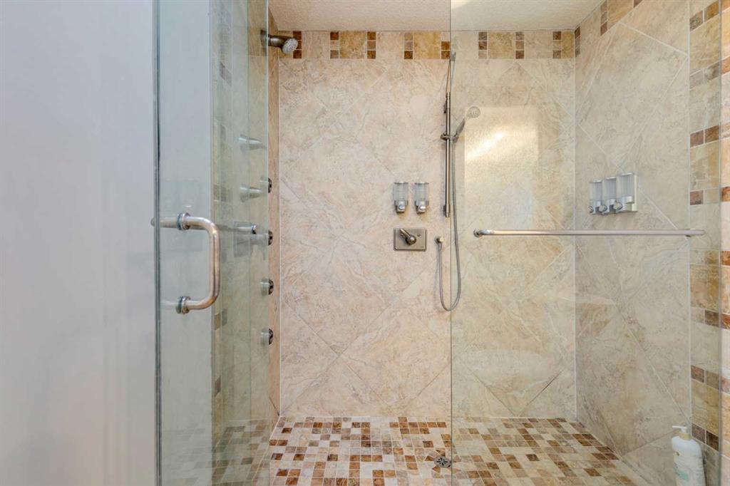 Heading up to the second level, you’ll find three comfortable bedrooms. The primary suite overlooks the private backyard and features a luxurious ensuite with an oversized walk-in shower, rain head, and four body sprays. Two additional generously sized bedrooms, each with deep closets and large windows, share a beautifully finished 4-piece bathroom boasting custom vanities, floor-to-ceiling travertine tile, and a glass-enclosed soaker tub/shower.