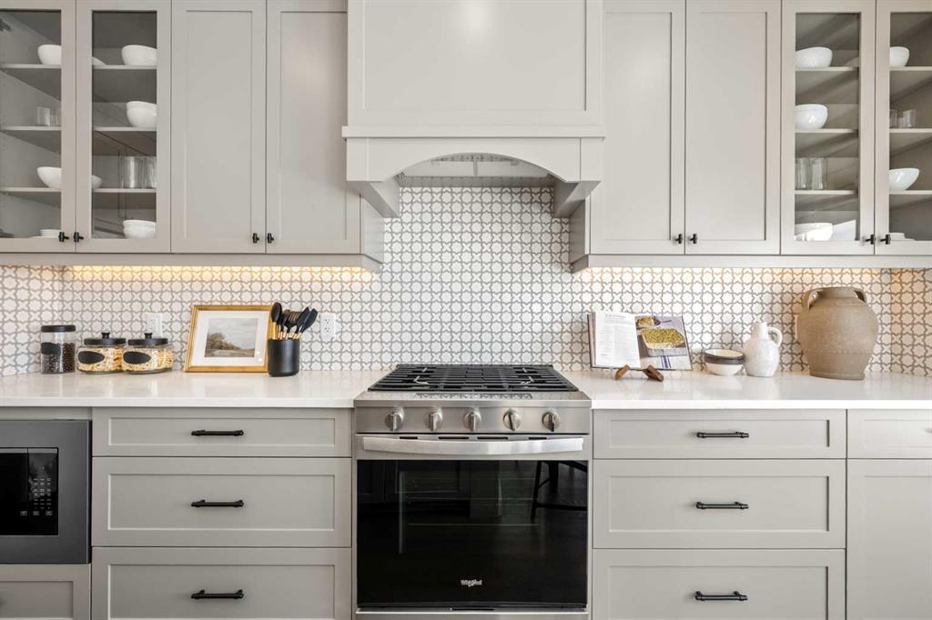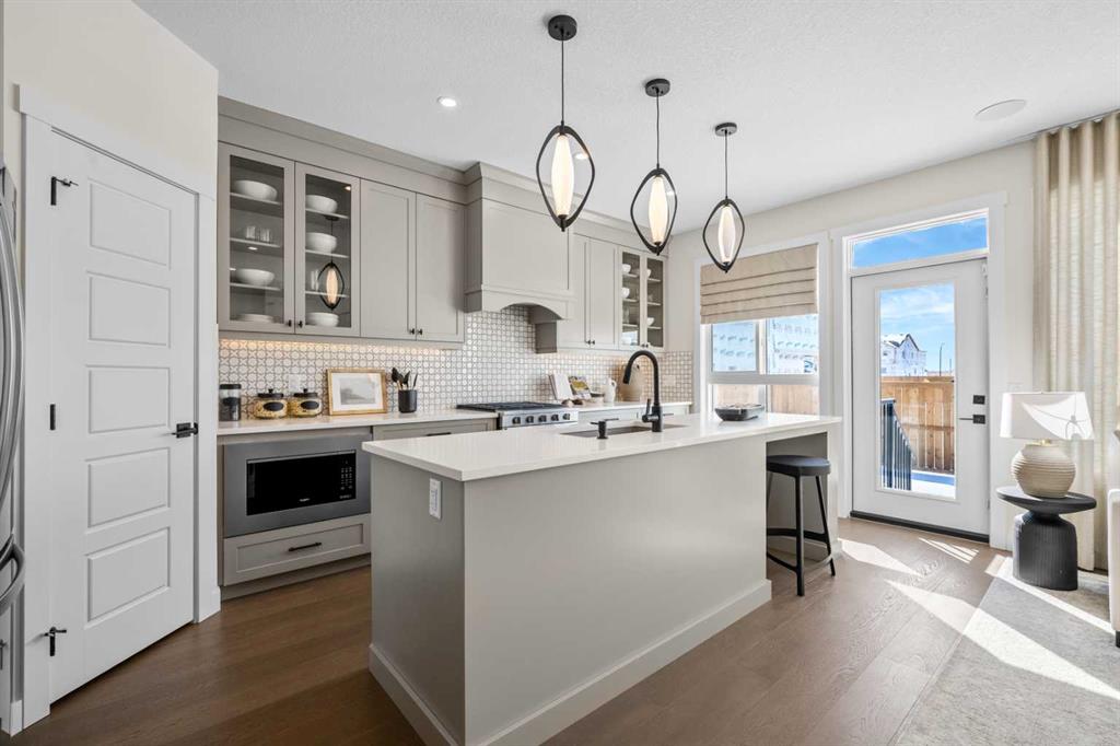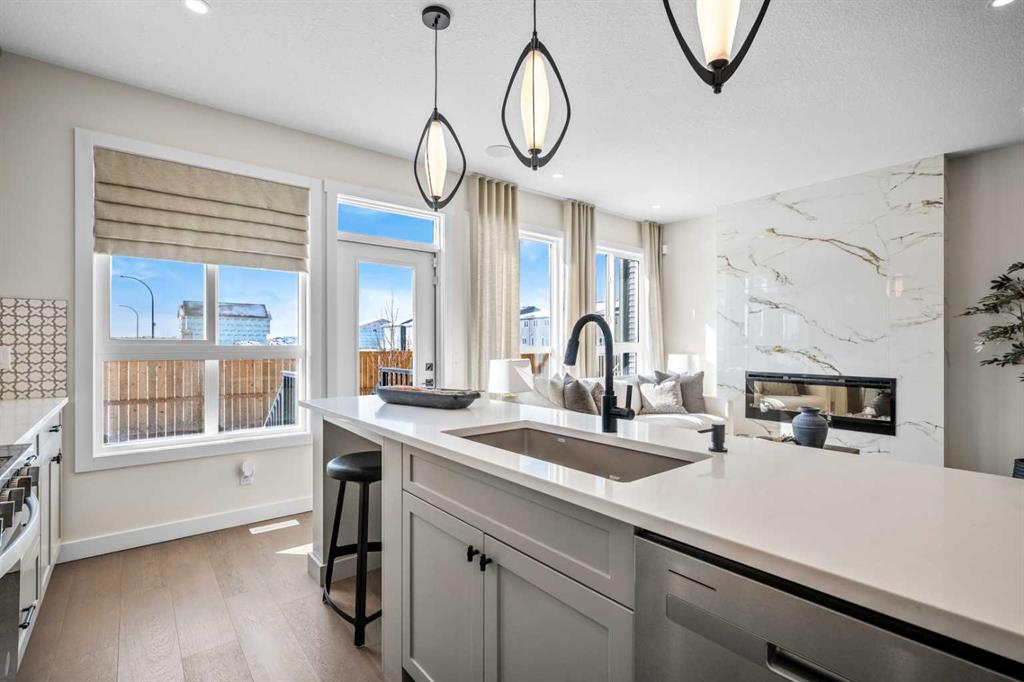 The main floor showcases a bright open-concept layout designed for both everyday living and entertaining. Large windows allow natural light to flow throughout the space, enhancing the home’s inviting atmosphere. The well-appointed kitchen features 42” upper cabinetry with crown moulding, quartz countertops, a spacious island with breakfast bar seating, pantry storage, gas stove, and modern finishes, creating a stylish and functional hub for the home. The adjacent dining and living areas provide seamless flow, while the electric fireplace in the great room adds warmth and a modern focal point. A versatile main floor flex room offers the flexibility to be used as a home office, guest space, or study area. A convenient powder room and BBQ gas line enhance both practicality and outdoor entertaining options.