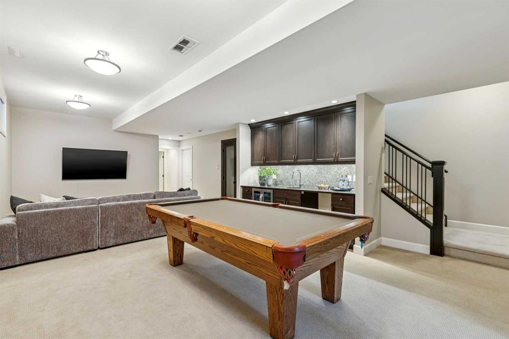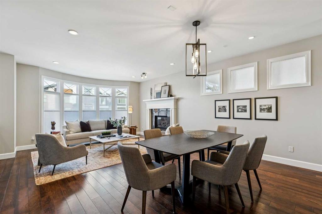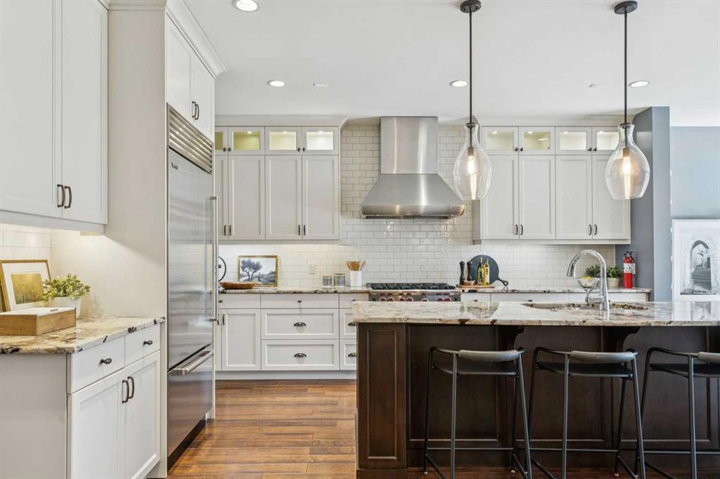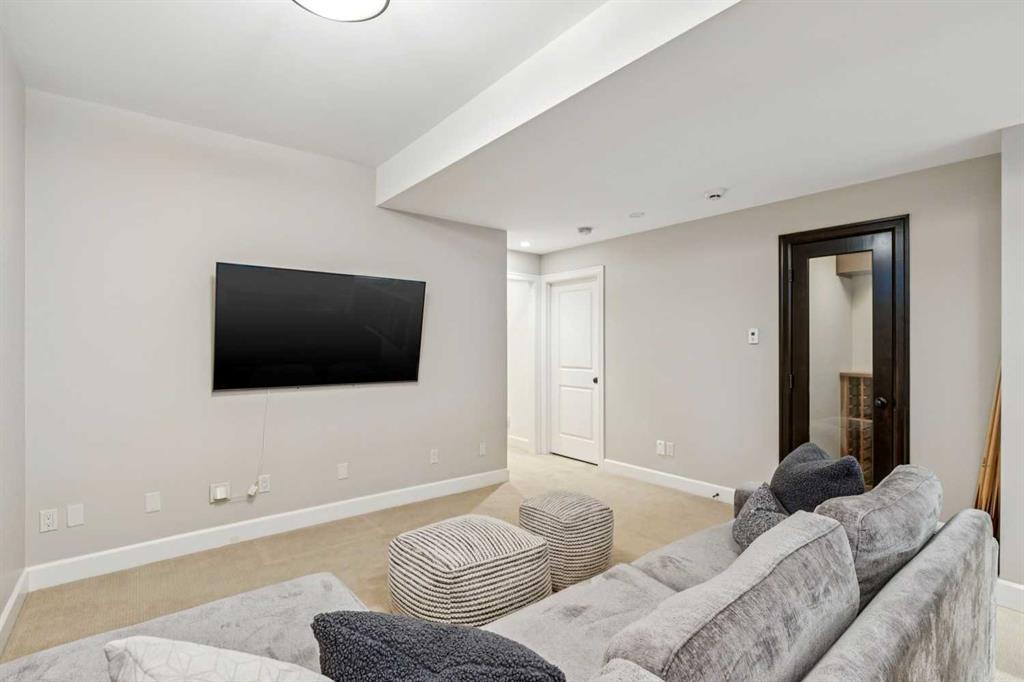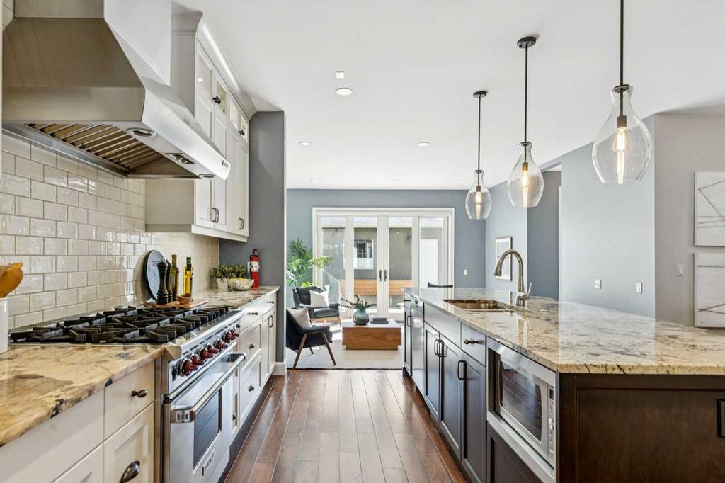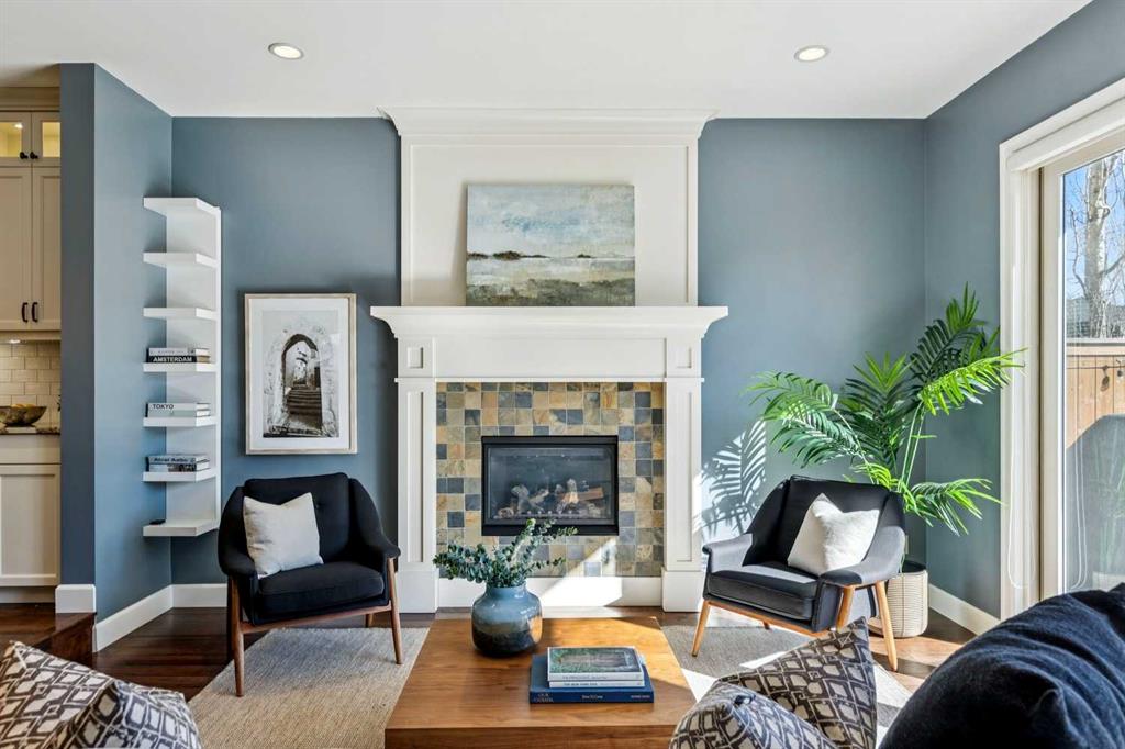 **Open House Saturday March 21 – 2:30 – 4pm** Situated on a popular street, this elegant residence offers a sunny south-facing backyard + impressive city views. Substantial in size with 3,400 sq ft above grade + a fully developed walk-up lower level, the home delivers generous scale + a thoughtfully designed layout throughout. Spacious principal rooms are complemented by rich wide planked hardwood flooring on the main level. The entrance opens into a pleasing living room/dining room entertaining space with large picture window + gas fireplace + transitions to a comfortable heart of the home kitchen/great room with a convenient office nook that is ideally positioned just off the kitchen. The chef’s kitchen is well-appointed with professional-grade appliances, including a Wolf gas stove + Sub-Zero refrigerator, along with custom cabinetry, granite countertops, abundant storage + prep space, a large island + informal dining area. The adjoining great room features a fireplace + easy access through patio doors to the pretty south facing backyard with concrete patio + lawn as well as a double detached garage. On the second level there are three substantial bedrooms, a very large office space which easily could be an additional bedroom + a dedicated laundry room. The primary bedroom is a refined retreat, complete with a double-sided fireplace, dressing room + a spa-inspired ensuite featuring a soaker tub, standalone rainfall shower + large dual vanities with ample storage. A generous third level lounge with both front + rear balconies showcases mountain + city views. The fully developed lower level includes an additional guest bedroom, a full bath, gym, expansive entertaining space, wet bar + temperature controlled wine room. Ideally located close to restaurants, shopping, parks, playgrounds + the library, this home combines comfort, function + lifestyle in a desirable inner-city setting.