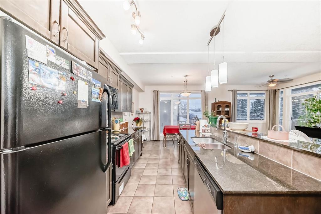 Welcome to the 141 Mountain Street Condos! This corner unit comes with TWO assigned parking stalls. Situated at the back of the building, the condo is whisper quiet and private.. The large, balcony has a partial mountain view. The large open living areas are bathed in natural light. Freshly painted throughout and sparkling clean, this condo has great spaces for entertaining. The kitchen is open with plenty of storage and storage options. The granite counter and island is perfect for baking and prep. Living room and dining room are generously sized. A gas fireplace with tile surround provides a focal point and a cozy spot to relax and enjoy the views. The home boast of 2 huge bedrooms, 4 piece ensuite includes dual granite topped sinks, huge walk through closet and storage. The Parking is heated and secure with visitor and accessible parking for your guests. You will love the convenience of being within walking distance to all amenities in downtown Cochrane. This location provide quick access to the mountains and all quadrants of Calgary via Crowchild Trail or Highway 1. The Tuscany C Train station is a quick drive that also gives good access. This building is well managed by the proactive condo board. You will love this beautiful space in central Cochrane!
