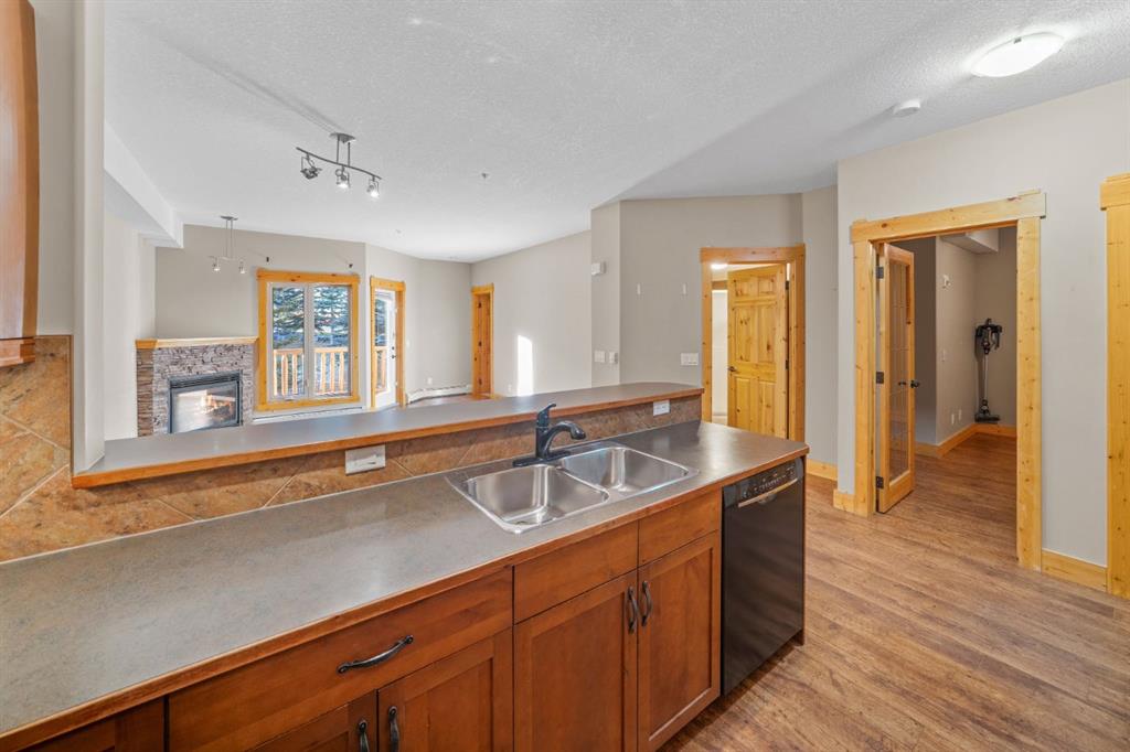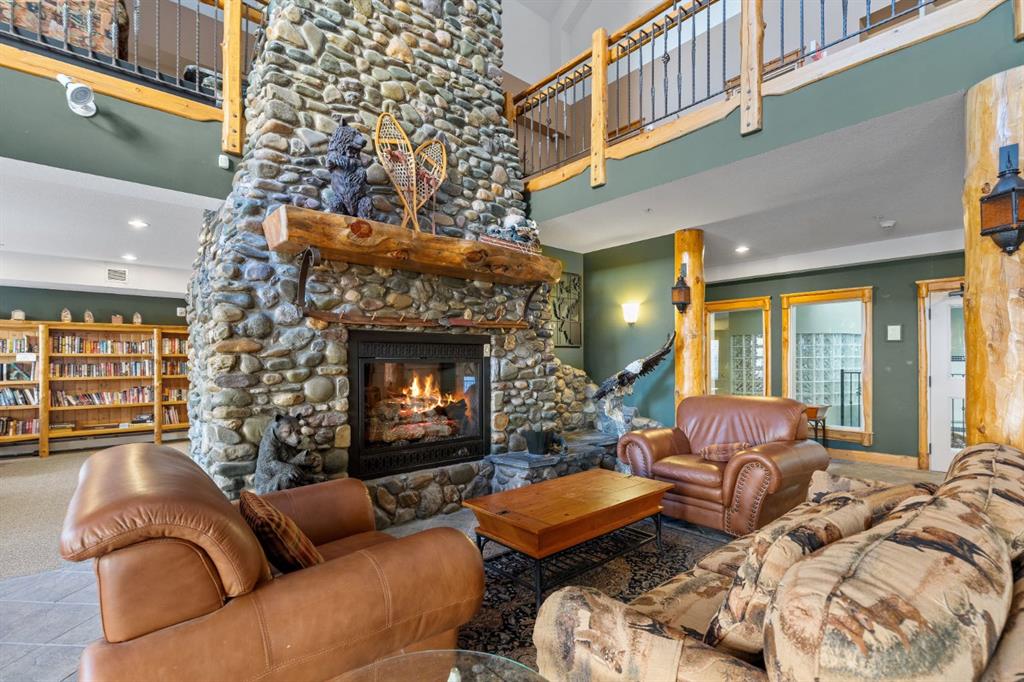 Natural light fills the open-concept living area through expansive windows, while the private balcony provides the perfect place to enjoy morning coffee or evening alpenglow over the peaks. The well-appointed kitchen and generous dining area create a warm gathering space for friends and family, complemented by a cozy living room anchored by a gas fireplace.