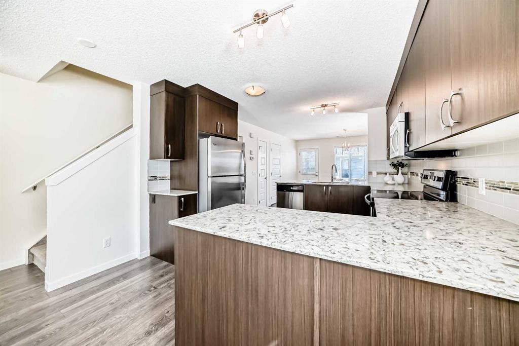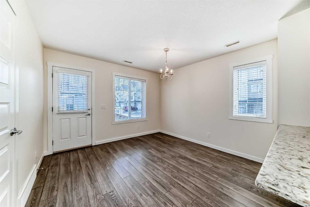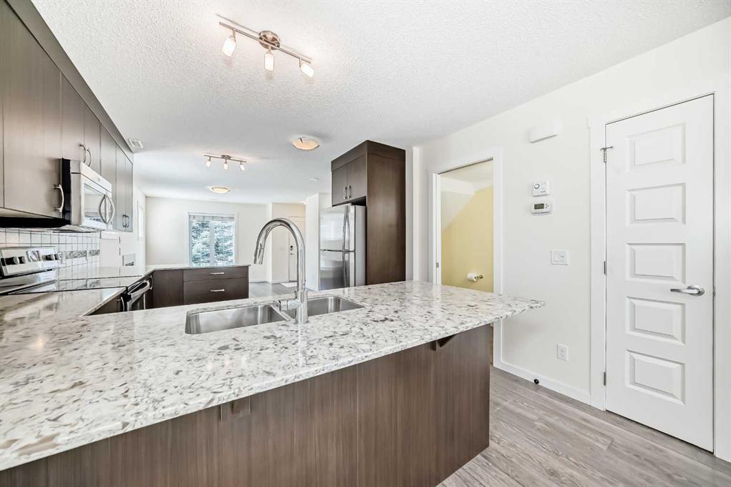 This bright end unit sets itself apart the moment you walk in — extra windows pour natural light across freshly painted walls and laminate flooring that flows throughout the open-concept main floor. Gather around the gas fireplace on a crisp Calgary evening, then step into a kitchen built for people who actually love to cook: expansive granite countertops, abundant cupboards, stainless steel appliances, and counter seating perfect for morning coffee. The spacious dining room overlooks your private backyard, and a pantry plus tucked-away half bath round out the main level.