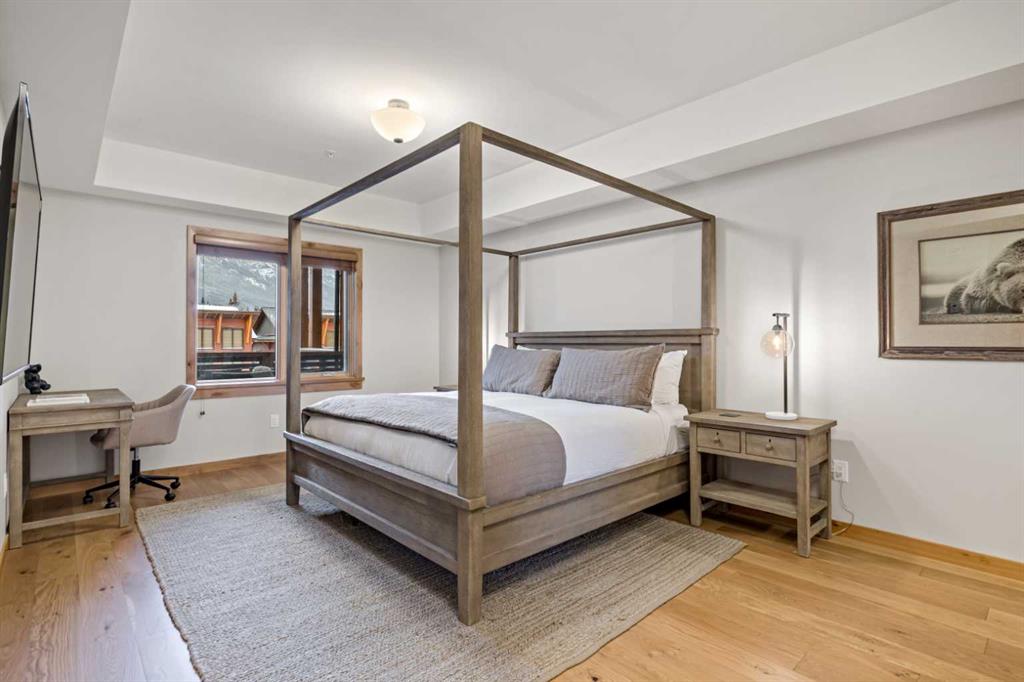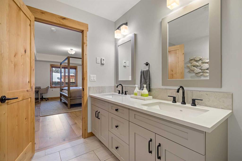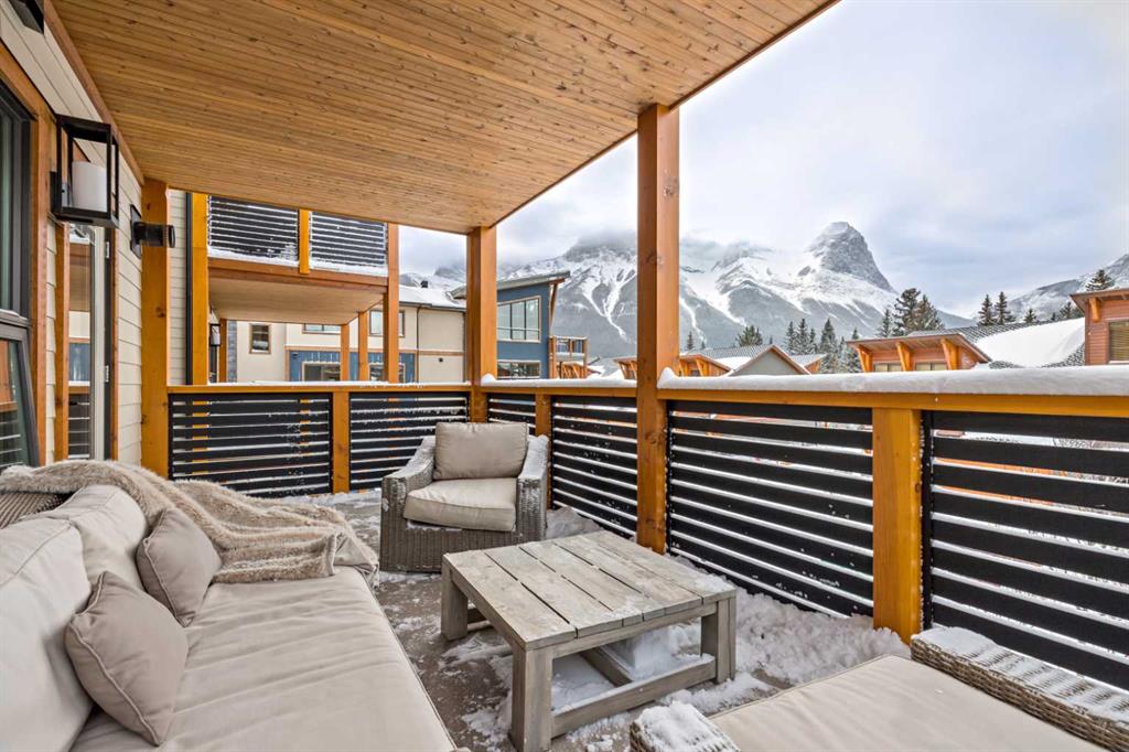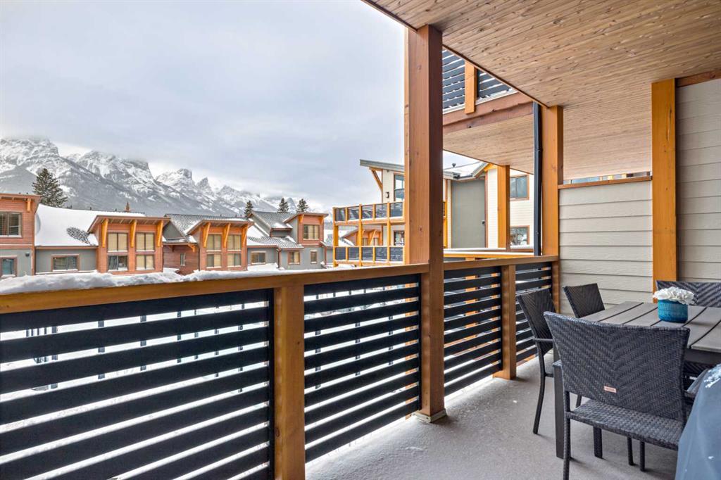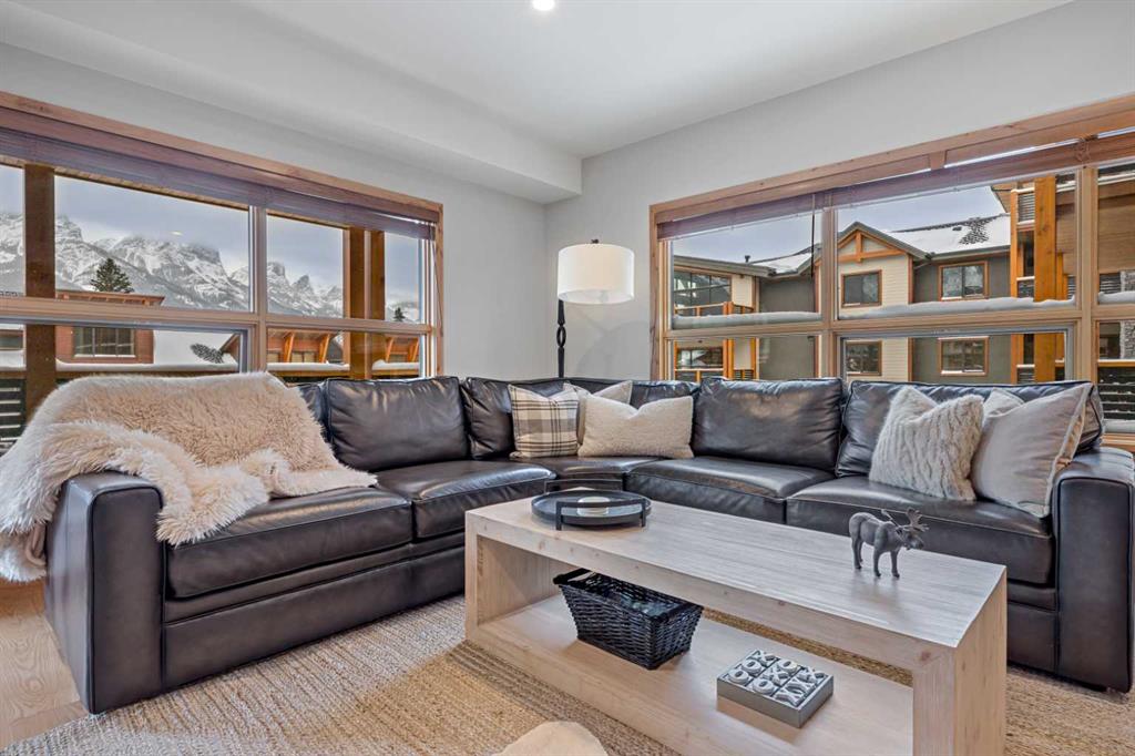 Immaculate and rare 2-bedroom plus den (functions as 3rd bedroom) luxury condominium in White Spruce Lodge in the heart of Spring Creek. This property carries the “tourist home” designation permitting short-term vacation rentals. Sold fully furnished and turn-key for immediate rentals, with many reservations already on the books for 2026! Owners and rental gusts will enjoy the open concept living with spacious living areas ideal for families or gatherings with a large gourmet kitchen complete with stainless appliances, quartz counters and plenty of cabinet space, a large dining area and living room, perfect for entertaining. Enjoy outdoor living with 2 large covered decks, facing SW/W with great views of Ha Ling Peak and the entire Rundle Range. The den has two full size built in bunk beds, perfect for the kids! The large primary bedroom features king, a walk-in closet and 5 piece ensuite. White Spruce Lodge has an inviting courtyard hot tub with fantastic views and an exercise room on the main level. White Spruce Lodge is located adjacent to the Plaza in Spring Creek with shops, Bridgette Bar restaurant and is just a short stroll to Main Street Canmore along the lovely creek paths to downtown.