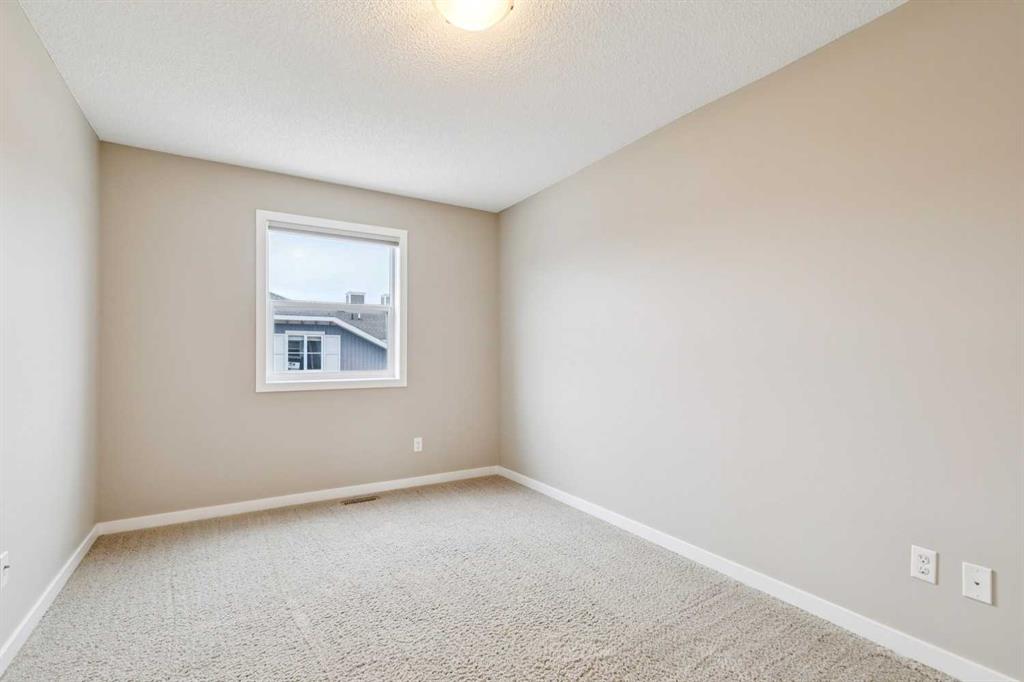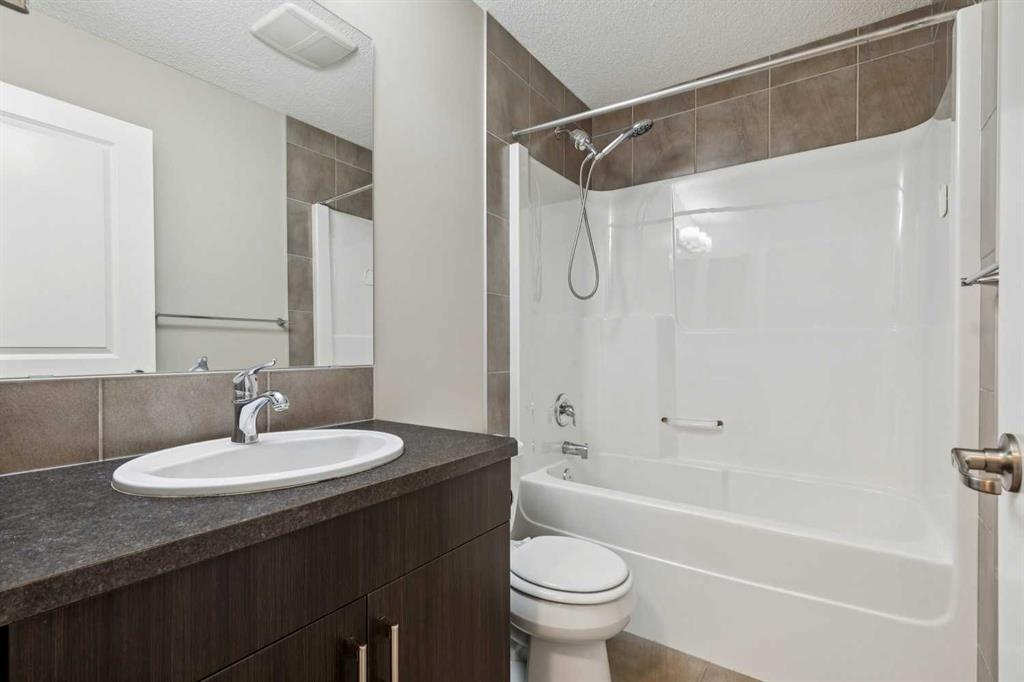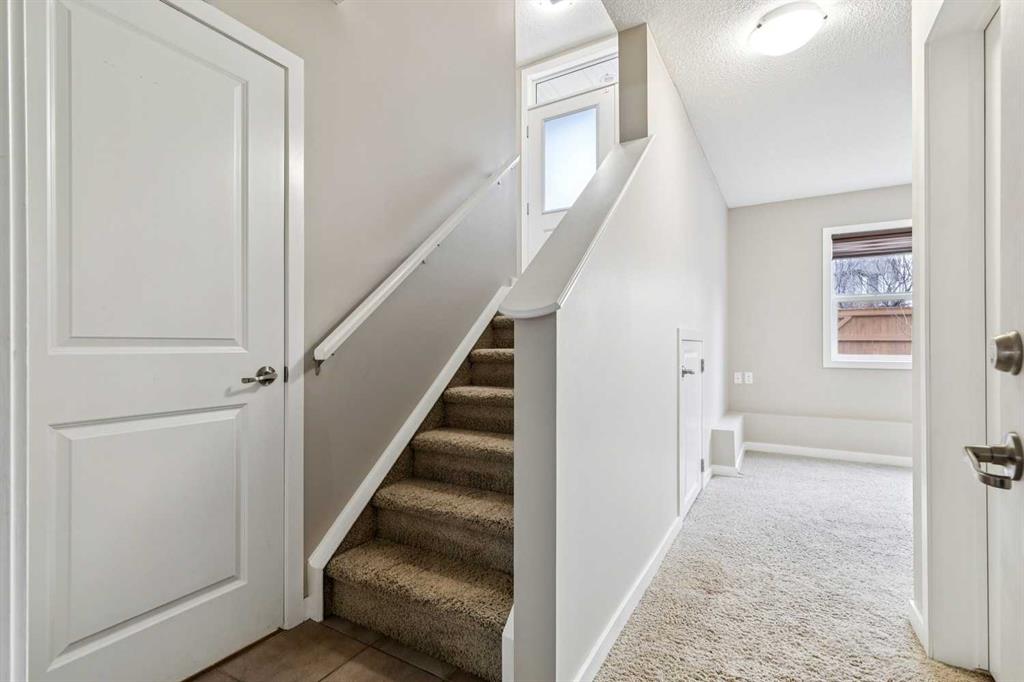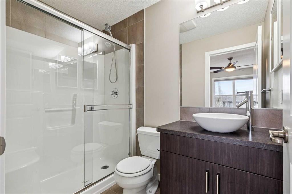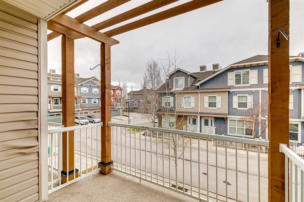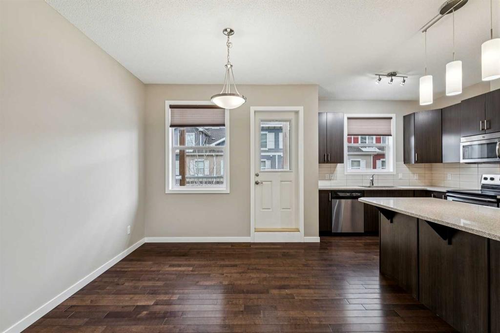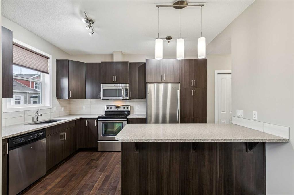 Welcome to this well-maintained and thoughtfully upgraded bareland condo townhome in the desirable Chesapeake complex of Auburn Bay. Situated in the complex directly across from Auburn Bay School, this home has easy access to nearby green space and playgrounds. It is the perfect location for a family! As you enter the unit, the entry level features a few steps downwards to the attached double garage and driveway, along with a versatile family room space and a utility room with laundry. Upstairs, the main floor showcases hardwood flooring throughout, enhanced by fresh paint and abundant natural light. The spacious living room is anchored by a large window, while the kitchen stands out with quartz countertops, extended-height cabinetry, upgraded backsplash, garburator, and ample storage. The adjacent dining area opens directly onto a balcony with a door featuring built-in mini-blinds—perfect for easy indoor-outdoor living. A convenient half bath completes this level. The upper floor offers three bedrooms, including a primary retreat with a ceiling fan, walk-in closet with a practical 4-shelf sweater tower, and a stylish 3-piece ensuite featuring a full-height tiled shower with sliding glass doors, Moen fixtures, and a vessel sink. Additional upgrades include tile flooring in bathrooms and entryways, and a recently installed high-efficiency two-stage furnace (2026) with a 10-year warranty for added peace of mind. Outside, enjoy both a welcoming front porch and a patio space for relaxing or entertaining.