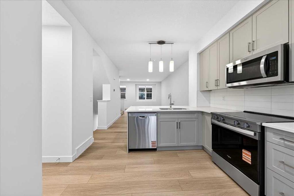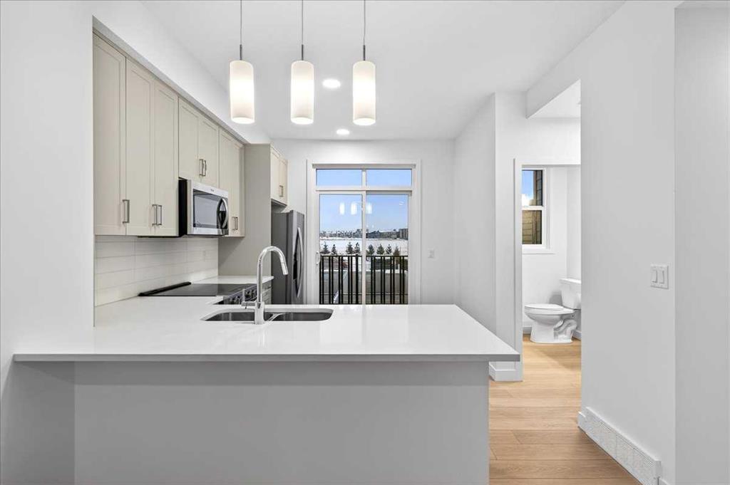 This THREE-STOREY TOWNHOME matches that momentum. The main living level (second floor) is confident and clean, anchored by a modern kitchen with QUARTZ COUNTERS, a PENINSULA BREAKFAST BAR, and pendant lighting that provides just the right finishing touch. The FULL-WIDTH PRIVATE BALCONY sits right off the kitchen—perfectly placed for morning coffee, evening decompression, or keeping an eye on the day while dinner’s on.