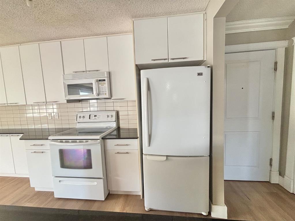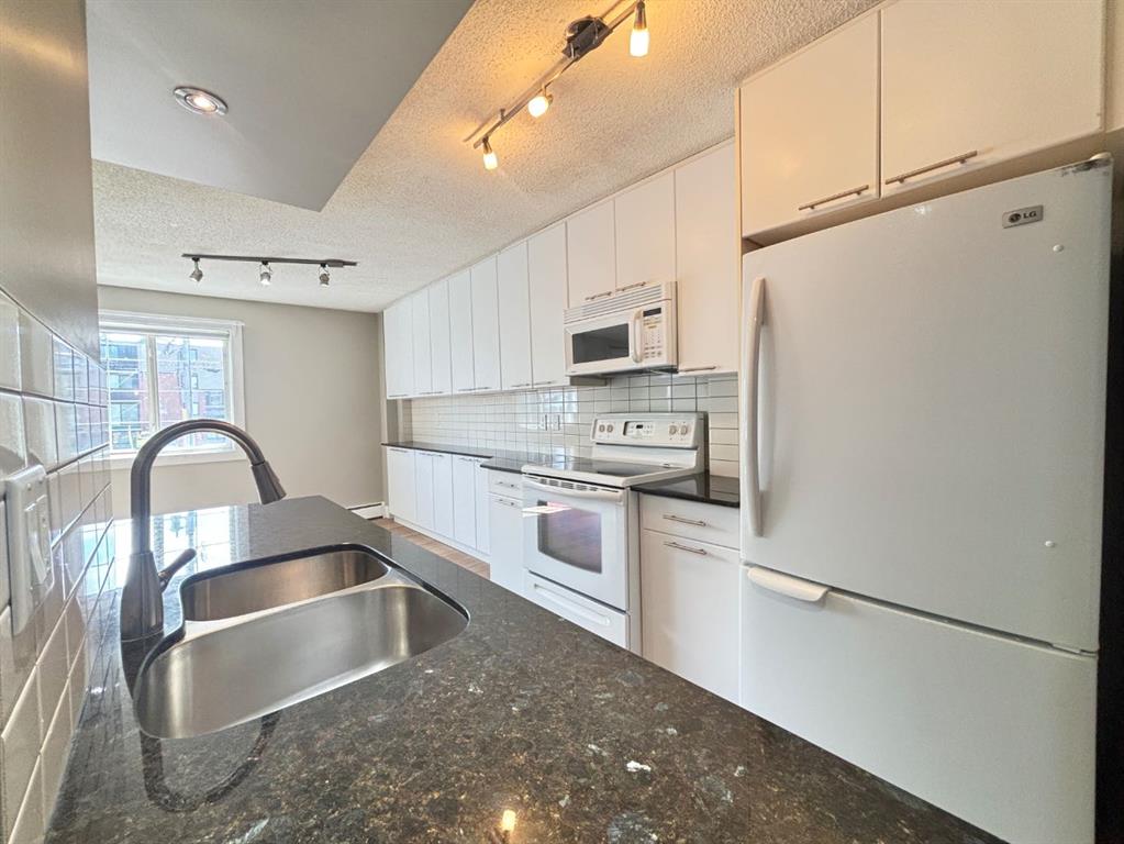 The kitchen shines with granite countertops, stylish cabinetry, and a chic tile backsplash. Both bedrooms are spacious, with easy access to a sleek 4-piece bath. You’ll also enjoy in-suite laundry with storage and an assigned covered parking stall.
