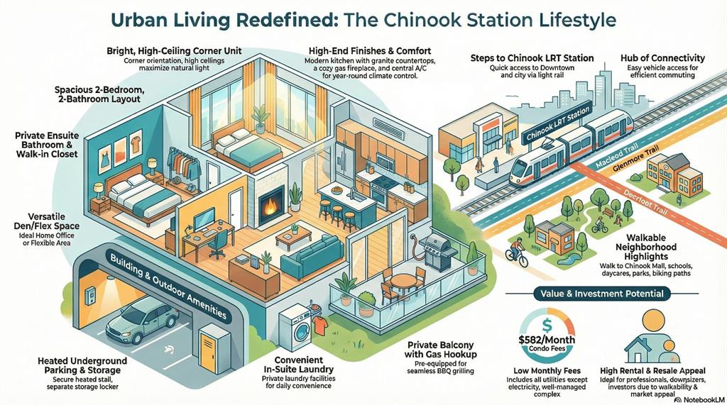 RARE Spacious 2 bedroom, 2 bathroom + Den layout *** ENSUITE bathroom and WALK-IN closet in primary bedroom *** Newer Dishwasher, Stove, and Microwave Hood Fan (Approximately 3 Years Old) *** BRIGHT corner unit with natural light *** HIGH CEILINGS *** Gas fireplace *** Central A/C *** GRANITE countertops *** In-suite laundry *** Balcony with gas BBQ hookup *** HEATED UNDERGROUND PARKING and SEPARATE STORAGE Locker, Both Forming Part of the Condo Unit Title. *** Low Condo Fees – $582/month *** All UTILITIES INCLUDED Except Electricity *** Well-managed and well maintained complex *** Steps to CHINOOK LRT station *** Quick Access to Downtown *** Easy Access to Macleod Trail, Glenmore Trail, and Deerfoot Trail *** Walking distance to Chinook mall *** Nearby parks and green spaces *** Walking and biking paths *** Close to SCHOOLS and DAYCARES *** Excellent walkability and transit access *** Strong long-term rental appeal
