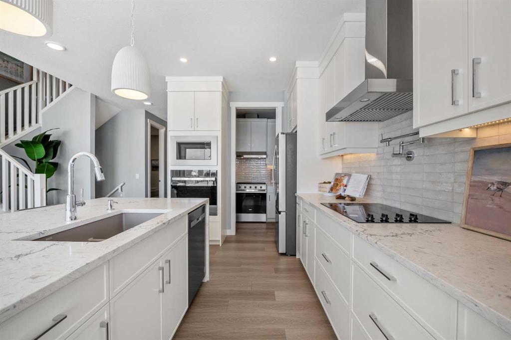The main floor features a bright and spacious open-concept layout enhanced by large windows that allow natural light to fill the home. The chef-inspired kitchen showcases 42” upper cabinetry with crown moulding, quartz countertops, a central island with eating bar, and modern finishes that create both style and practicality. A separate spice kitchen offers additional preparation space, ideal for maintaining a clean and organized main kitchen. The dining and living areas connect seamlessly, while the electric fireplace in the great room creates a warm and inviting focal point. This level also includes a main floor bedroom and full bathroom, perfect for guests or multigenerational living, along with a versatile flex room that can function as a home office, study, or additional sitting area. Step outside to the rear deck with BBQ gas line, ideal for outdoor entertaining.