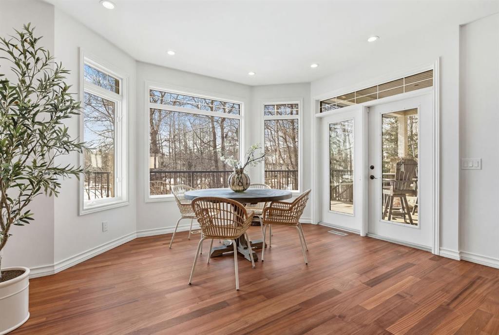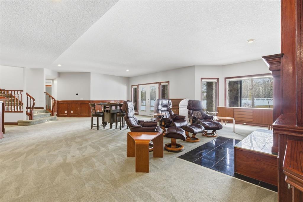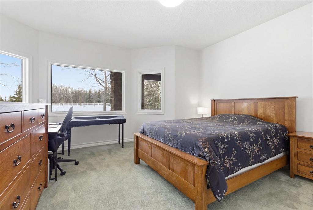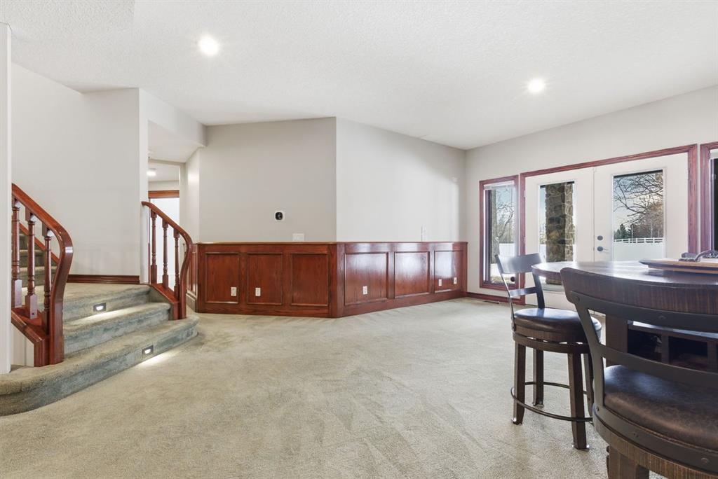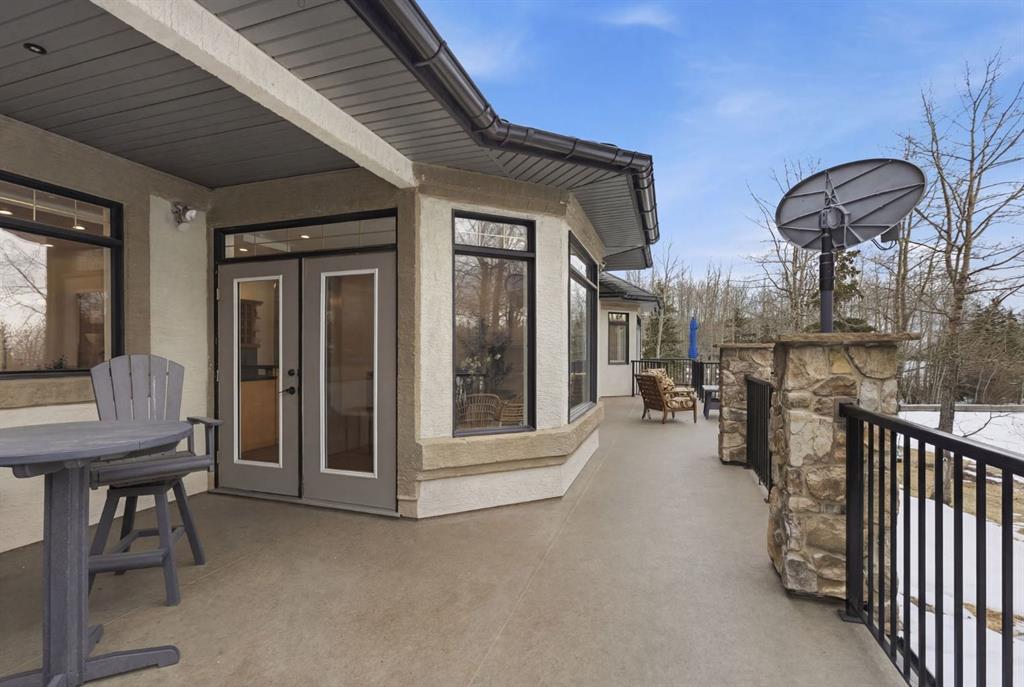 Inside, the home is bright in a way that changes the whole experience of acreage living. Windows in nearly every direction keep the outdoors present, refinished African walnut hardwood brings warmth underfoot, and the more traditional layout gives the home a sense of comfort and structure that is becoming harder to find. The rebuilt southwest-facing deck is a major part of this acreage’s way of living. Engineered with substantial beams and finished with heavy-weight UV-stabilized vinyl decking, it is a high-end outdoor space built to be used and enjoyed. Accordion doors off the living room open fully to the deck, allowing the whole main floor to breathe.