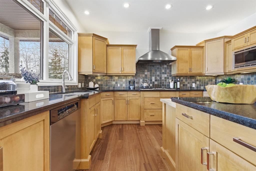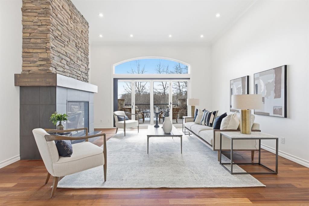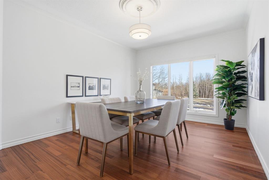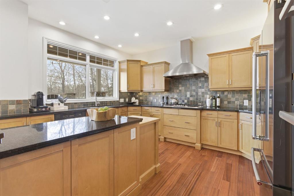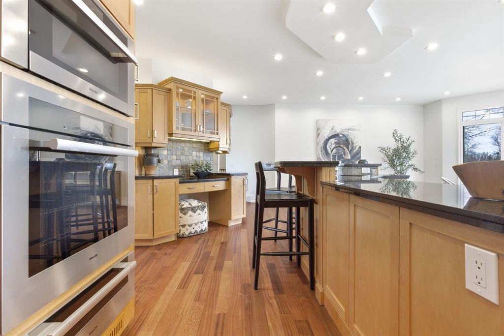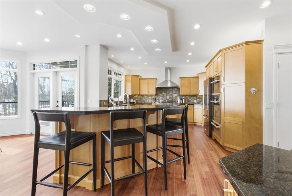 Inside, the home is bright in a way that changes the whole experience of acreage living. Windows in nearly every direction keep the outdoors present, refinished African walnut hardwood brings warmth underfoot, and the more traditional layout gives the home a sense of comfort and structure that is becoming harder to find. The rebuilt southwest-facing deck is a major part of this acreage’s way of living. Engineered with substantial beams and finished with heavy-weight UV-stabilized vinyl decking, it is a high-end outdoor space built to be used and enjoyed. Accordion doors off the living room open fully to the deck, allowing the whole main floor to breathe.