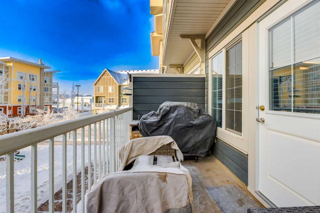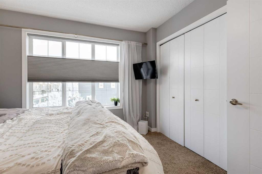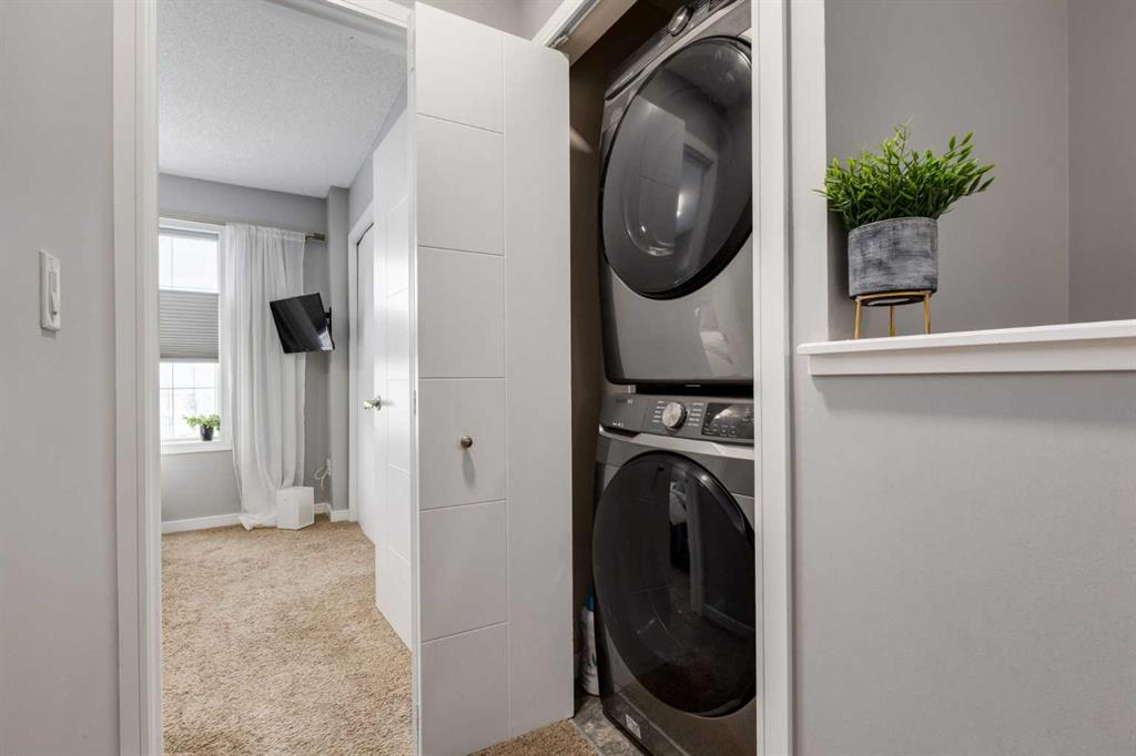 Some other value added updates include; heated tile floor at the entry, new furnace (2025), Tesla charge station, new Samsung washer & dryer, top-down/bottom-up window shades, added plugs in kitchen island, and a heater in the garage! The kitchen showcases sleek cabinetry with a wood grain effect in tones of dark wood and greys, perfectly accented by a mosaic tiled backsplash. Stainless steel appliances, granite countertops, and an island with seating space add both functionality and style to this culinary haven. Adjacent to the kitchen, the generous dining area opens to a balcony equipped with a gas line for BBQs, making it an ideal spot for entertaining guests. A cozy living room is a must and the included surround sound speakers will be an added bonus. Additionally, a powder room on the main floor with updated tile flooring caters to your visitors. The upper level features a primary bedroom complete with a four-piece en-suite bathroom and a spacious walk-in closet, with natural light so you’ll know if your top and bottoms actually match! This level also includes two additional bedrooms, a family bathroom, and a convenient laundry area. The air conditioning and a tandem heated garage with ample space for two vehicles under covered with a 3rd in the driveway and additional storage will be major checkmarks for your lifestyle. The visitor parking stalls are right across the street from your driveway, so your guests won’t mind coming over at all. Additionally, the location is prime and is just steps away from both Public and Catholic schools and within walking distance to the lake, which offers year-round recreational activities for residents. The amenities at Westman Village, Mahogany Village, Auburn Station, and Seton are easily accessible, as well as major routes like Stoney and Deerfoot trails, making this townhouse a perfect blend of convenience and comfort. Don’t hesitate to book a showing today, we’re happy to accommodate!