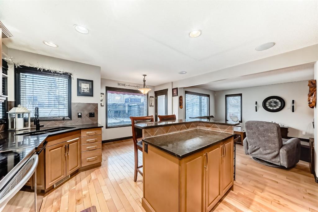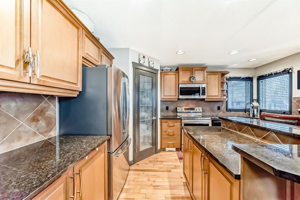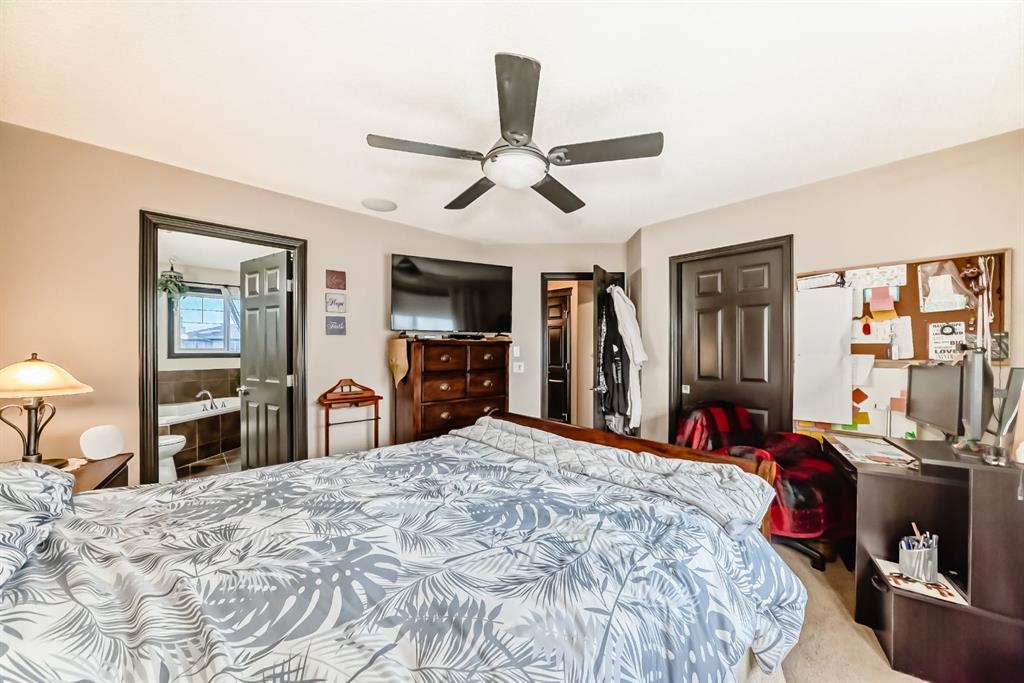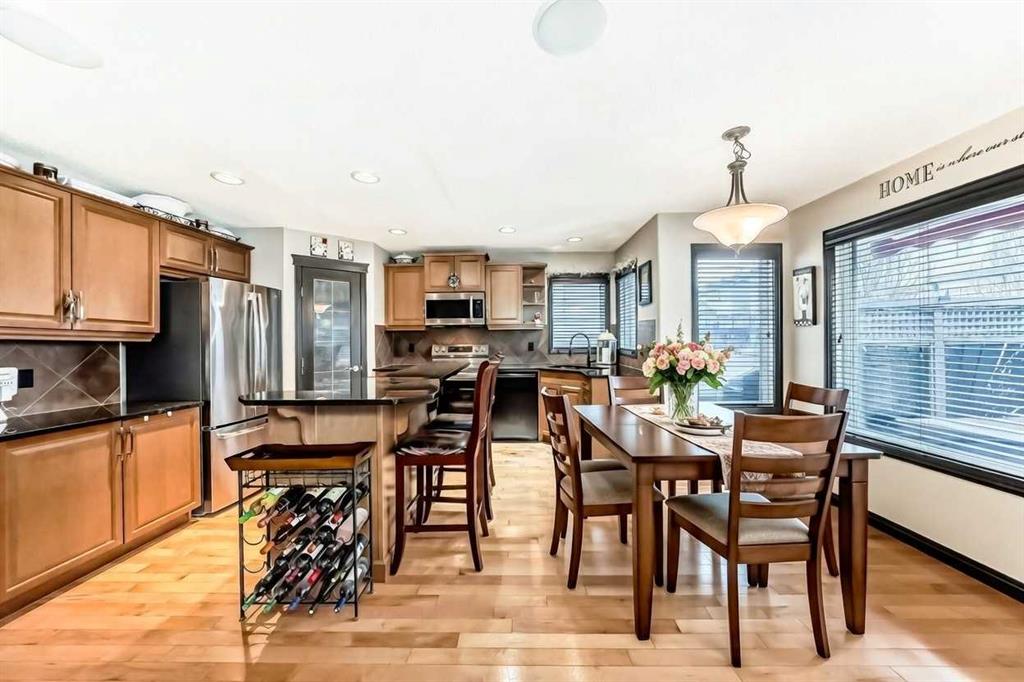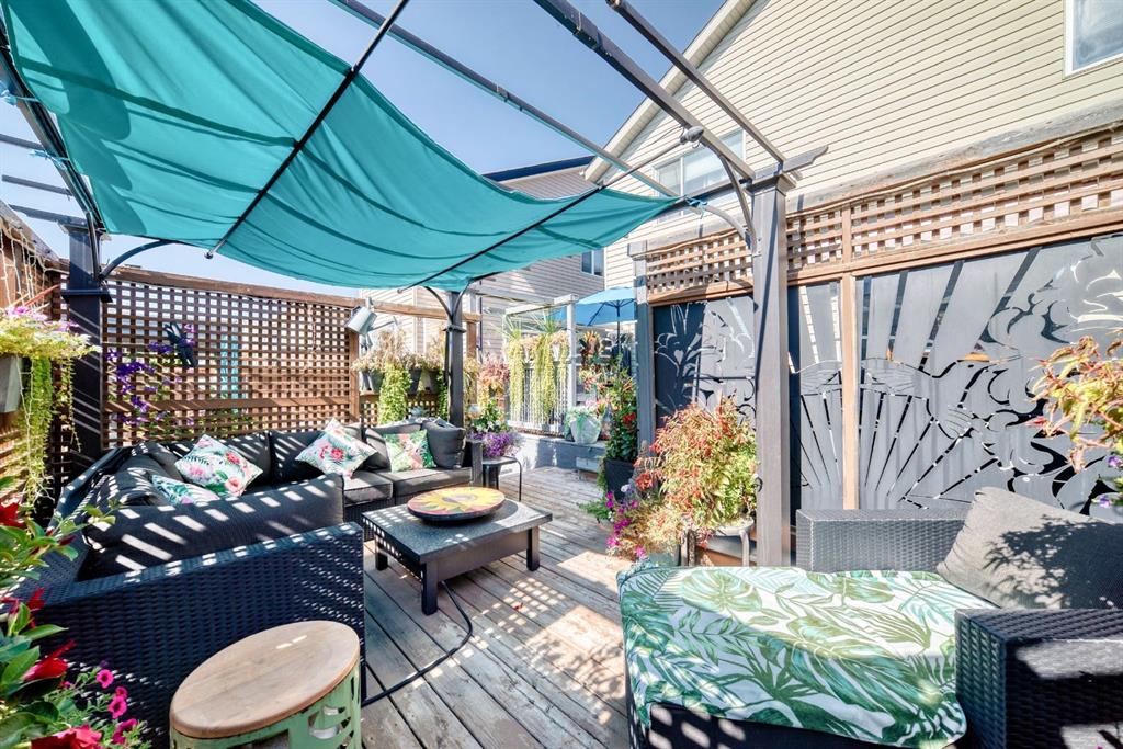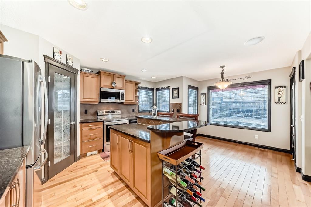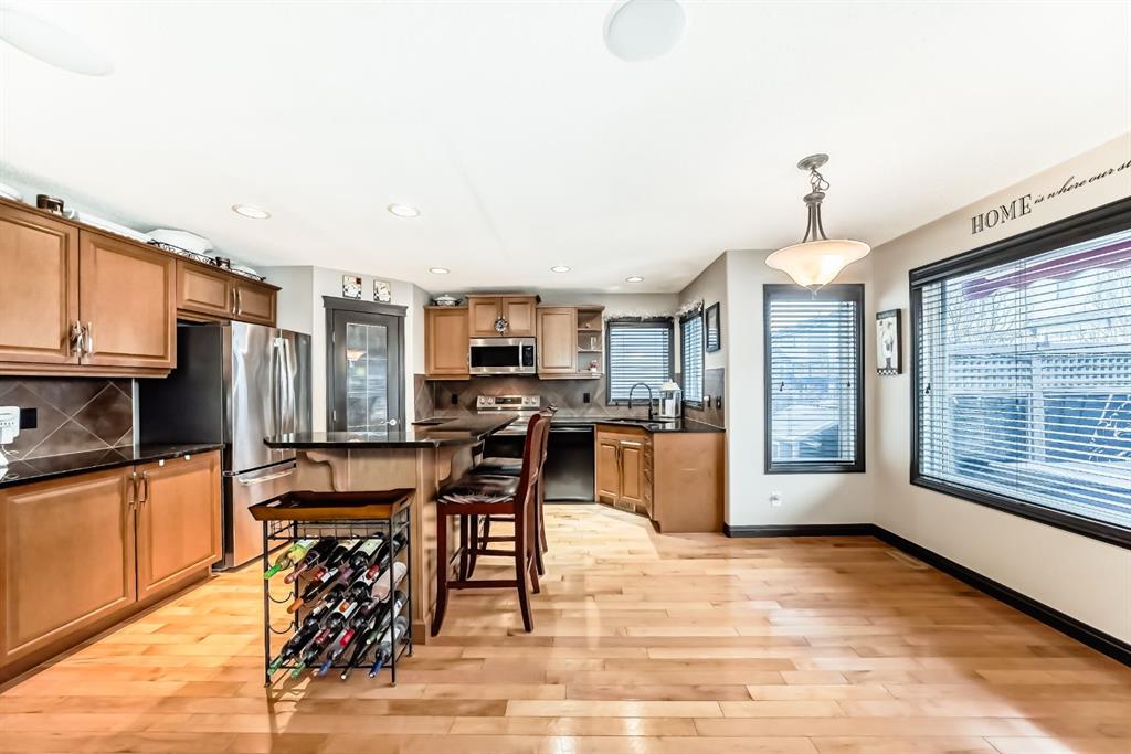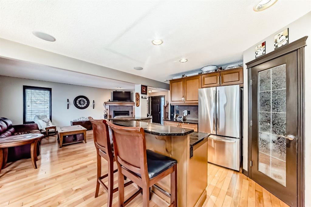 Welcome to your new home at 2071 Sagewood Rise in the family friendly community of Sagewood. This fully finished, meticulously maintained 2-storey residence offers exceptional curb appeal with a beautifully manicured front yard featuring lush shrubs, neat landscaping, and thoughtful details that welcome you home every day. Step inside through the tiled entry foyer, which flows seamlessly into an open and inviting main floor plan adorned with genuine hardwood flooring throughout. The spacious living room is a cozy focal point, highlighted by a stylish corner fireplace with an elegant mantle and tile surround, complemented by in-ceiling speakers for effortless entertainment. Large, ample windows bathe the space in natural light, creating a bright and airy atmosphere. The heart of the home is the upgraded kitchen, featuring newer SS appliances, granite countertops, an undermount granite sink, and abundant cabinetry with generous storage. A convenient corner pantry keeps everything organized, while the spacious dining area overlooks the stunning south-facing rear yard—perfect for family meals or hosting gatherings with views of your private outdoor oasis. Upstairs, the layout provides excellent separation for privacy, featuring a large bonus room ideal for movie nights or relaxation, complete with in-ceiling speakers, abundant natural light from numerous windows, and a striking feature wall. The primary bedroom is a true retreat, offering a 4pc ensuite bathroom with a large corner soaker tub, a standalone shower, and a generous walk-in closet. Two additional well-sized bedrooms and a full 4pc main bathroom complete this level. The fully developed basement serves as the ultimate “man cave” or family entertainment space, including a large living area anchored by another corner fireplace, two additional bedrooms for extended family, guests, or a home office setup, and a convenient 3-piece bathroom. Outside, the south-facing backyard is an absolute paradise designed for year-round enjoyment and privacy. Relax in the nearly new (2-year-old) Master Spa hot tub, fully enclosed for seclusion. A secondary private lounge area beneath the pergola offers another tranquil retreat. The yard is beautifully landscaped with numerous perennials and mature shrubs, a dedicated dog run for your furry friends, and a handy storage shed. The attached garage is a standout feature, complete with a built-in heater for year-round comfort, plus numerous wood shelving units—including upper shelving designed for larger items—providing excellent organized storage for tools, seasonal gear, sports equipment, and more. Additional premium upgrades throughout the home include central AC and a central vacuum system for added comfort and convenience. Ideally located near C.W. Perry School, this home provides easy access to top-rated education, parks, shopping, and all the amenities Airdrie has to offer, while still enjoying a peaceful, family-friendly neighborhood.