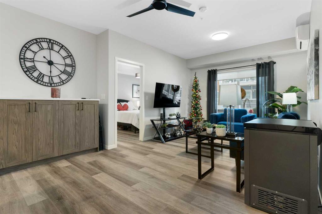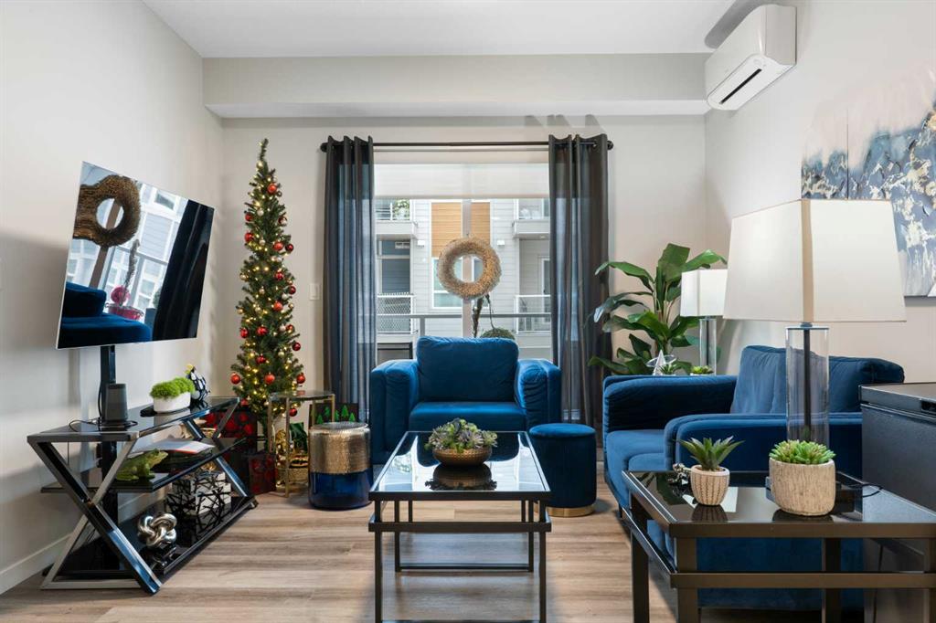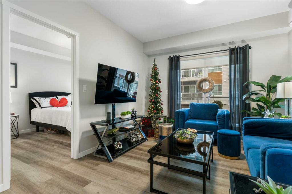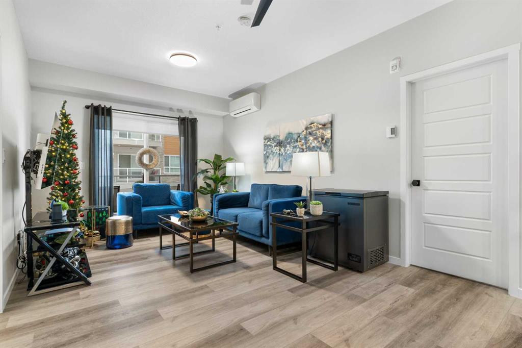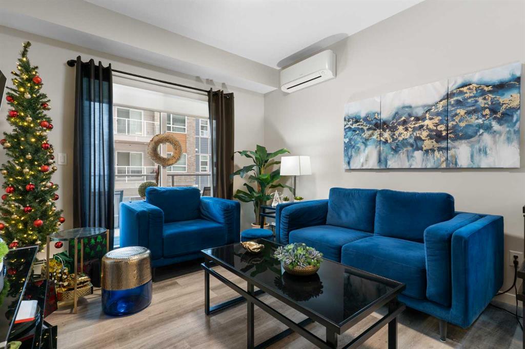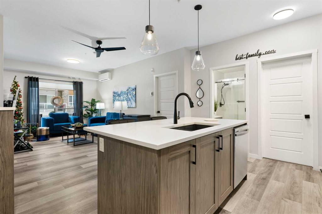 Step into comfort, style, and elevated living in this beautiful 2-bed, 2-bath condo in The Rise at The Parks of Harvest Hills. Built by Cedarglen Homes, and lovingly maintained by its original owners, this home stands out with premium upgrades and central AC for year-round comfort. From the moment you arrive, pride of ownership is evident. The welcoming entry leads into a bright, modern kitchen that makes both everyday cooking and hosting feel special. Featuring a large island with seating, quartz countertops, stainless steel appliances, and a stylish chevron tile backsplash that create a high-end look and feel. Plenty of cabinetry and a pantry give you the storage every homeowner wants without sacrificing clean, contemporary design. Luxury vinyl plank flooring runs throughout the main living spaces for durability and a modern finish. In the dining area, the builder-upgraded built-in adds character and practical storage, making entertaining effortless. The spacious living room has the perfect layout for relaxing, movie nights, or hosting game night with friends. Slide open the patio doors to your oversized private balcony. With room to lounge or dine, built-in exterior lighting, and a BBQ gas line ready to go, this becomes an outdoor extension of your home that you will love from morning coffee to summer evenings. The primary bedroom is tucked away on its own side of the home for privacy and peace. There is plenty of space for a king-sized bed and additional furniture, while the walk-in closet features custom built-ins designed to keep life organized. The 4-piece ensuite is bright, fresh, and calming. It feels like your own personal retreat at the end of a long day. Across the unit, the second bedroom offers flexibility for guests, a roommate, a nursery, or the perfect work-from-home office. The adjacent 3-piece bathroom includes a full-size walk-in shower with upgraded fixtures for a sleek and modern finish. Back near the entry, the laundry room truly sets this home apart. Builder-installed upper cabinets and extra shelving ensure everything has a place and stays clutter-free. A luxury rarely found in condo living. This space also doubles as your front closet with plenty of room for shoes and jackets. Your titled underground parking stall is conveniently just steps from the elevator, making grocery runs effortless. An assigned storage locker and secure bike storage are also included on the same lower level, giving you even more room for the things you love. You are perfectly positioned here. Minutes from the airport, close to Deerfoot and Stoney Trail, and a short stroll to restaurants, local shops, Landmark Cinemas, parks, tennis courts, and schools. Convenience and comfort come together seamlessly. Whether you are downsizing, investing, or purchasing your first home, this upgraded condo offers a level of quality and lifestyle that truly stands out.